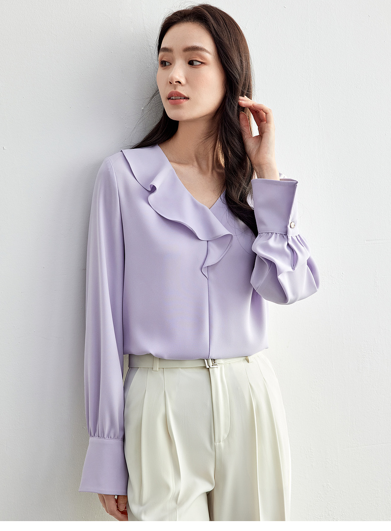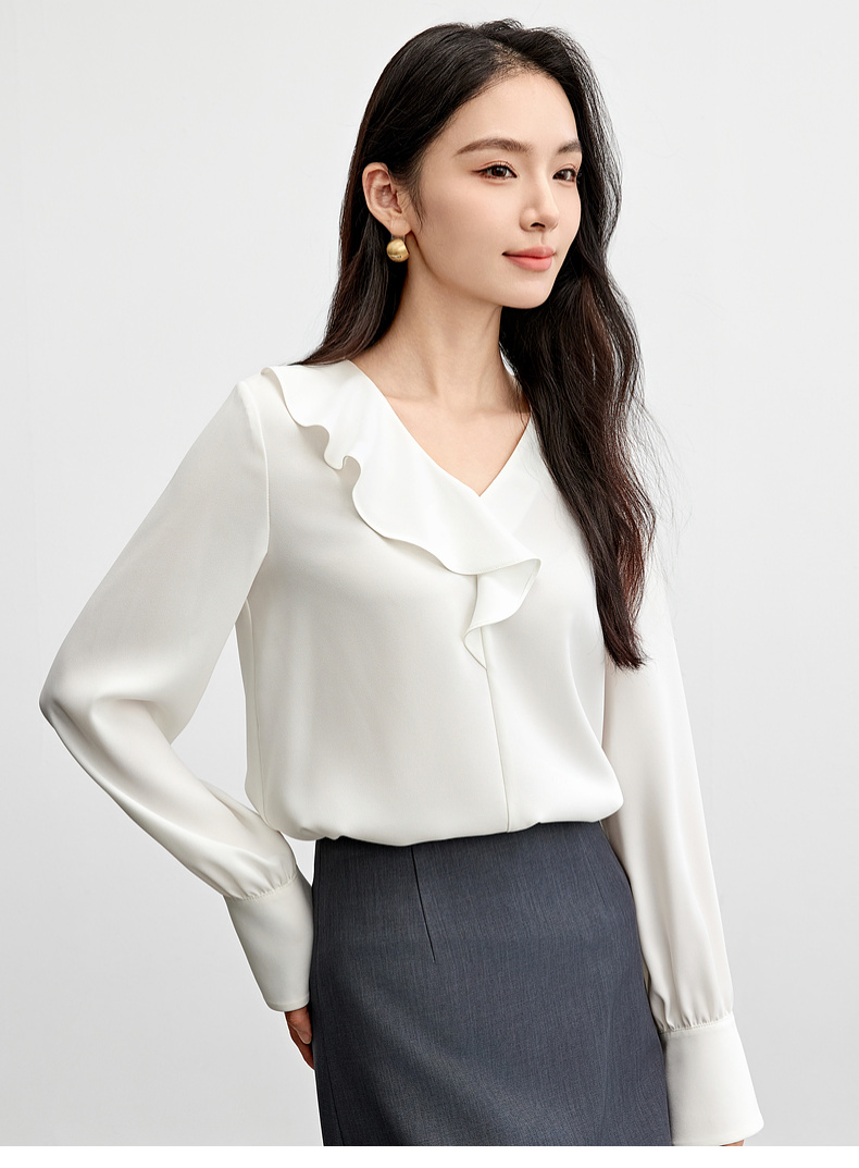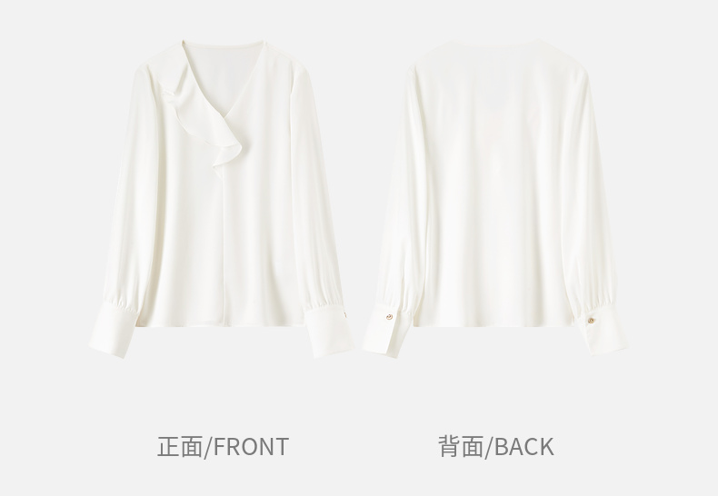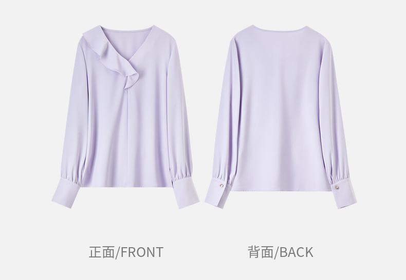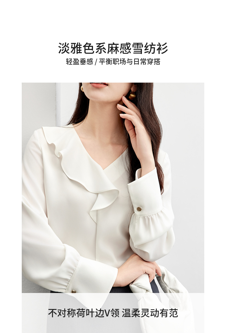 【内购】【麻感雪纺衫】通勤优雅不对称荷叶边V领金属异形扣清爽垂感上衣-153VA3255X