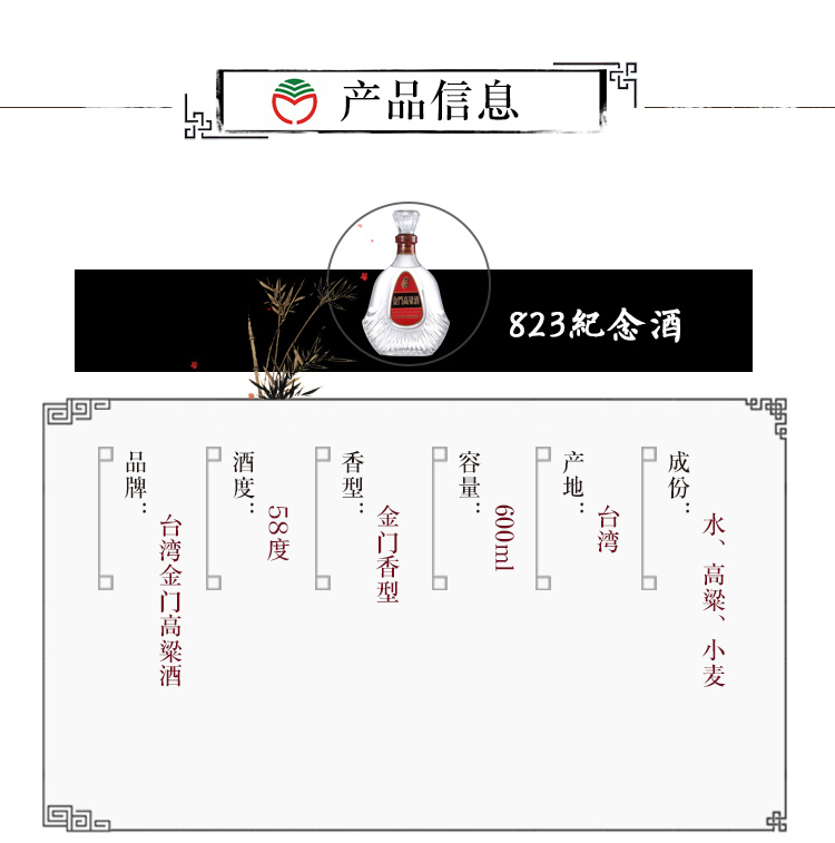 中国台湾金门高粱酒823纯粮58度600ml/010628 纯粮酿造古法传承