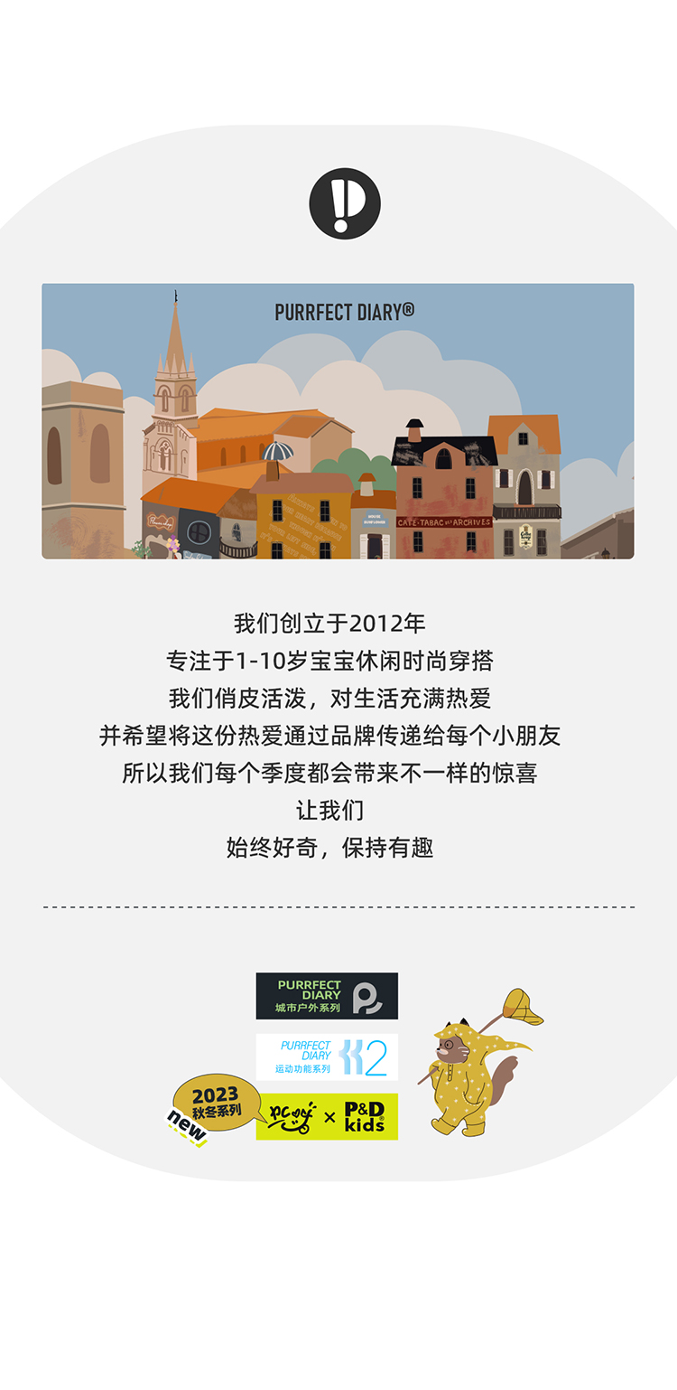- Purrfect-Diary专注于贴近自然随性的穿着概念,轻奢平价的童装文化传播,在产品设计上更加注重婴童穿着的舒适性、安全性、更出众的国际化品牌,将欧美的育婴文化在中国进行深入的传播与推广。