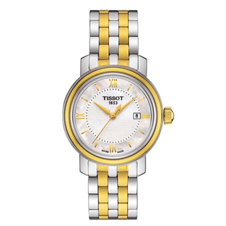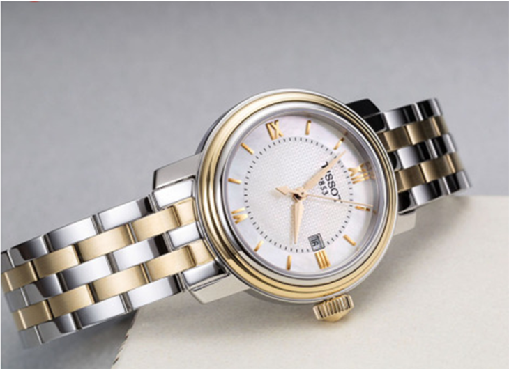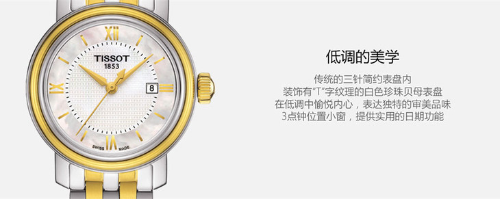 镜面 材质 | 蓝宝石水晶玻璃 | 表盘 | 精钢PVD镀金表壳 T字纹理白色珍珠贝母表盘 大三针 日期显示 罗马数字时标 不透底 |