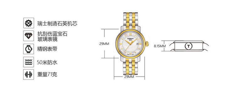 | 防水 | 50 m | 表带 | 精钢PVD镀金间金表链 按钮式蝴蝶扣 |