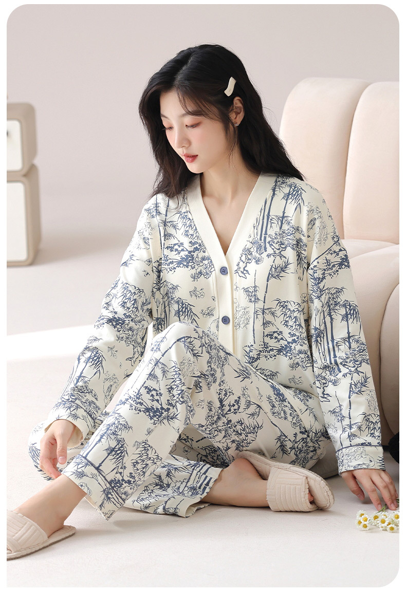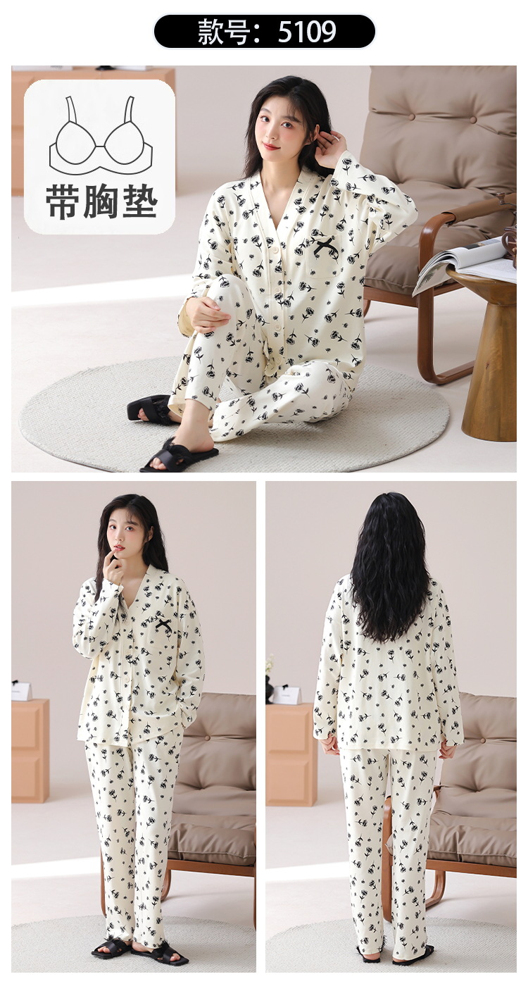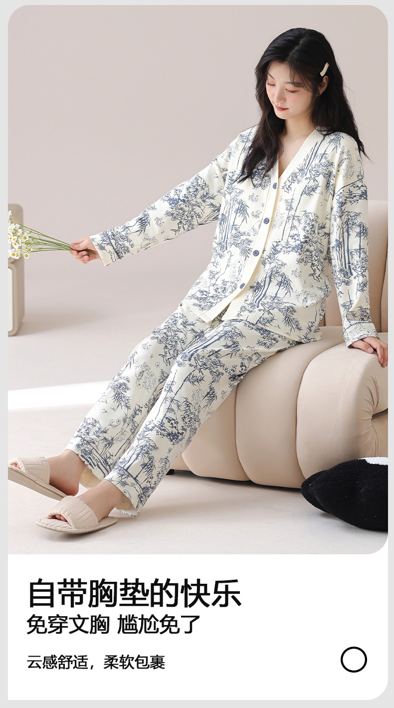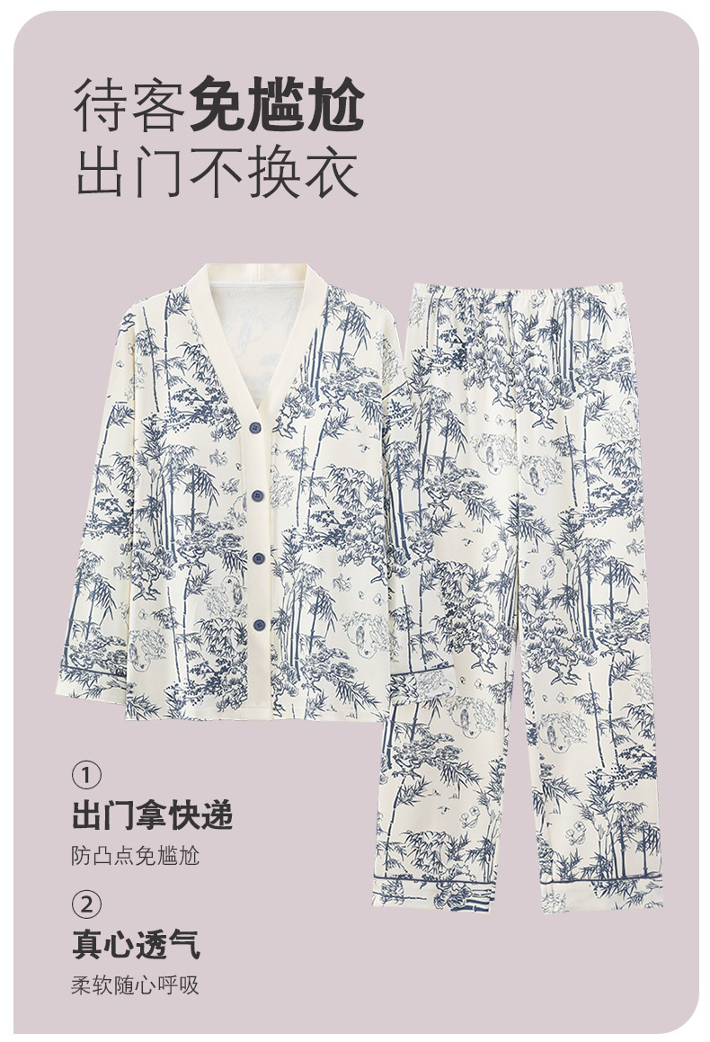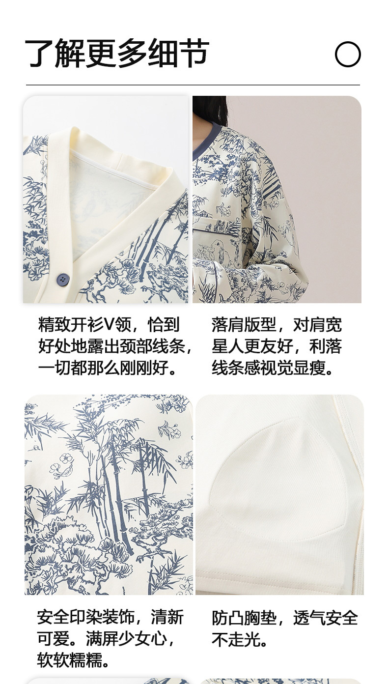 【新国风❗️V领开衫家居服套装】自带胸垫,罩杯一体,免穿文胸内衣!春秋新款和服睡衣女长袖长裤可外穿