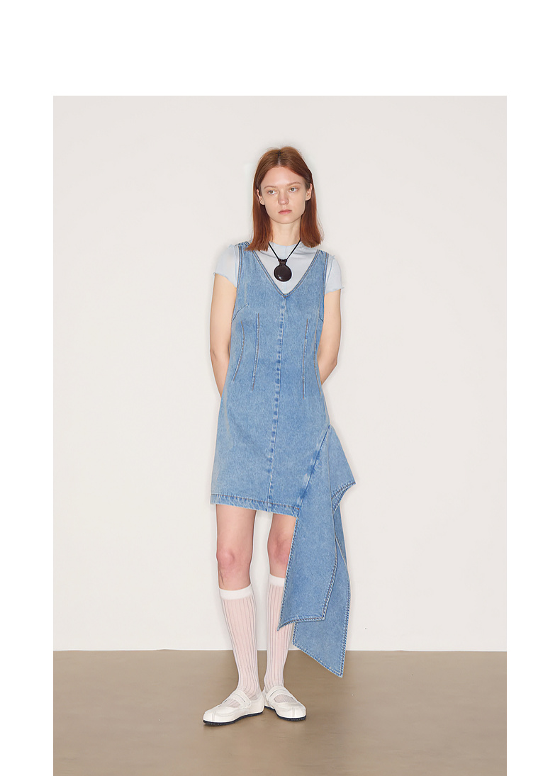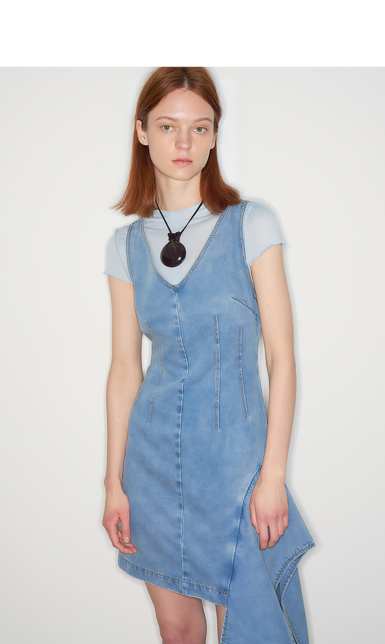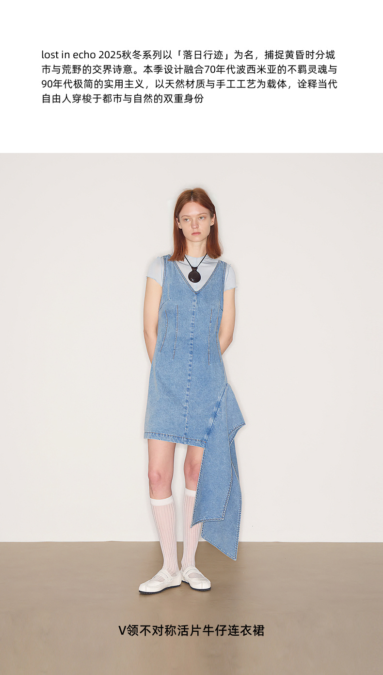 lost in echo2025秋冬新款V领个性不对称活片收腰修身牛仔连衣裙