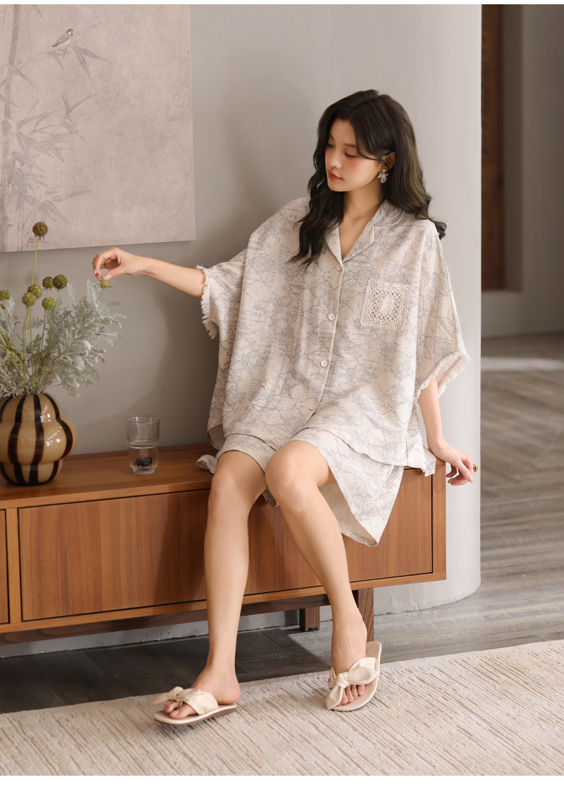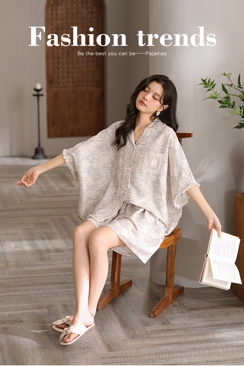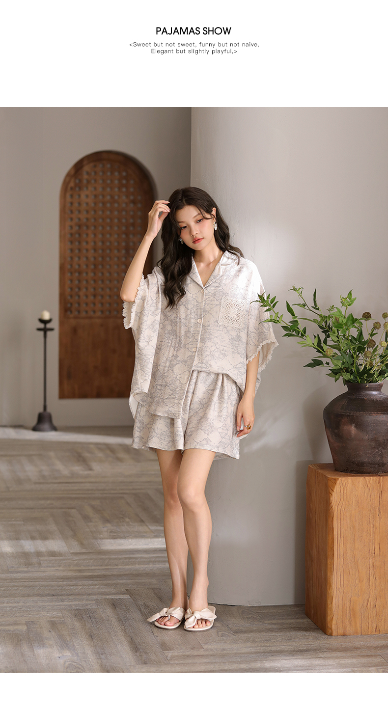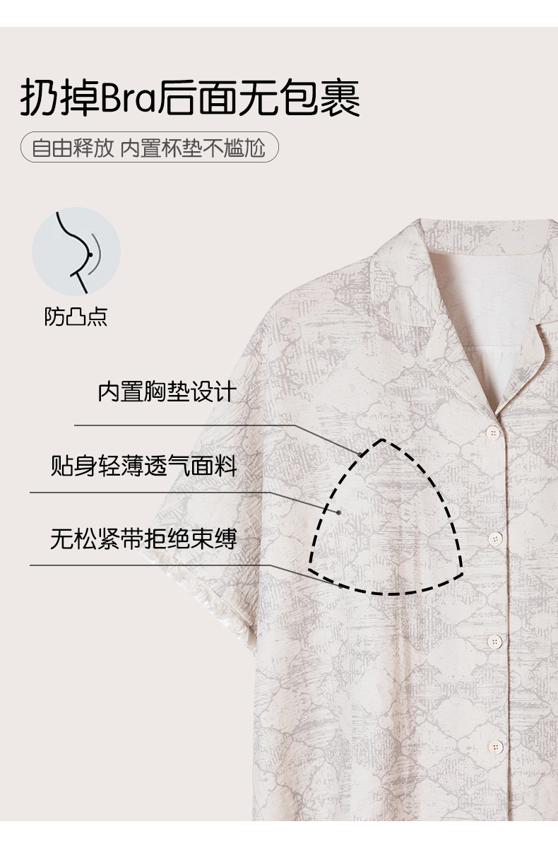 可人儿小众设计泡泡绵女士带胸垫睡衣夏季短袖可外出家居服三件套