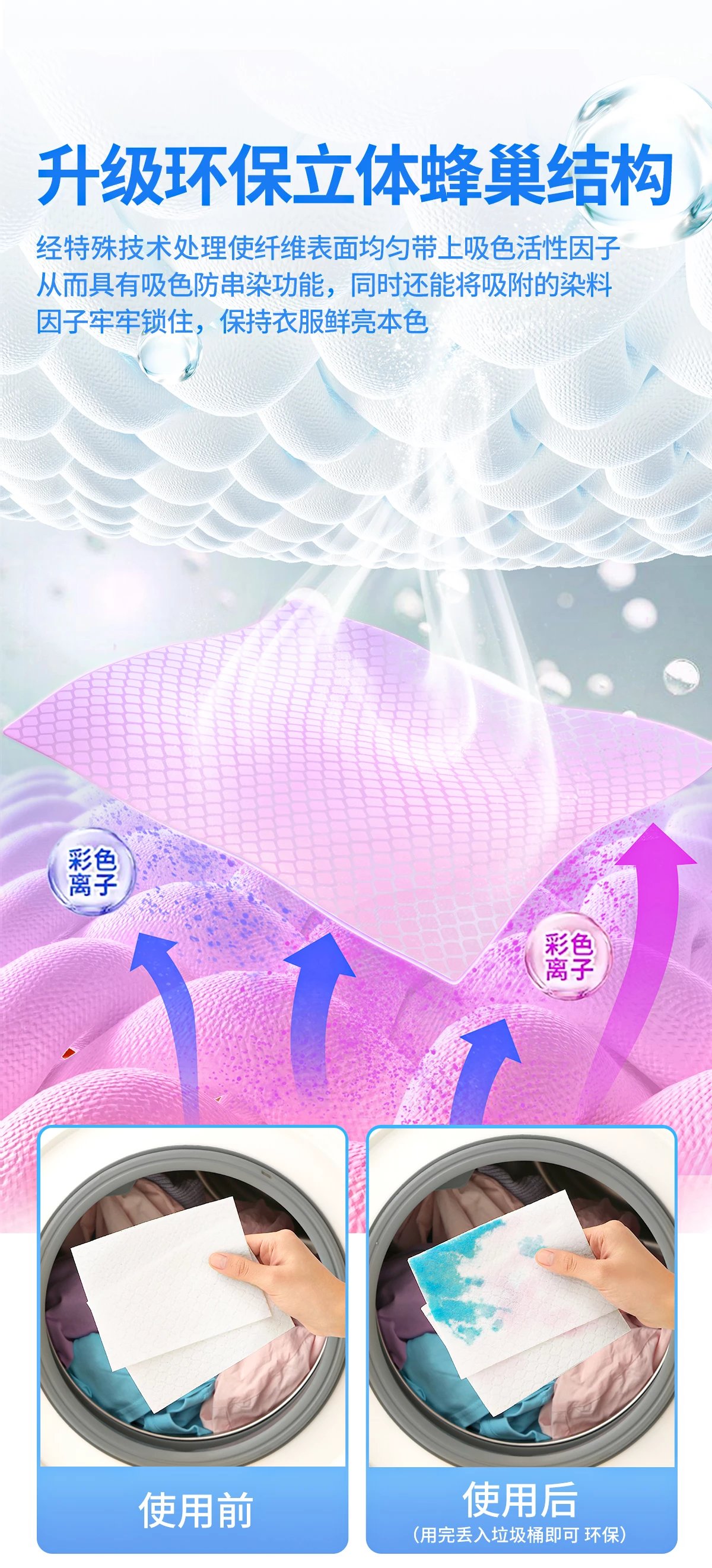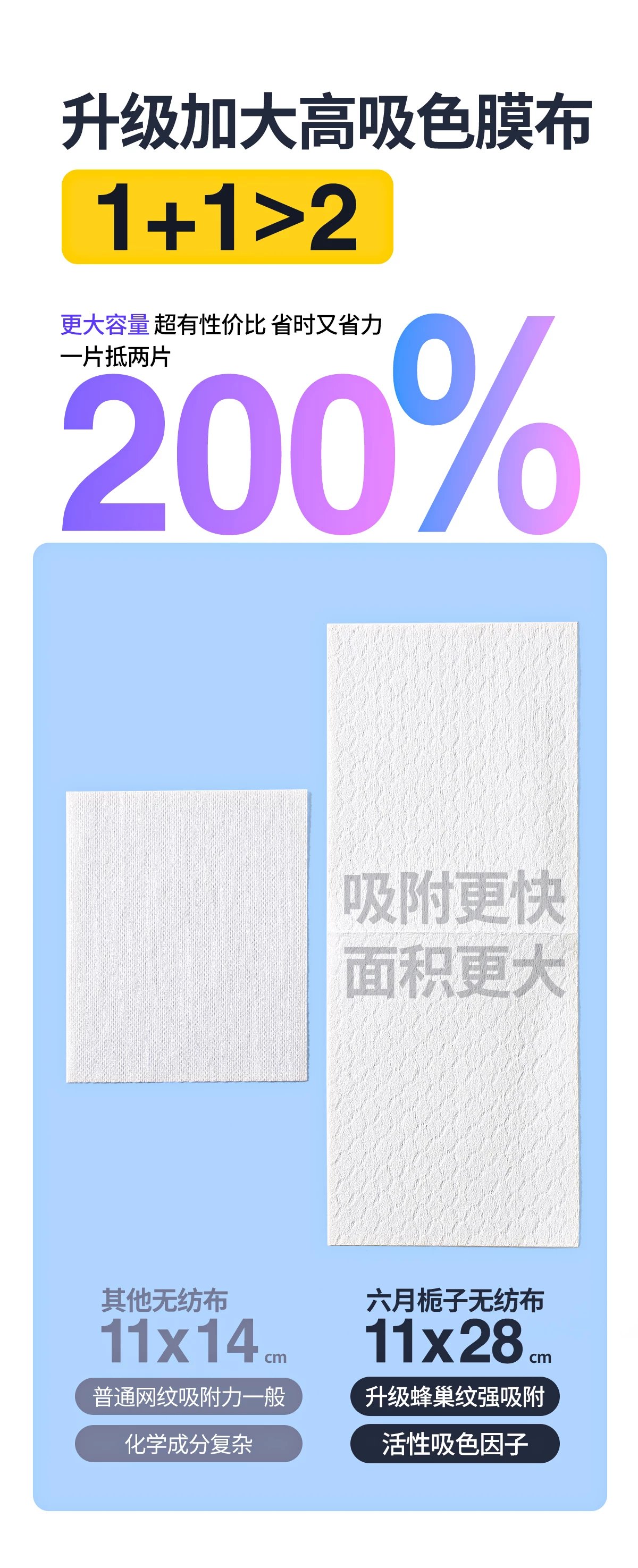 市面上销售的吸色片多为网孔纹理, 六月栀子升级为立体蜂巢纹理结构, 使纤维表面均匀带上吸色活性因子, 高效吸色同时还能将吸附的染料牢牢锁住, 保持衣服鲜亮本色, 相较11*14cm网纹升级加大至11*28cm高吸色膜布, 面积更大,吸附更快!