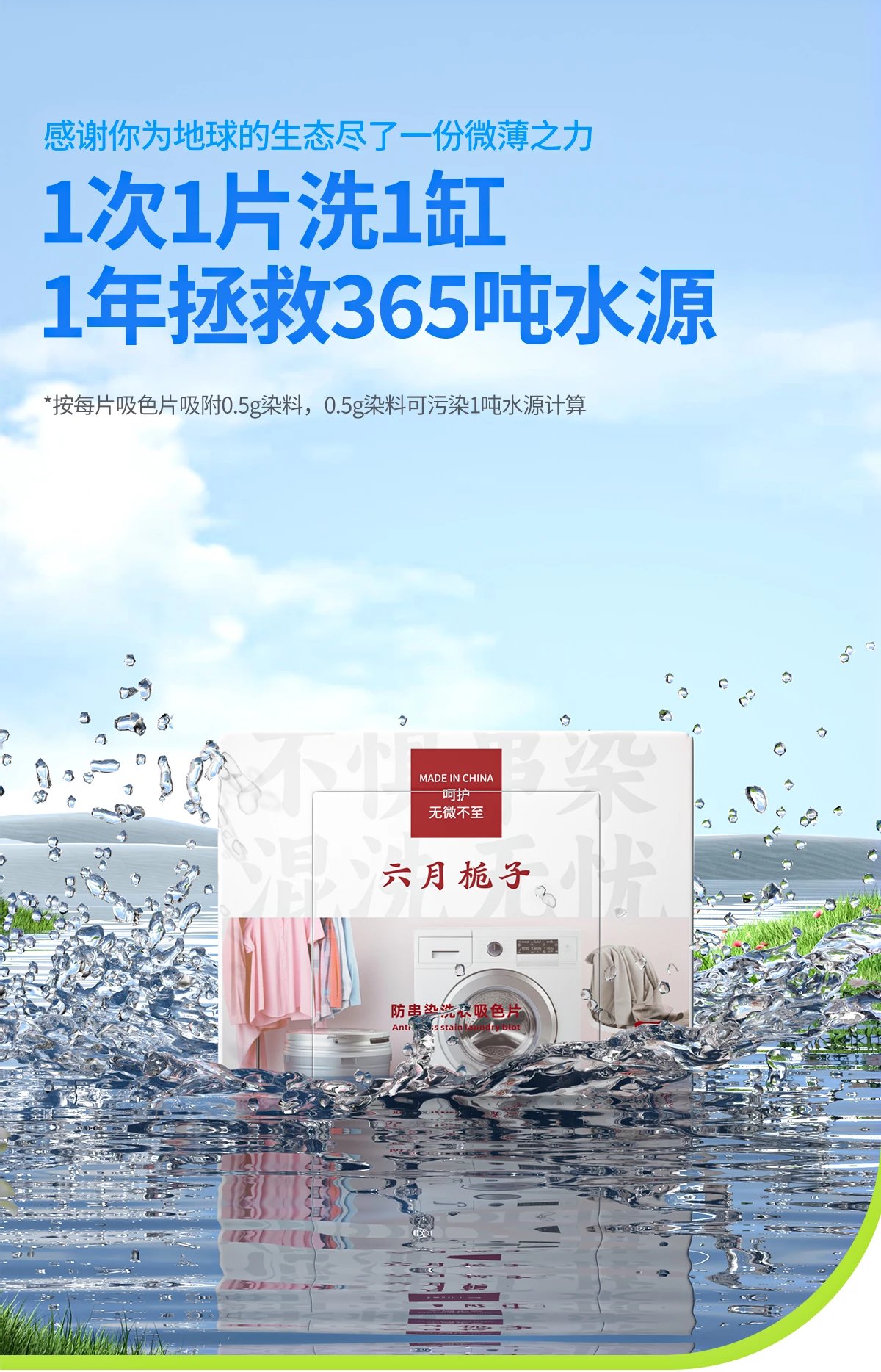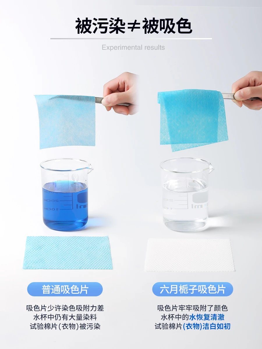 山姆超市、盒马、立白、辛选等众多知名品牌同款吸色片工厂,吸色片行业标准牵头起草单位 下单即送吸色试验三件套(活性染料、测试空瓶、吸色片行业标准测试说明书),1分钟内高效吸色,不惧测试,欢迎对比,不服来战!!!吸色效果直观展现,真实力不怕测! 升级立体蜂巢结构,加大至11*28cm高吸色膜布,高效吸色活性因子,快速吸色,牢牢锁色 吸附染料,减少染料污染水源,保护地球水源生态,我们在行动!