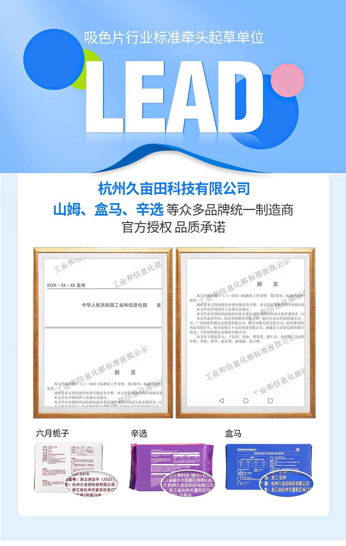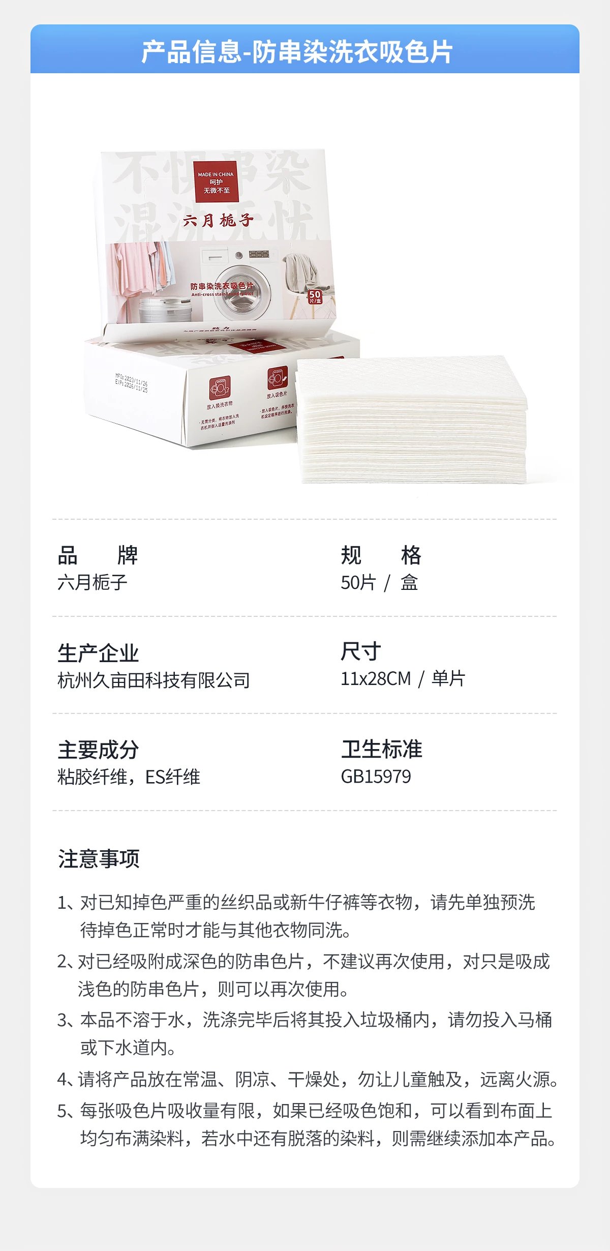 市面上防串染吸色片销售品牌众多, 到底哪款吸色片真有效果? 会不会智商税?会不会成为无良商家虚假宣传收割的韭菜? 究竟该如何挑选才能避免入坑? 山姆超市、盒马、立白、辛选等众多知名品牌帮您选择, 都知道山姆超市选品标准极为严苛, 无效产品根本不可能进入, 代工厂选择尤为慎重,经过反复调研、考察、测试、对比最终才能被选上。 六月栀子防串染洗衣吸色片, 和山姆超市、盒马、立白、辛选等众多知名品牌同款吸色片工厂:杭州久亩田科技有限公司, 7月1日工信部即将颁布的吸色片行业标准:FZ64110-2023, 杭州久亩田是行业标准牵头起草单位, 工厂实力毋庸置疑! 六月栀子是首家使用行业标准:FZ64110-2023作为执行标准的吸色片品牌! 高标准、严要求,方能:不惧串染、混洗无忧!