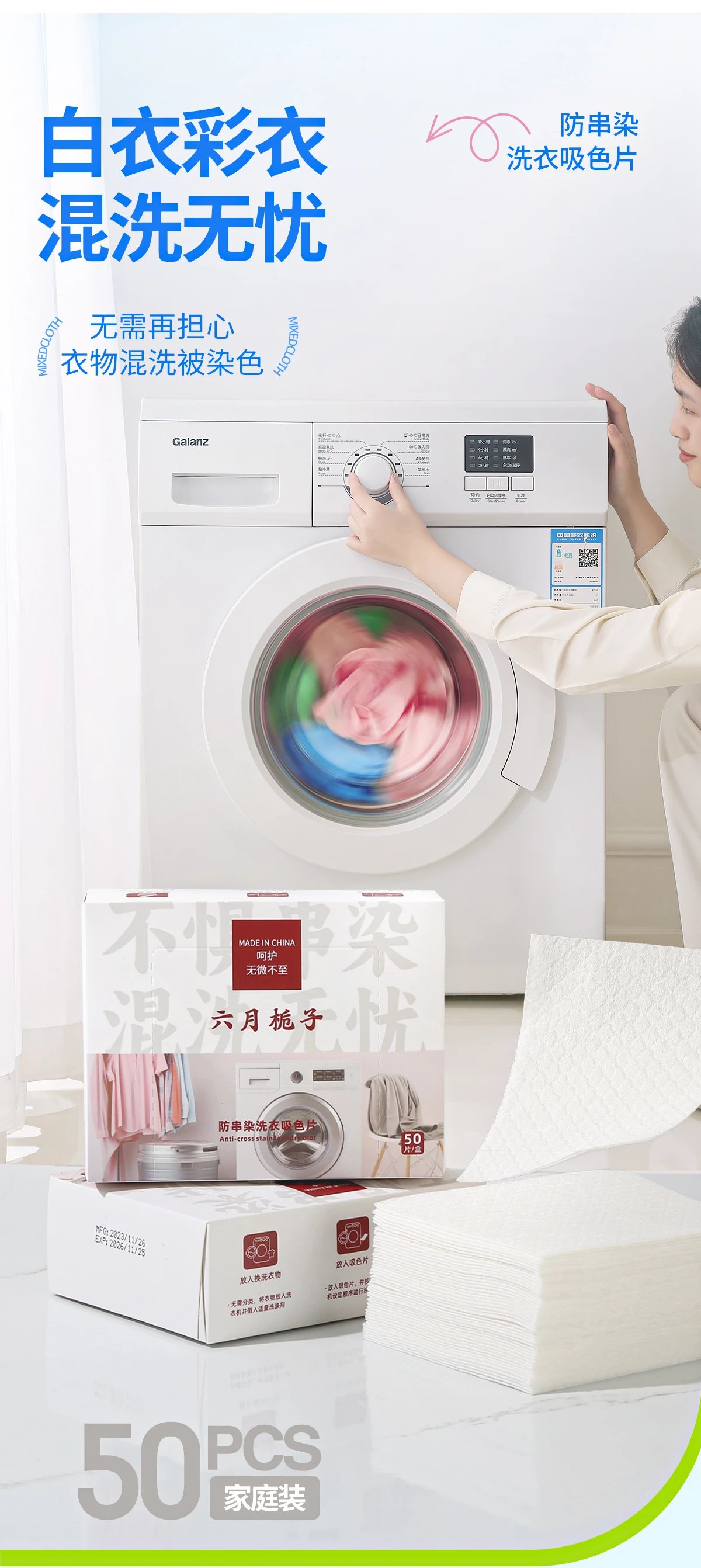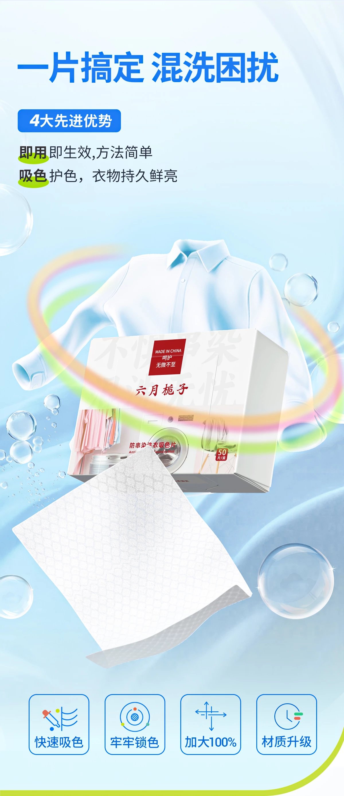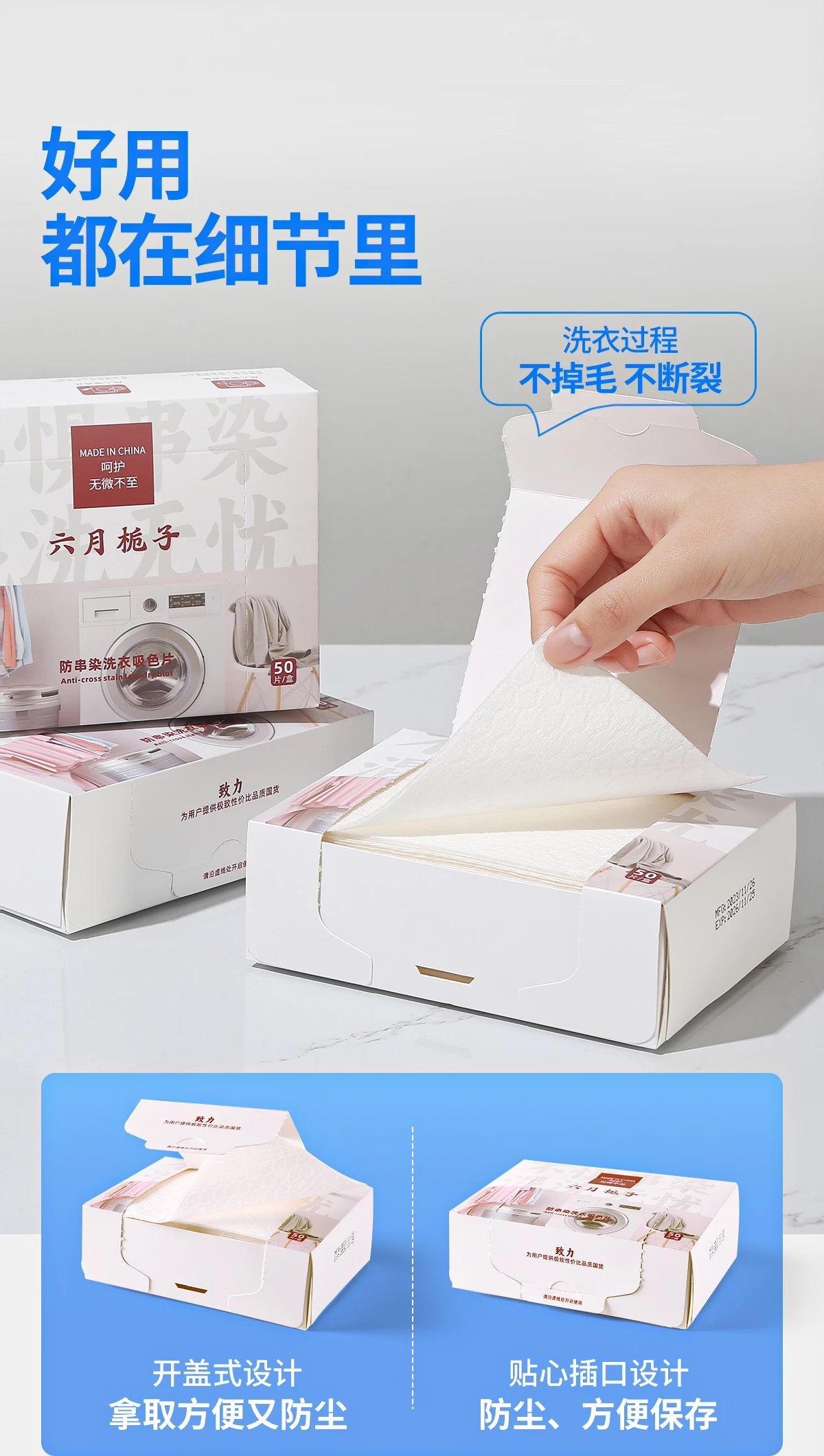 六月栀子防串染吸色片, 开盖式设计,拿取方便, 贴心插口设计, 防尘便于保存, 布料加入ES纤维, 洗衣过程不掉毛絮不断裂, 好用都在细节里。