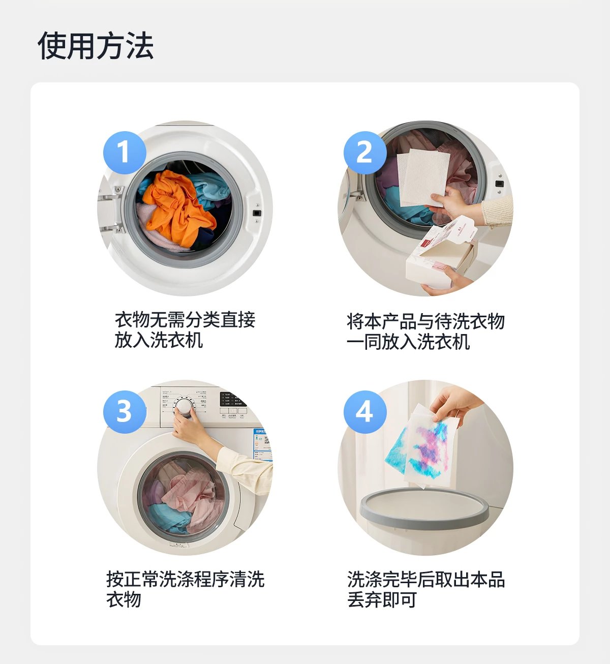 日常洗衣放1-2片, 可根据衣物数量多少, 适当增加片数。 温馨提示: 对已知掉色严重的丝织品或牛仔裤等衣物, 请先单独预洗, 待掉色正常时放入吸色片与其他衣物同洗。 吸色片不溶于水, 洗涤完毕后将其取出丢入垃圾桶内, 请勿丢入马桶或下水道内。