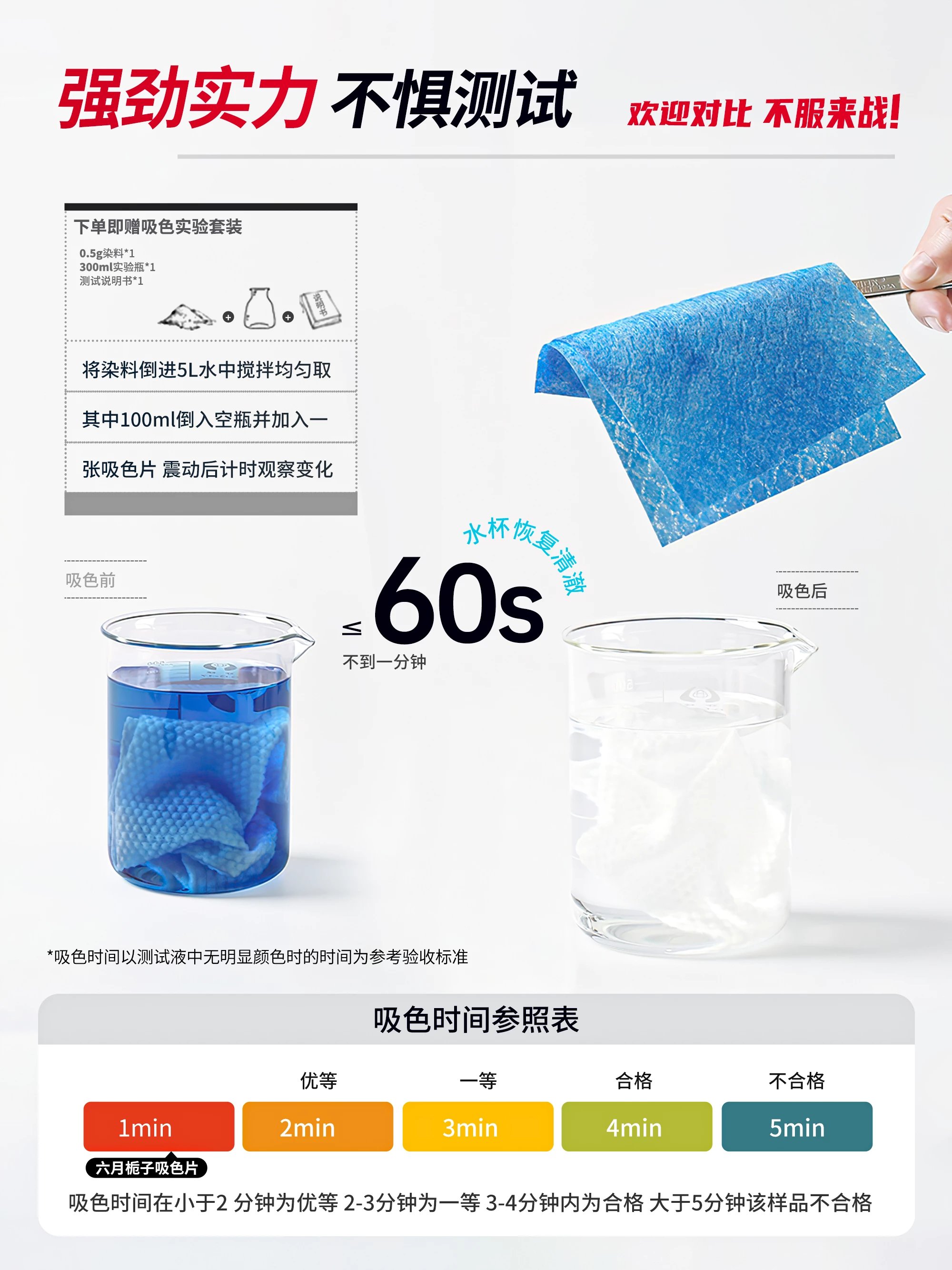 吧啦吧啦说了那么多, 每家都在宣传吸色效果很好, 又凭什么信你? 俗话说的好:是骡子是马,拉出来溜溜! 下单即送:吸色试验三件套(活性染料、测试空瓶、吸色片行业标准测试说明书), 1分钟内高效吸色,不惧测试,欢迎对比,不服来战!!! 吸色效果直观展现,真实力不怕测!