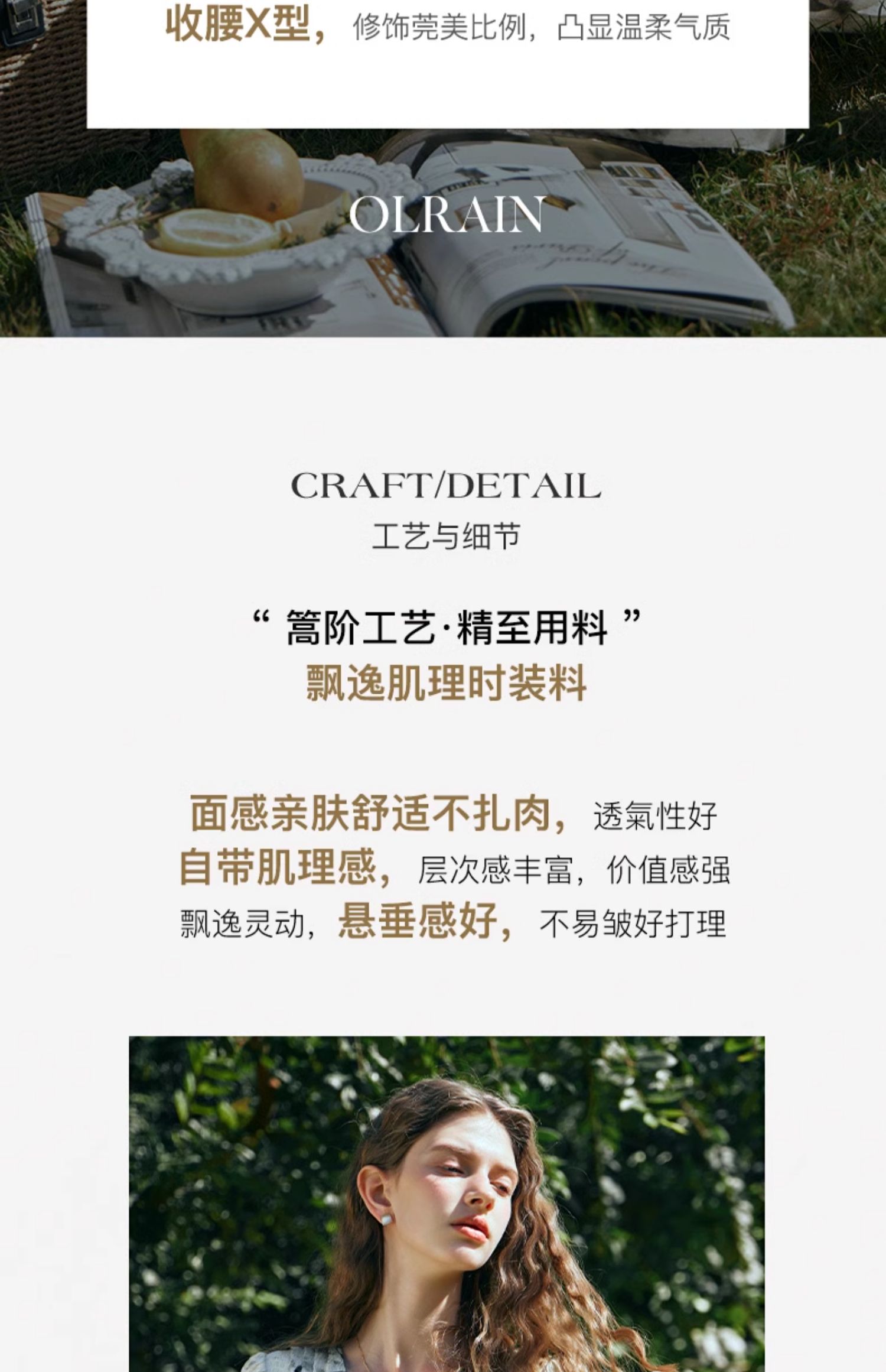 - “精致”是欧芮儿olrain品牌文化的核心,欧芮儿认为,精致的女人,不但要外在动人,更要内在迷人,内外兼修,有魅力、有气质、有内涵,自信而不自傲,优雅而不矫揉,自有万种风情而不轻浮,更不故作矜持。