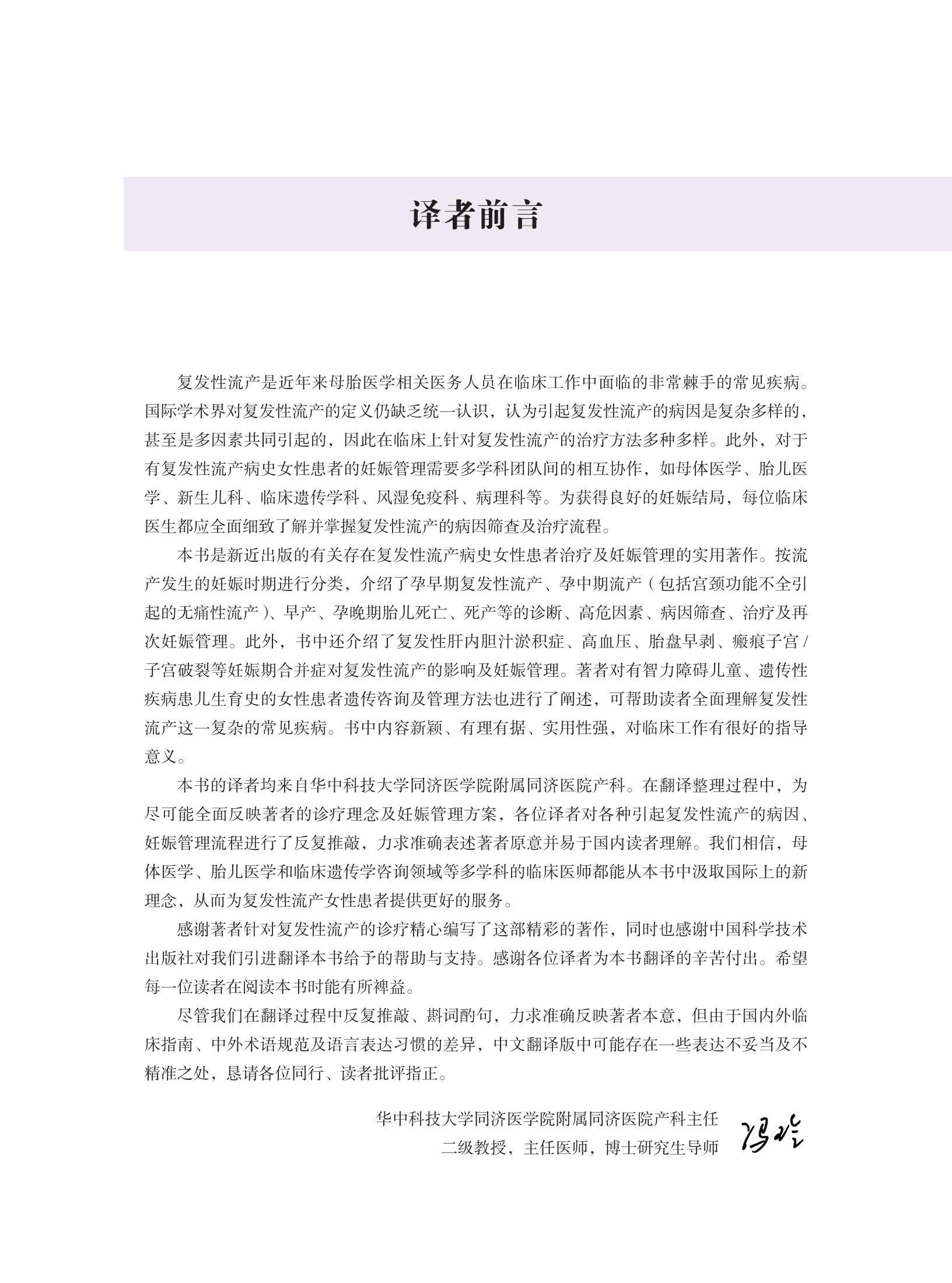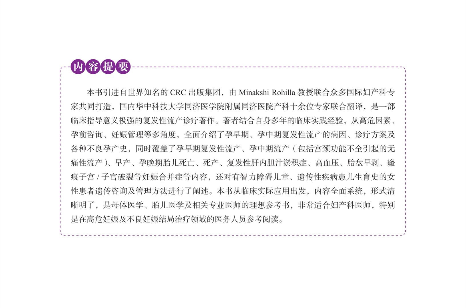 本书引进自世界知名的 CRC 出版集团,由 Minakshi Rohilla 教授联合众多国际妇产科专家共同打造,国内华中科技大学同济医学院附属同济医院产科十余位专家联合翻译,是一部临床指导意义极强的复发性流产诊疗著作。著者结合自身多年的临床实践经验,从高危因素、孕前咨询、妊娠管理等多角度,全面介绍了孕早期、孕中期复发性流产的病因、诊疗方案及各种不良孕产史,同时覆盖了早孕期复发性流产、中孕期流产(包括宫颈功能不全引起的无痛性流产)、早产、晚孕期胎儿死亡、死产、复发性肝内胆汁淤积症、高血压、胎盘早剥、瘢痕子宫 / 子宫破裂等妊娠合并症等内容,还阐述了对有智力障碍儿童、遗传性疾病患儿生育史的女性的遗传咨询及管理方法。本书从临床实际应用出发,内容全面系统,形式清晰明了,是母体医学、胎儿医学及相关专业医师的理想参考书,非常适合妇产科医师,特别是在高危妊娠及不良妊娠结局治疗领域的医务人员参考阅读。