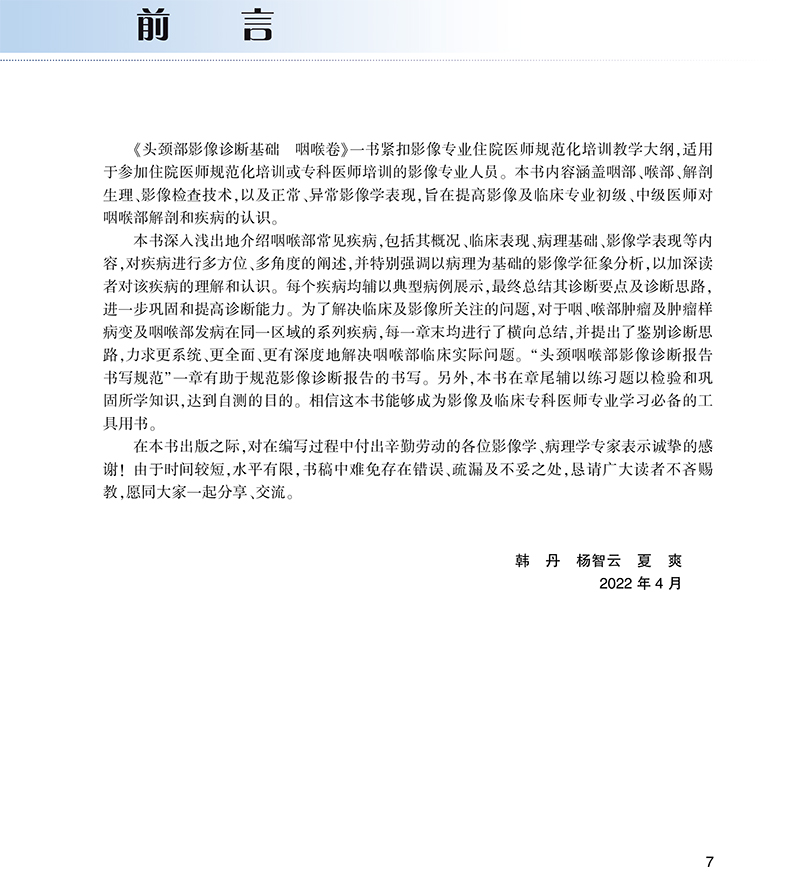 头颈部影像诊断基础 咽喉卷 住院医师规范化培训丛书 韩丹 杨智云 夏爽 检查方法影像断层解剖 人民卫生出版社9787117327305
