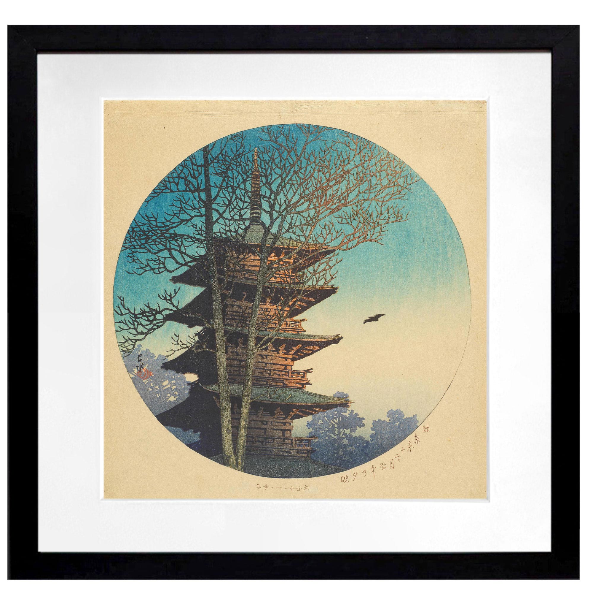 独角鹿西洋古董 1921年日本大正时代著名新版画大师川濑巴水签名创作木版画作品《东京十二月|谷中夕映》