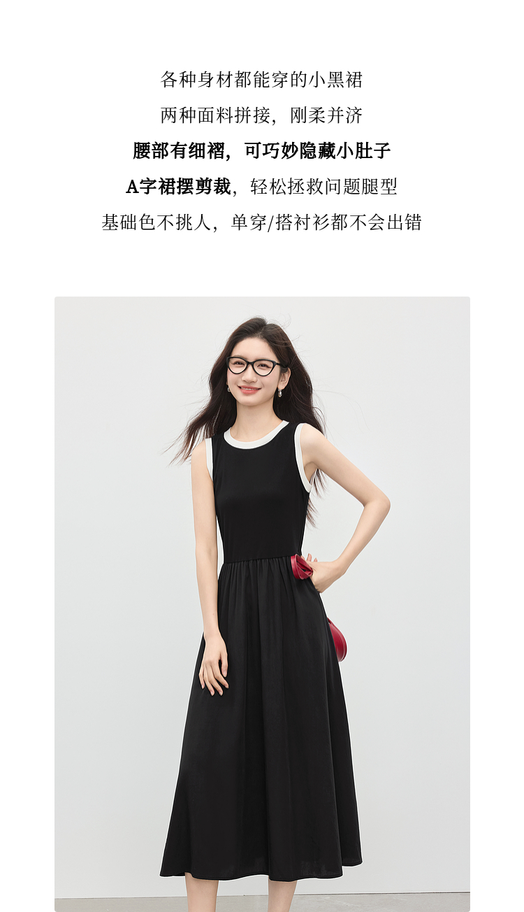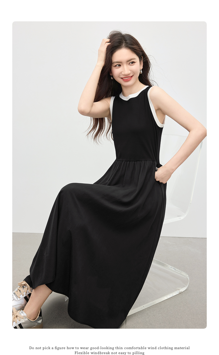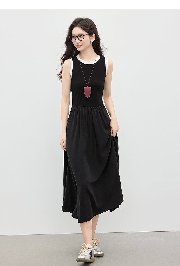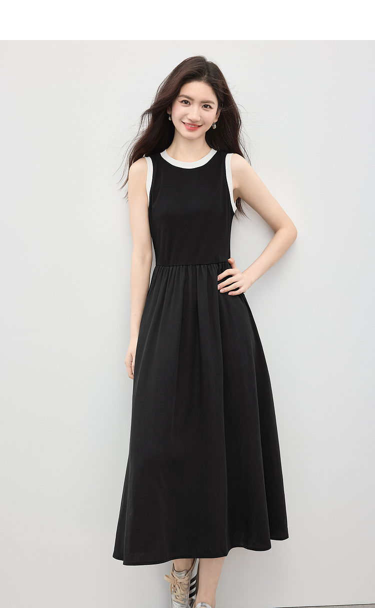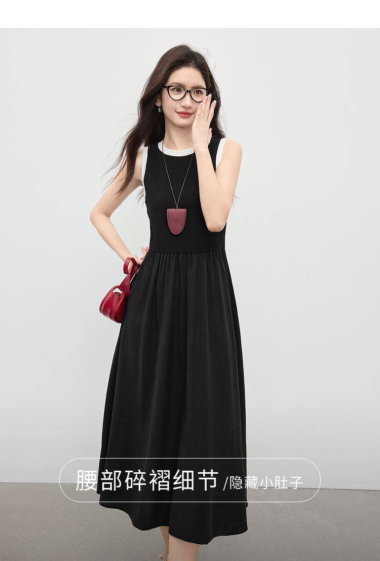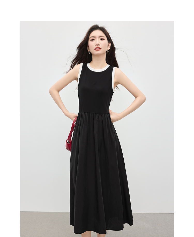 【专属特价】熙世界通勤撞色圆领无袖连衣裙女夏季高级感气质显瘦黑色背心长裙