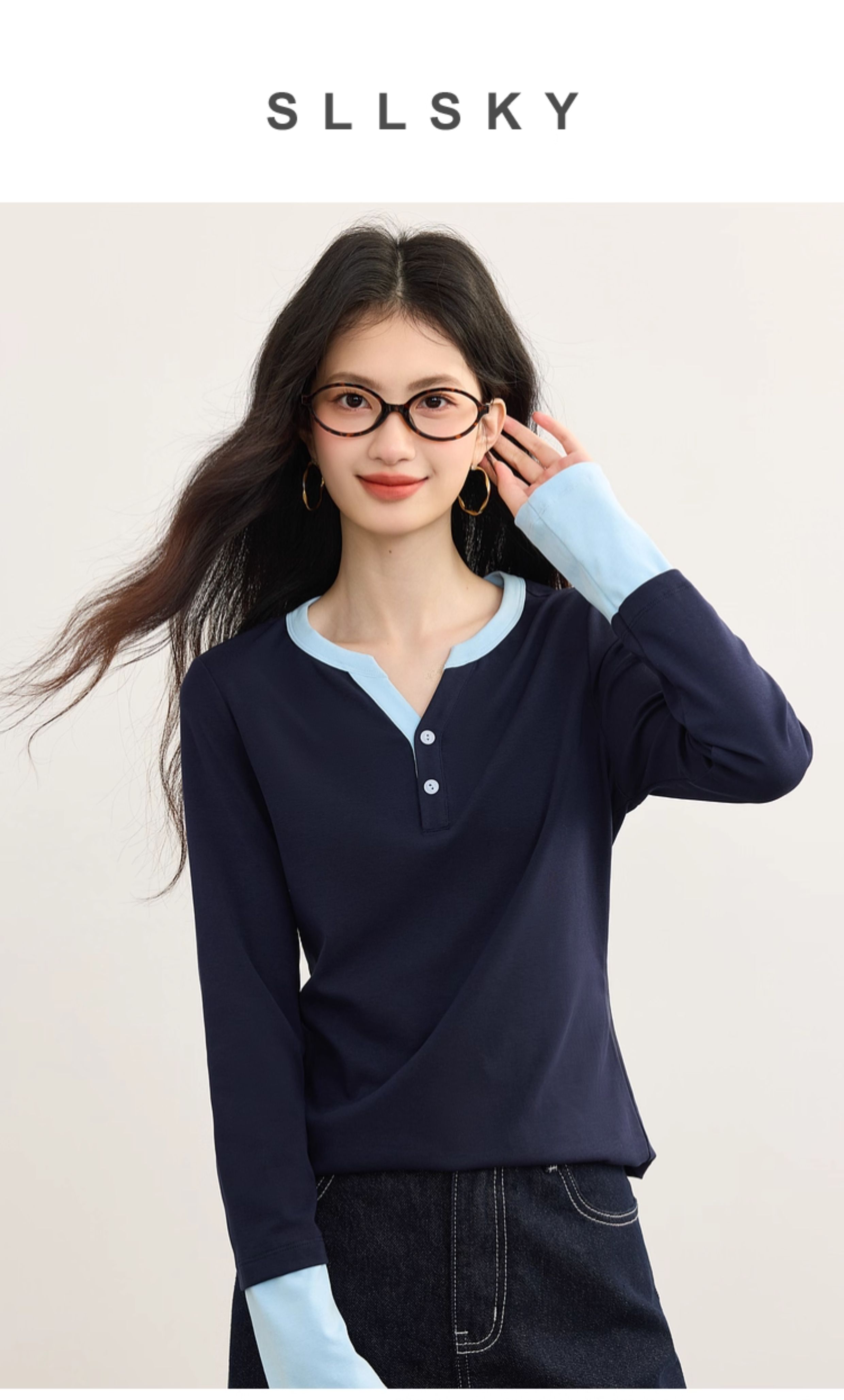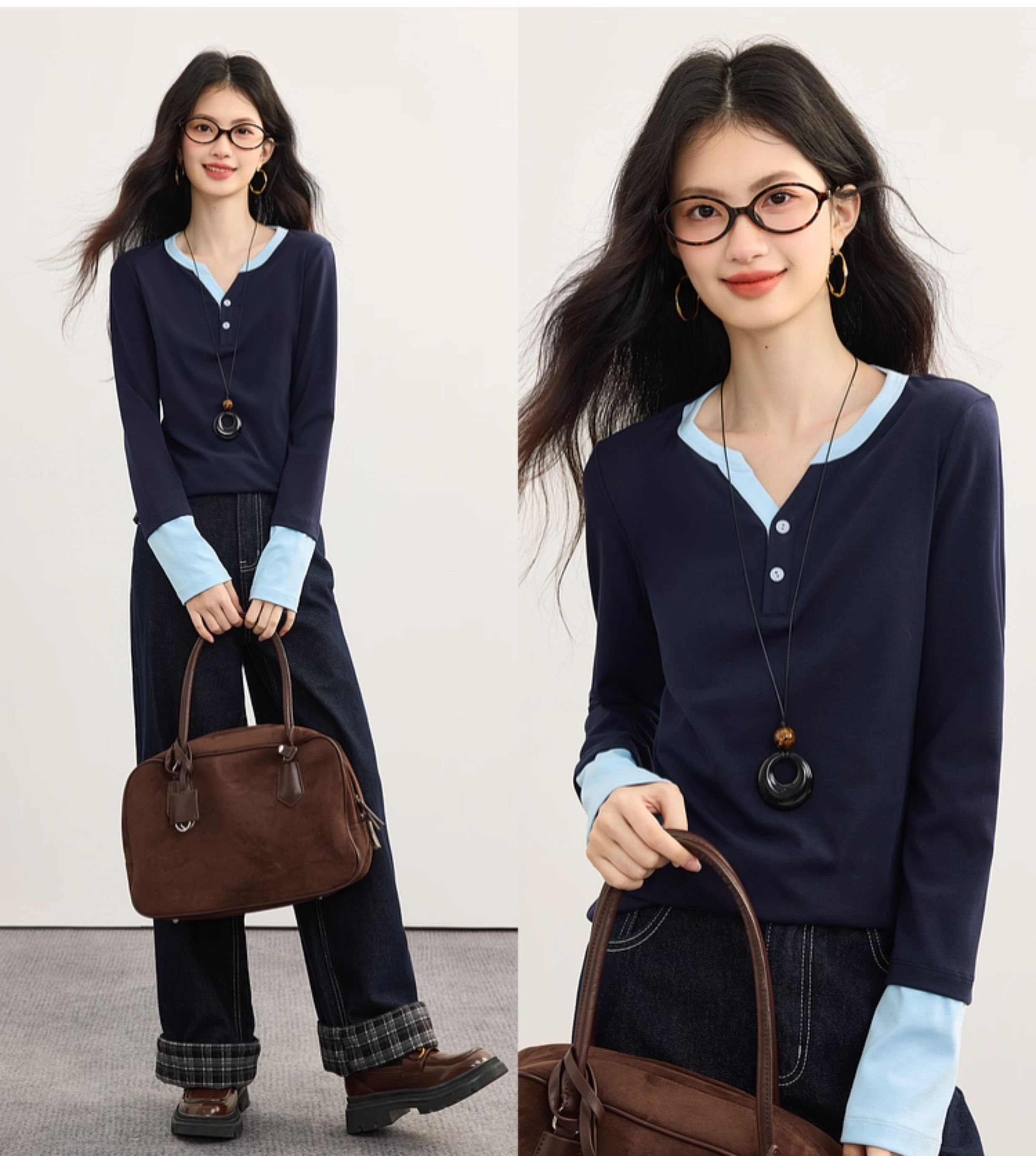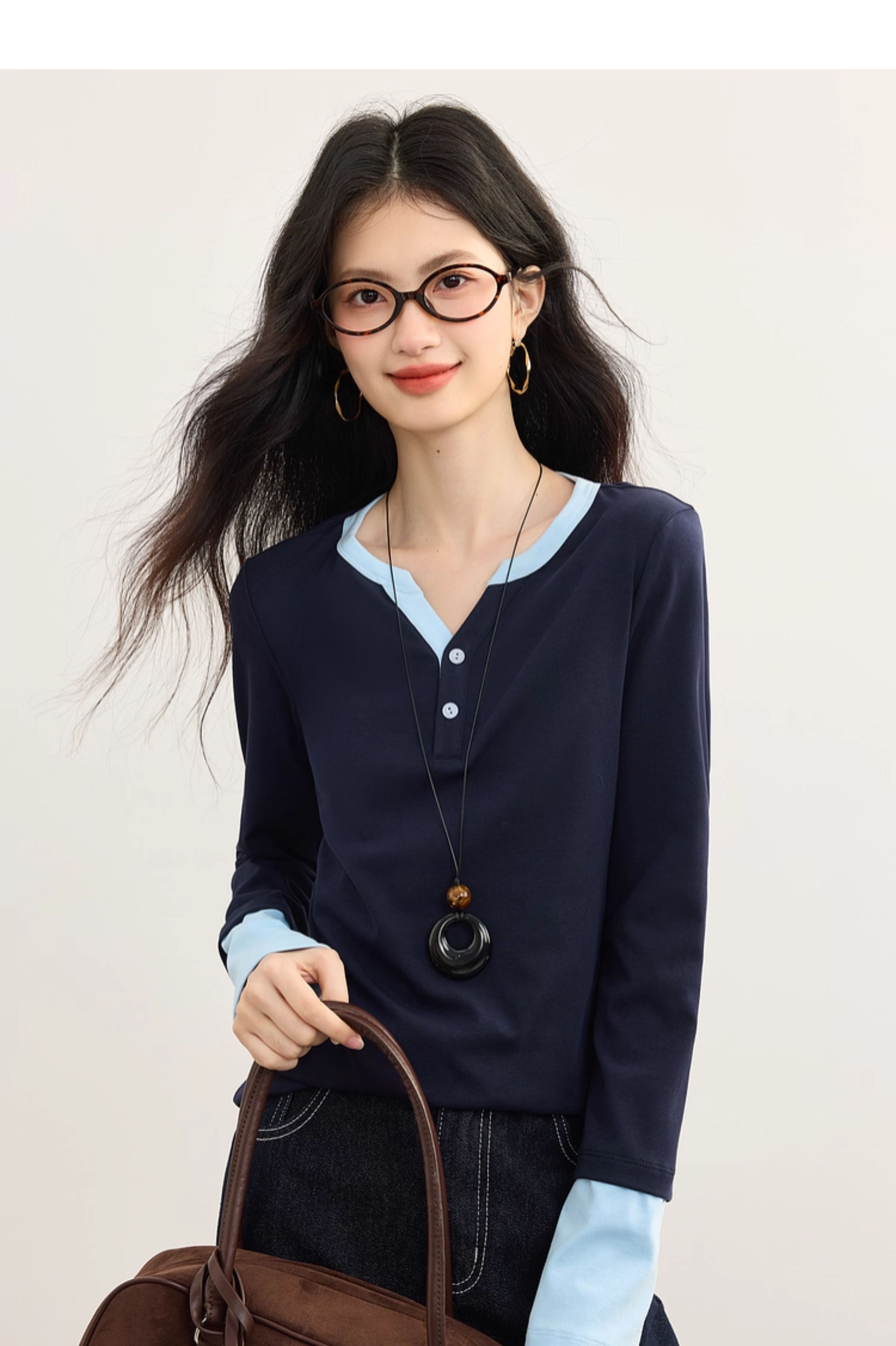 【09/10新品】熙世界长绒棉撞色长袖T恤女2025年秋季新款修身半开领打底衫上衣