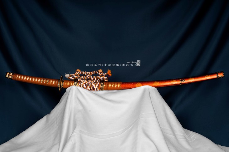 全长108左右 反比普通的大一些 散丝卷桐纹太刀拵 桐纹原是日本皇室与大将军专属 使用非常严格 刃是我们自己锻打的钢材 大概锤了4000余层 传统的覆土烧刃工艺 手工研磨 刃口研白 切先也处理的还可以 磨完了以后烧刃纹路还比较好看