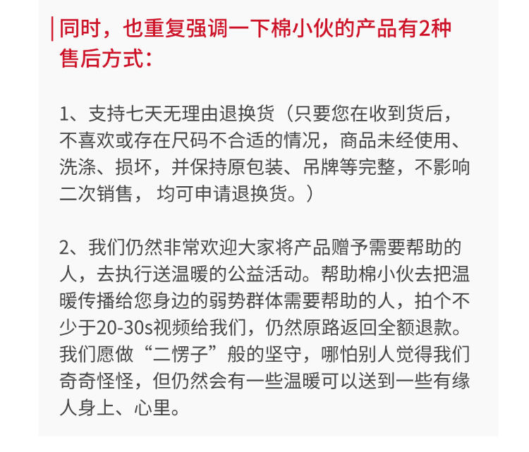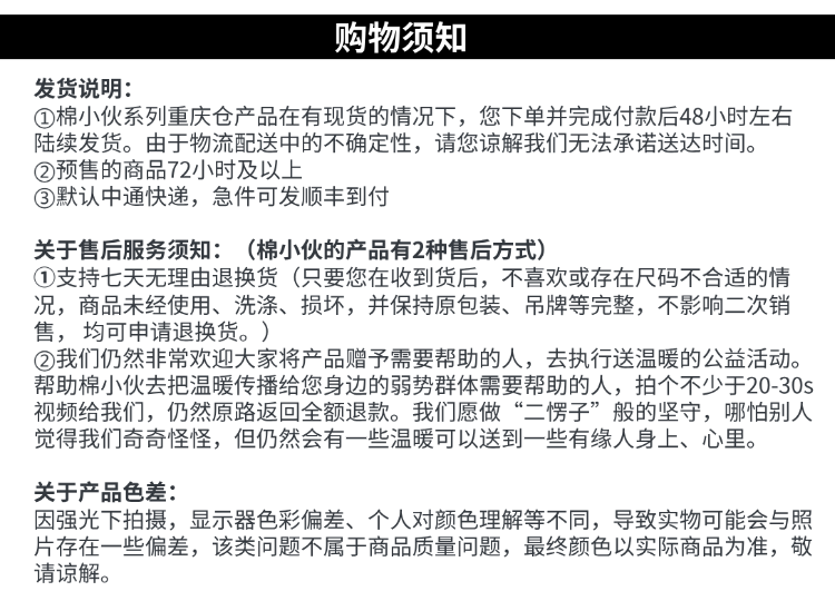 售后:七天无理由退换货(只要您在收到货后,不喜欢或存在尺码不合适的情况,商品未经使用、洗涤、损坏,并保持原包装、吊牌等完整,不影响二次销售,均可申请退换货。)