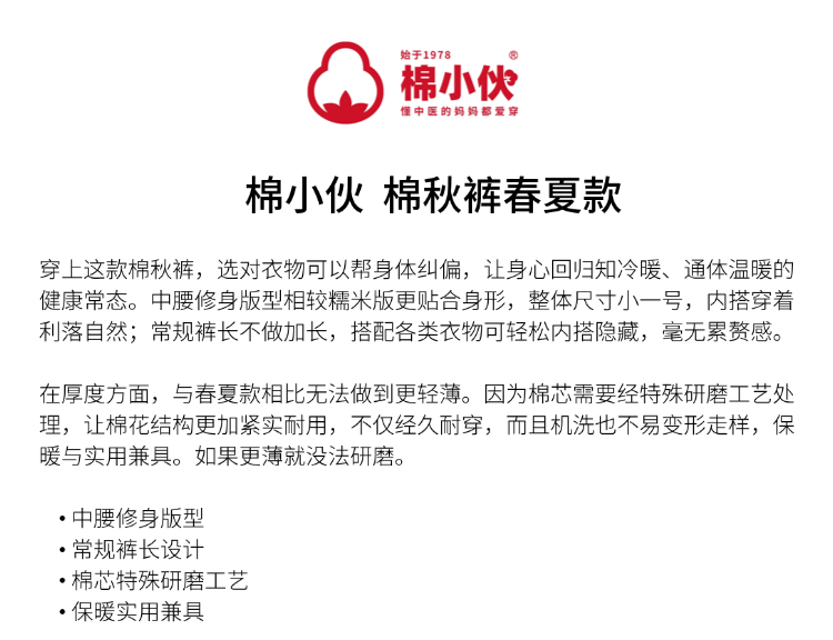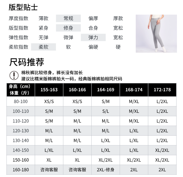 棉秋裤采用中腰修身版型设计,相较糯米版尺寸更贴合身形,整体版型更小一号,让内搭穿着更利落自然。裤长保持常规,不做加长处理,搭配各类衣物都能轻松隐藏于内,毫无累赘感。