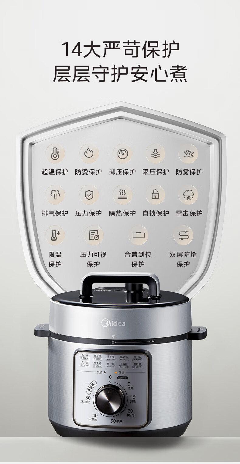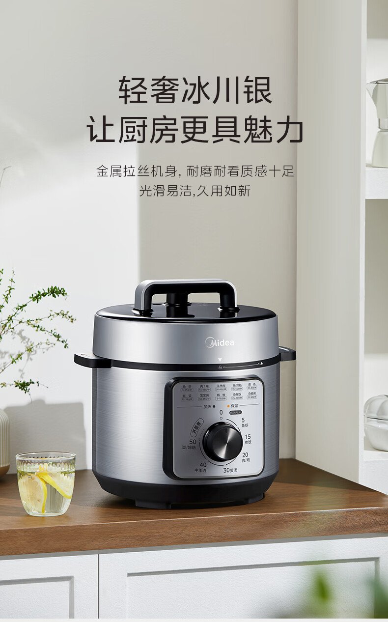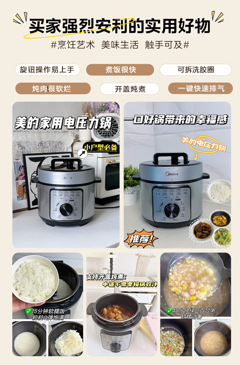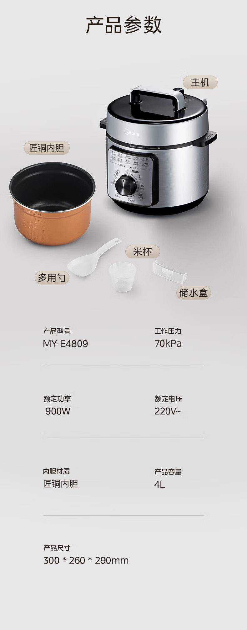 美的(Midea)4L电压力锅 家用70kPa快煮 高压电饭锅 旋钮操控 开盖火锅 煲汤 煮小米粥MY-E4809电饭煲3-6人