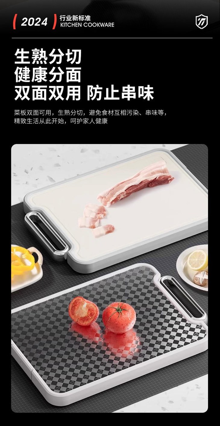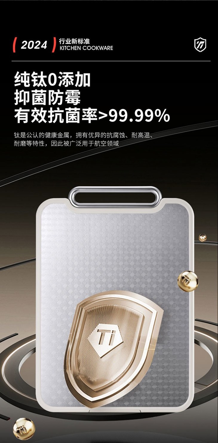 ✨ 100% 纯钛板面,健康党狂喜! ✅一面是纯钛板材,不含任何有害重金属,抗盐耐氧化,切海鲜、剁肉馅都不怕腐蚀! ✅立体花纹设计超贴心,切菜切肉不容易留划痕,用久了也还是干干净净的,再也不用担心菜板藏污纳垢! ✅关键是双面抗菌!处理生肉之后冲一冲就干净,细菌根本没地方躲,给娃做辅食都超放心~