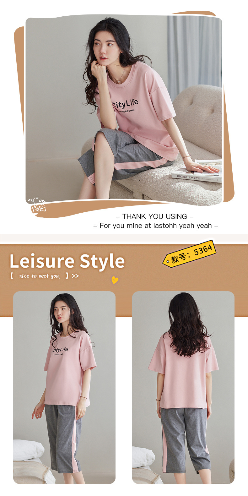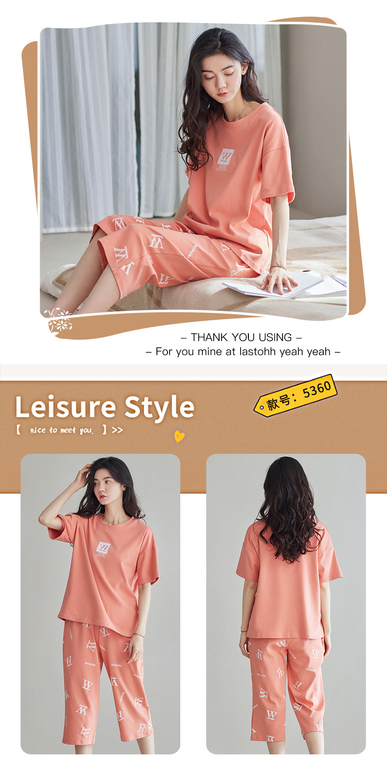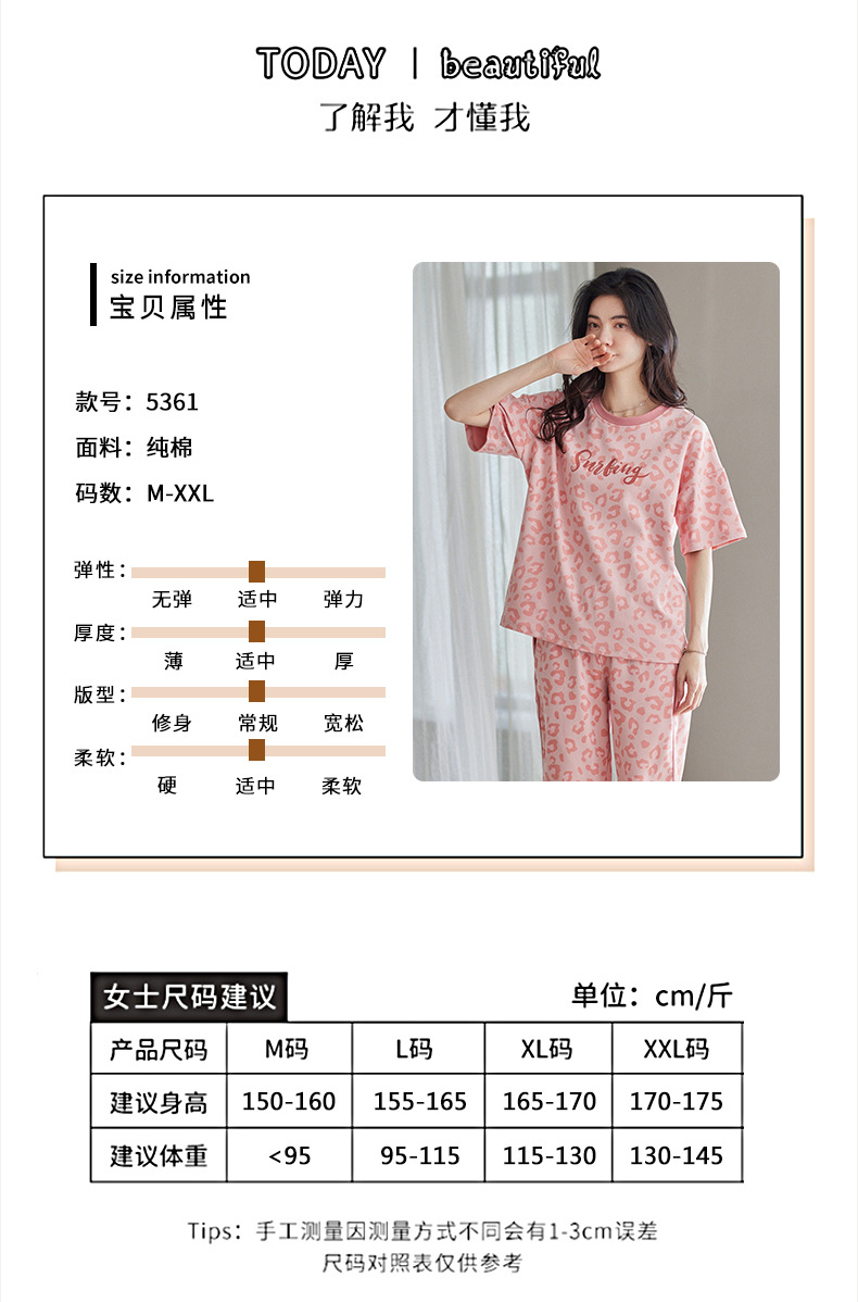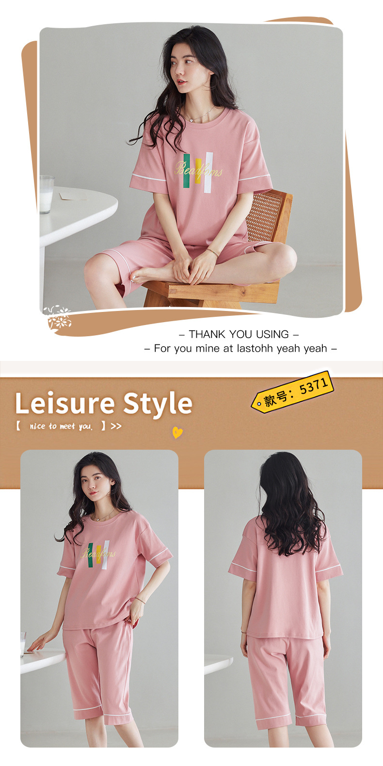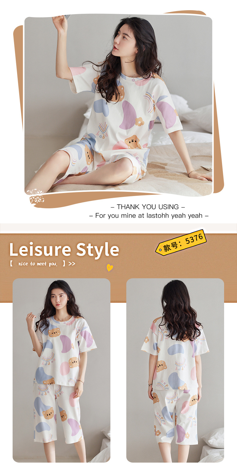 春夏可外穿纯棉7分裤睡衣 甜美休闲简约舒适短袖家居服