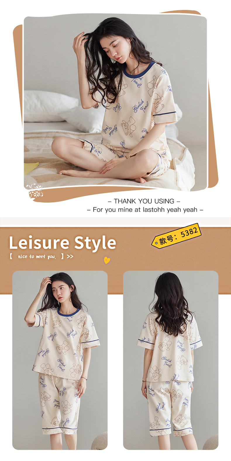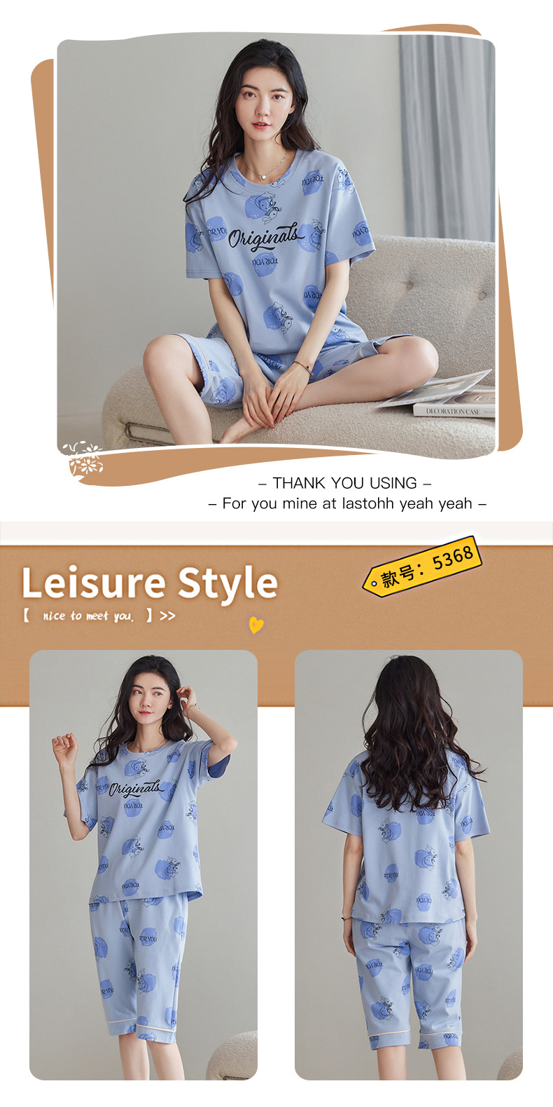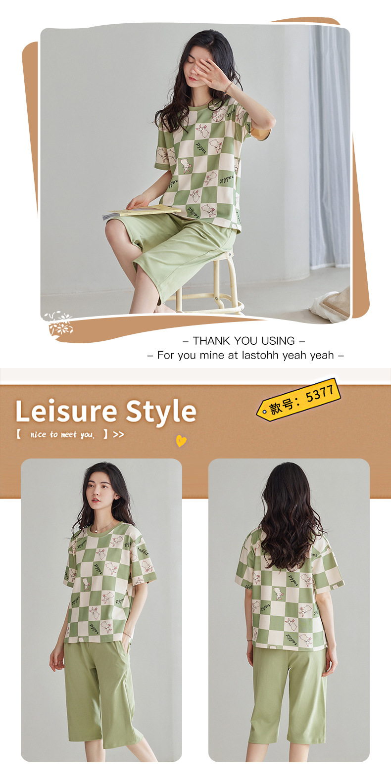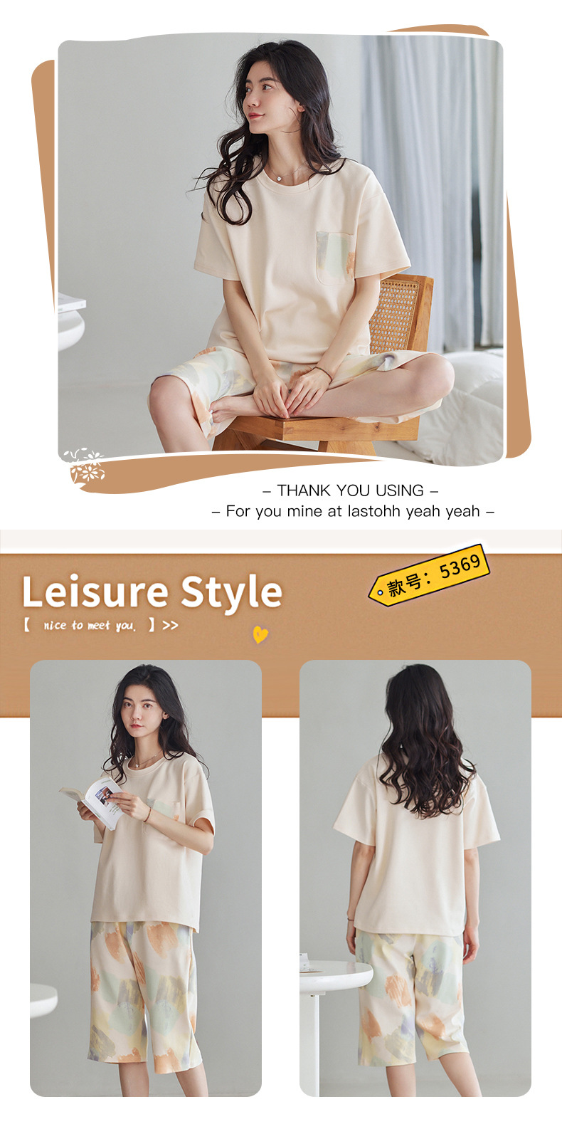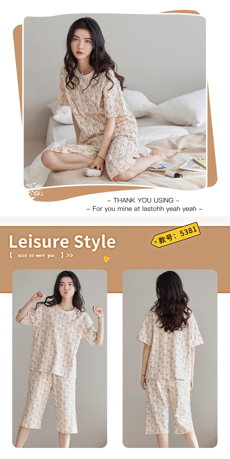 春夏可外穿纯棉7分裤睡衣 甜美休闲简约舒适短袖家居服