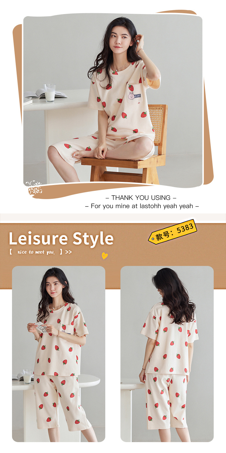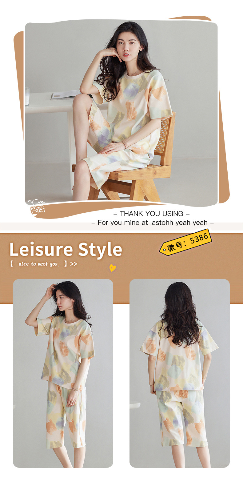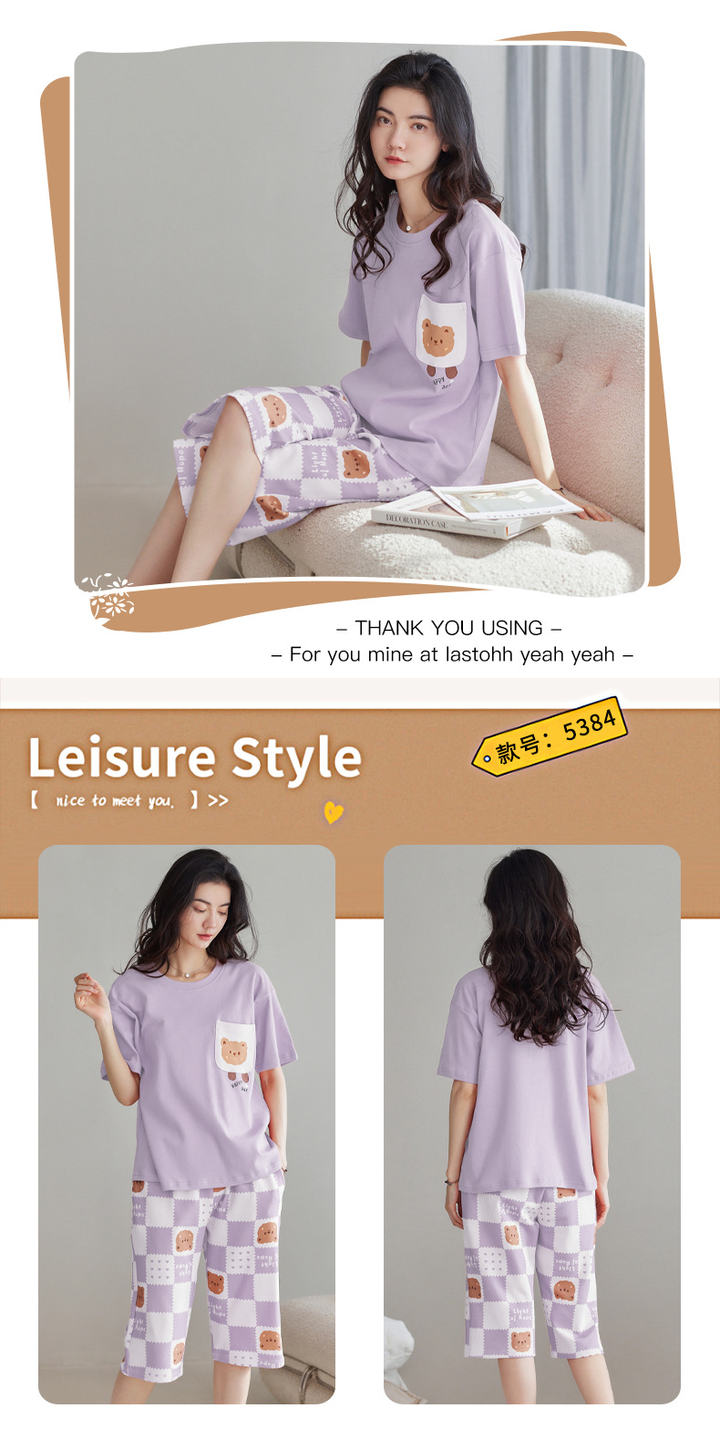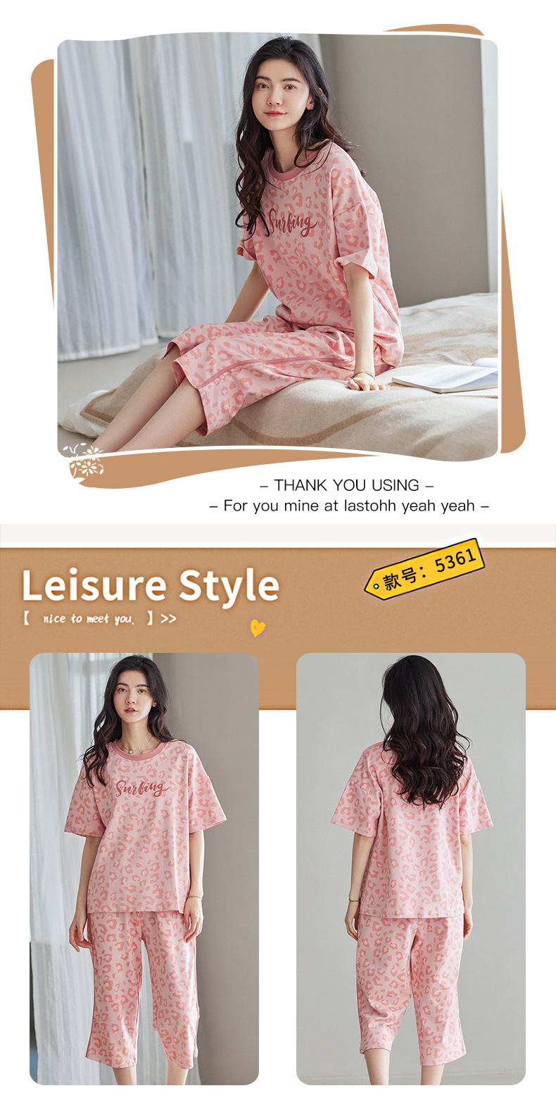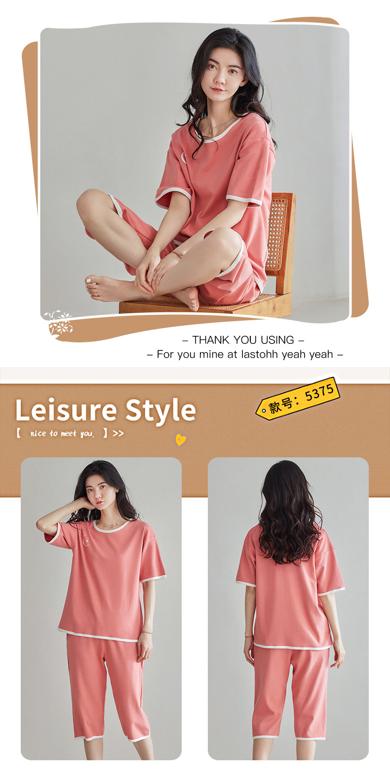 春夏可外穿纯棉7分裤睡衣 甜美休闲简约舒适短袖家居服