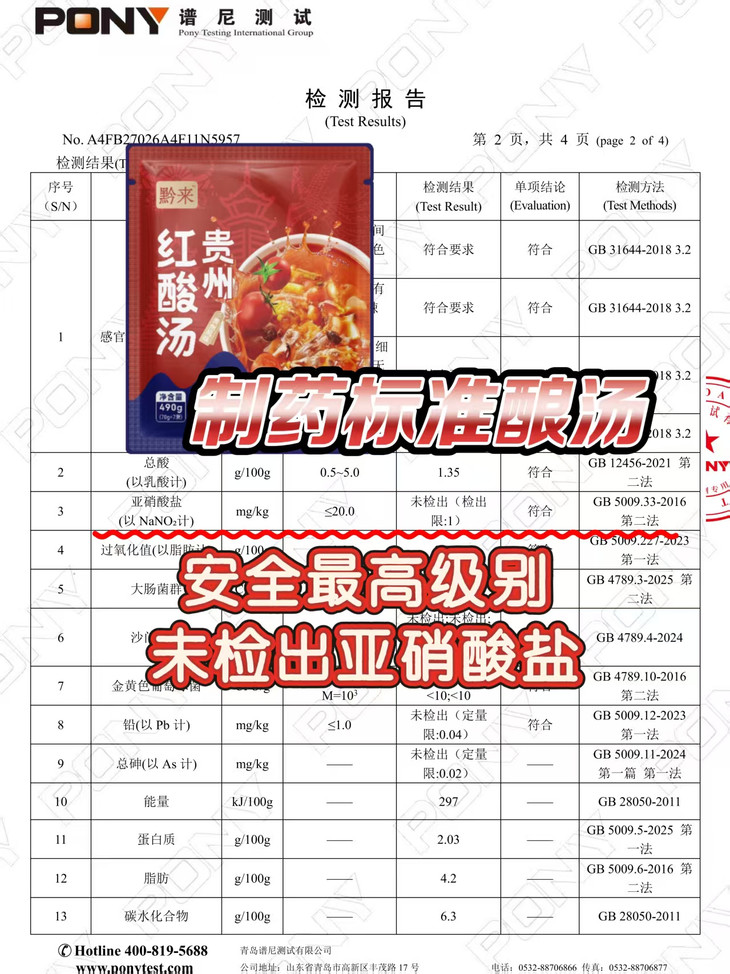 【贵州红酸汤】农采用农科院3项乳酸菌专利发酵技术,酸味干净纯粹,0防腐剂、0色素、0香精,连亚硝酸盐都未检出,不仅能做招牌酸汤鱼,煮面、煮粉、减脂餐都是很赞的。