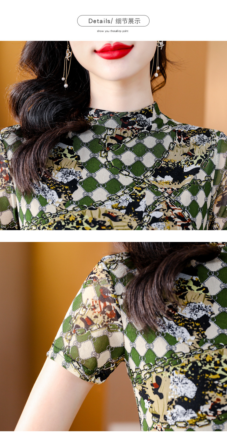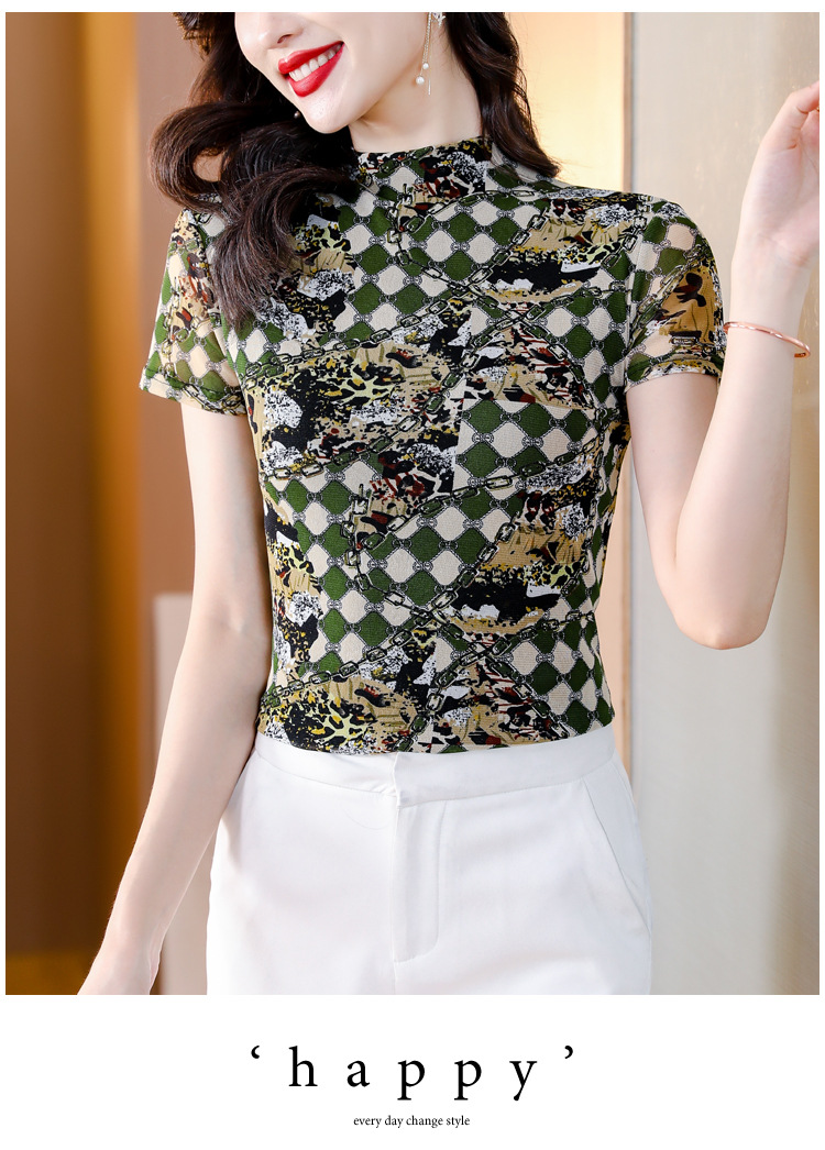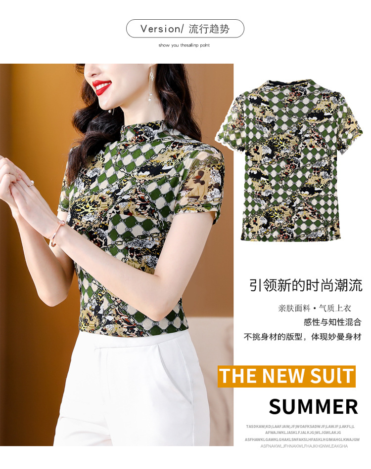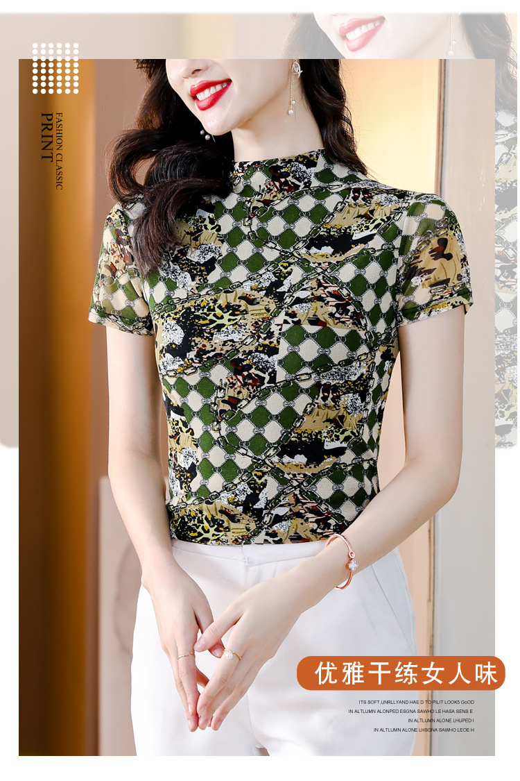 夏季新款,半高领短袖T恤女网眼弹力桑蚕丝印花打底衫上衣KQL-326H2181