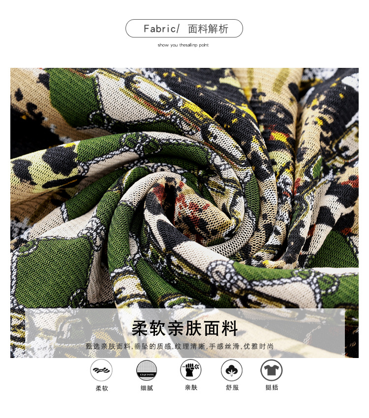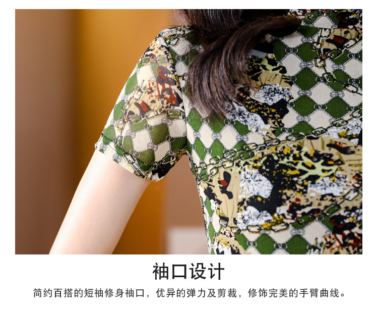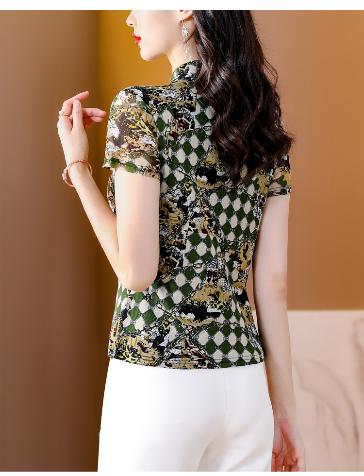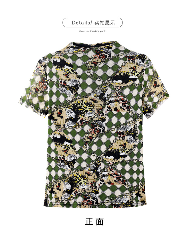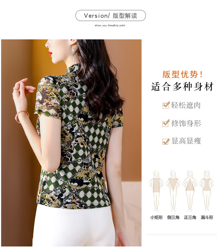 夏季新款,半高领短袖T恤女网眼弹力桑蚕丝印花打底衫上衣KQL-326H2181