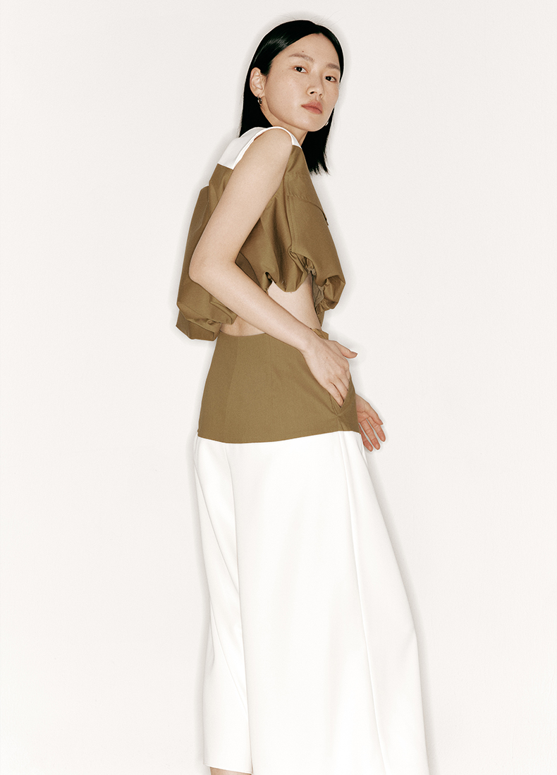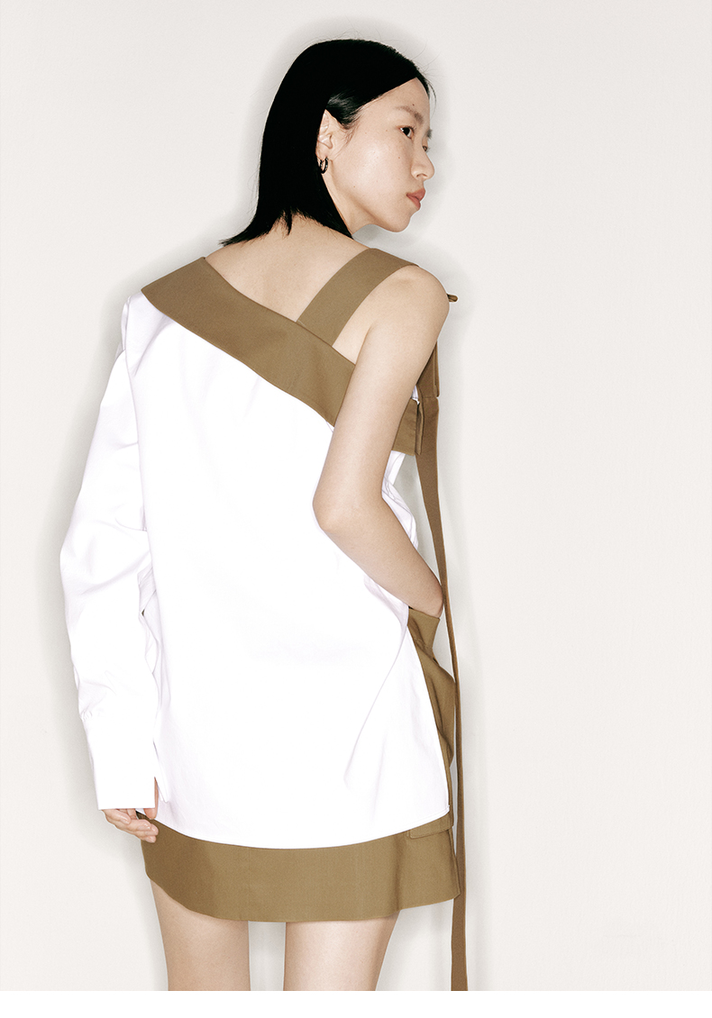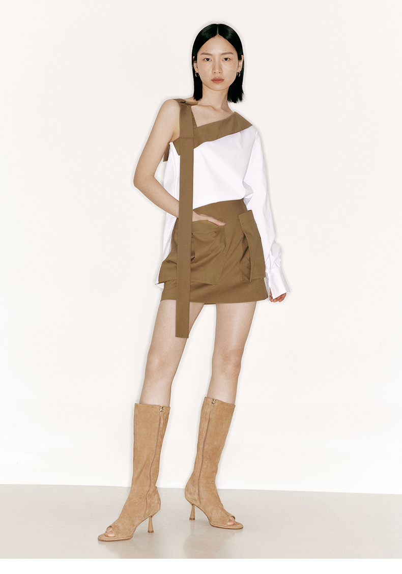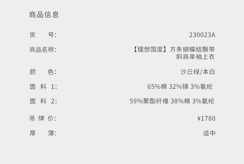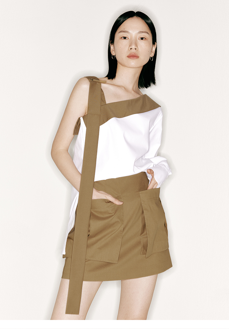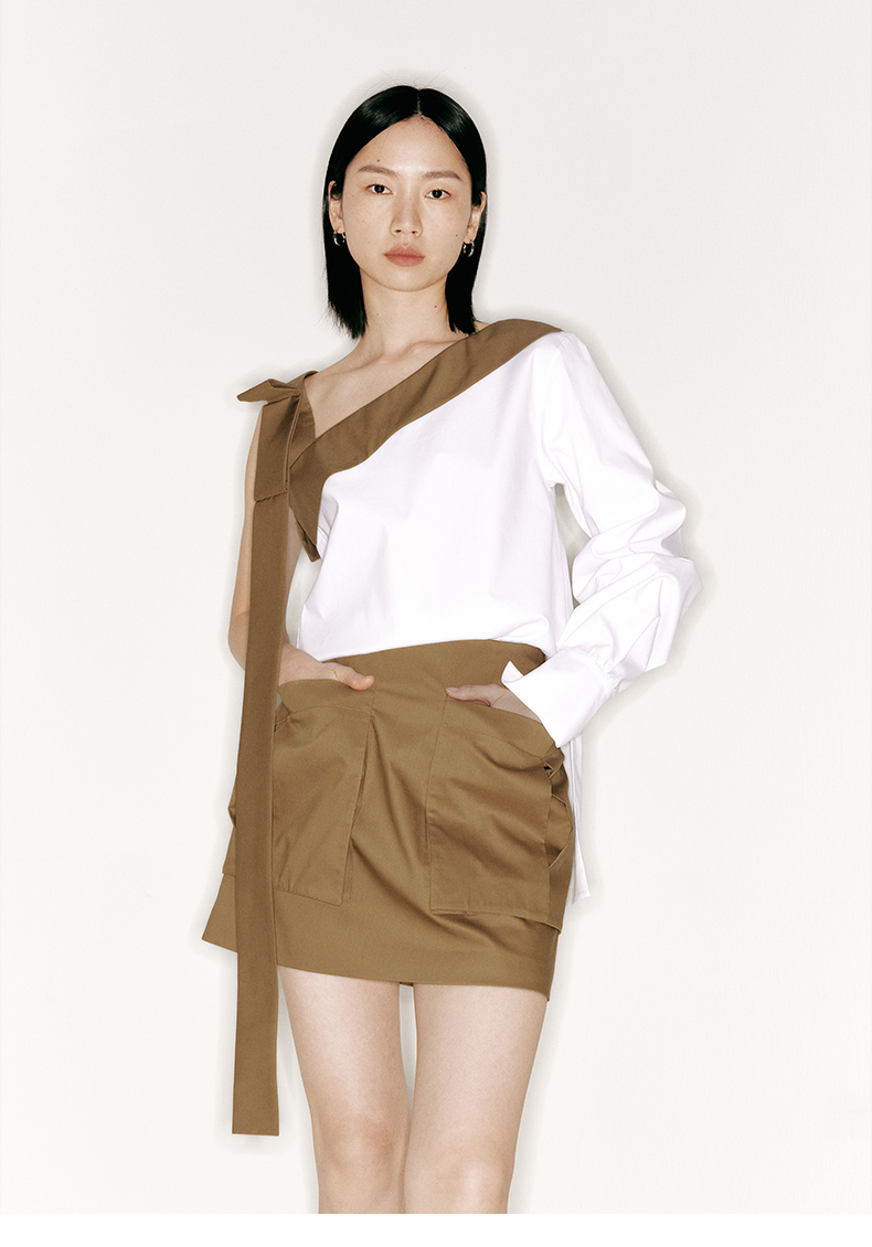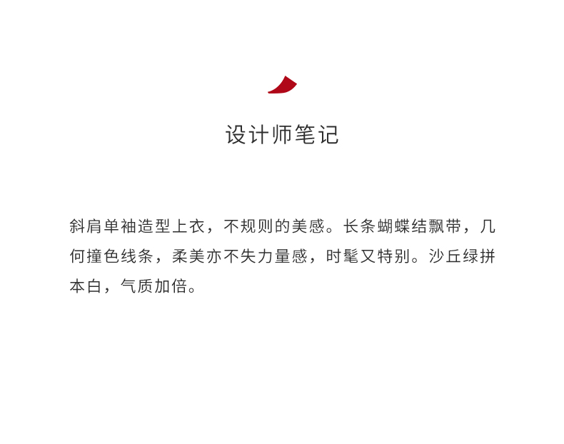 【理想国度】方条蝴蝶结飘带斜肩单袖上衣/230023A