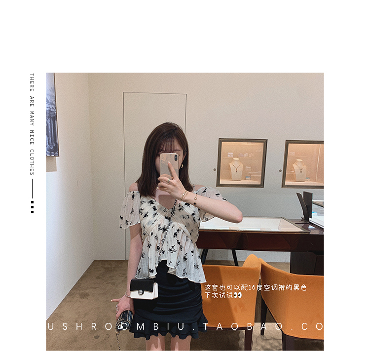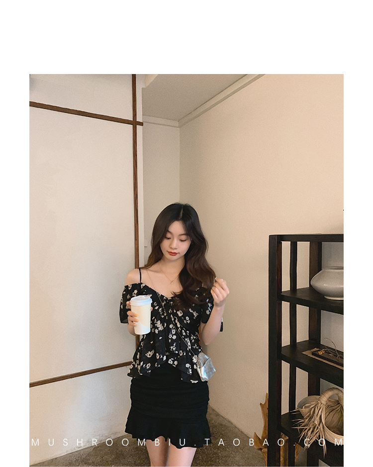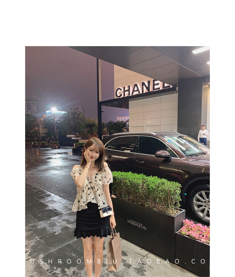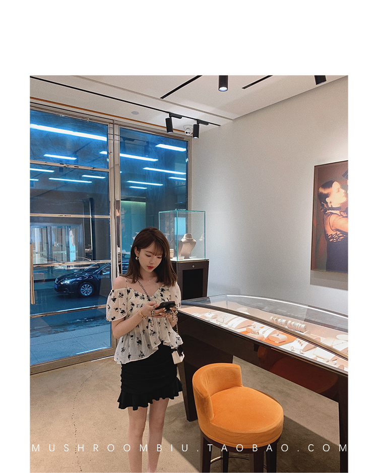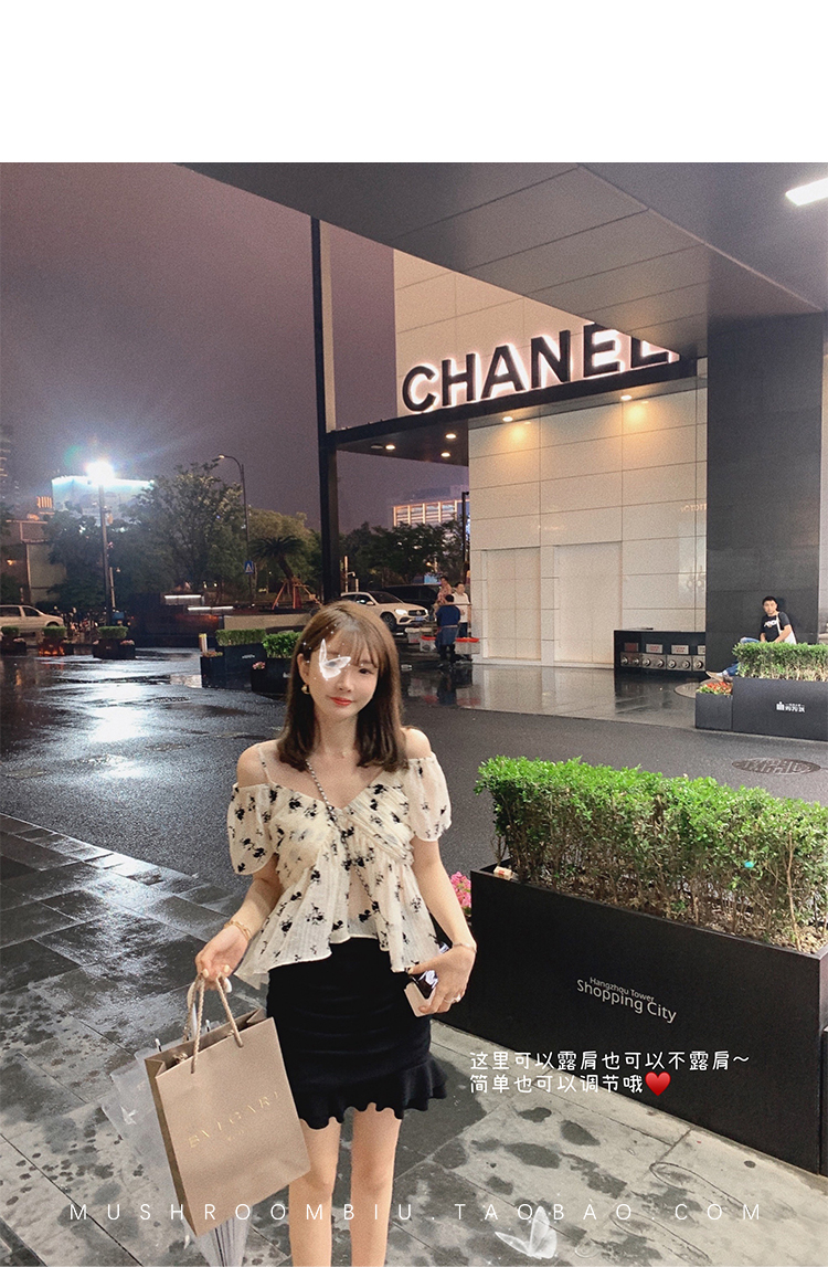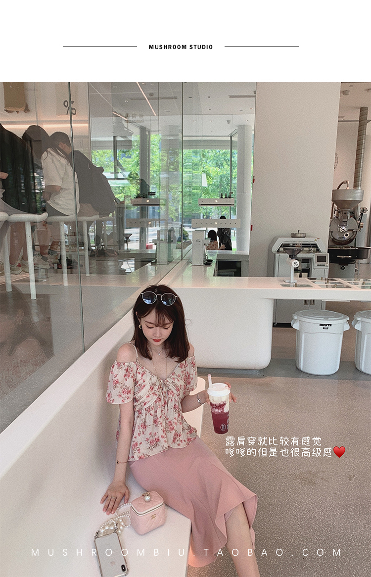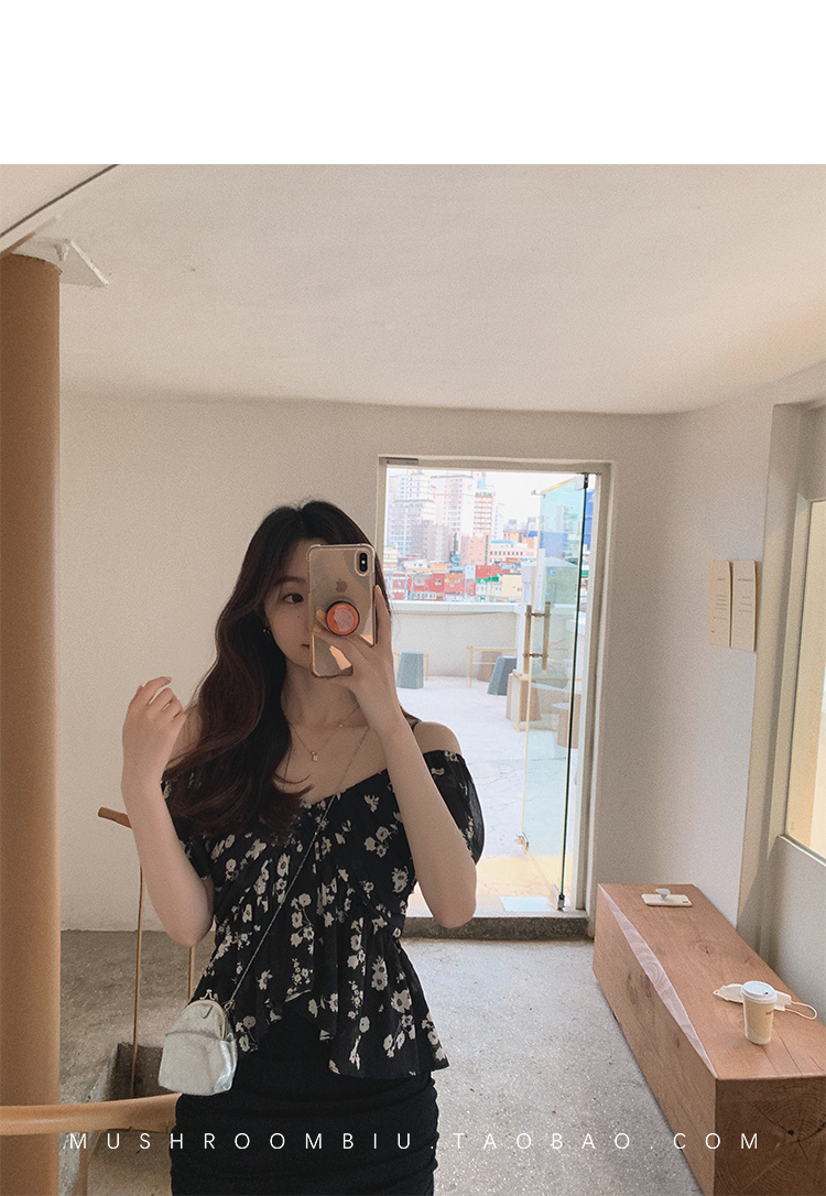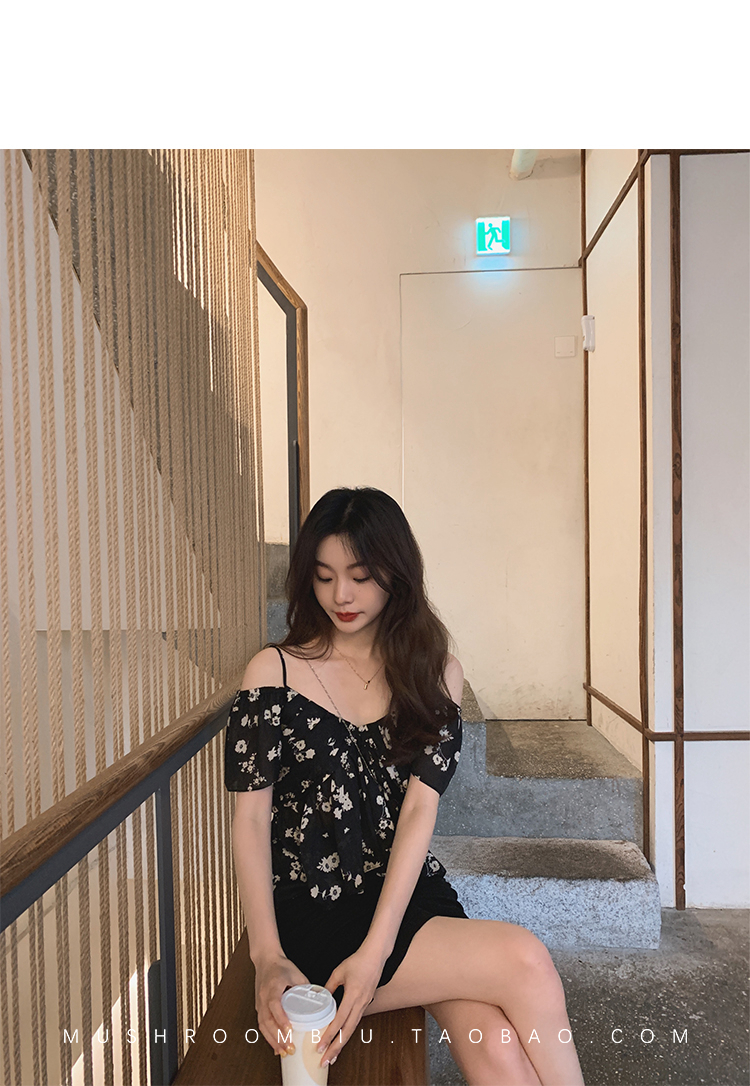 【金蘑菇菇 初恋50次】法式一字肩小心机露肩雪纺碎花上衣