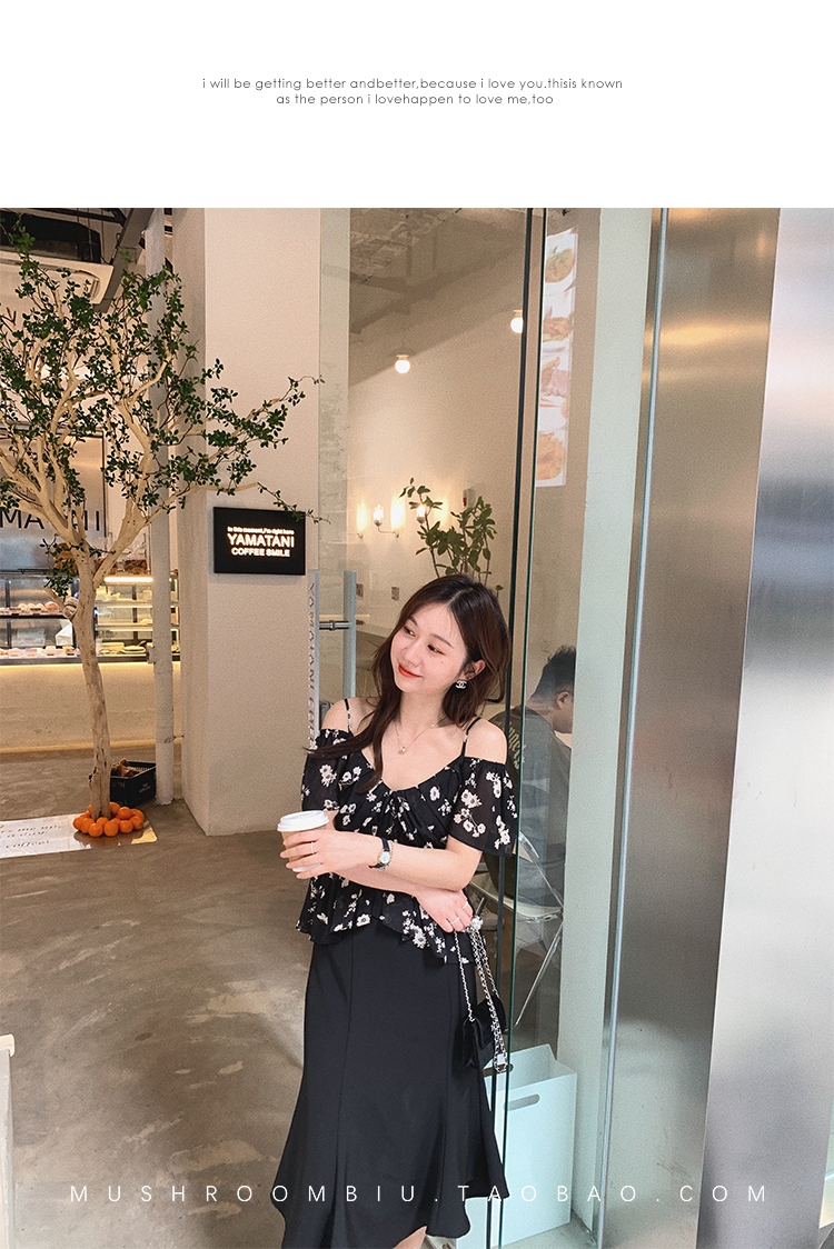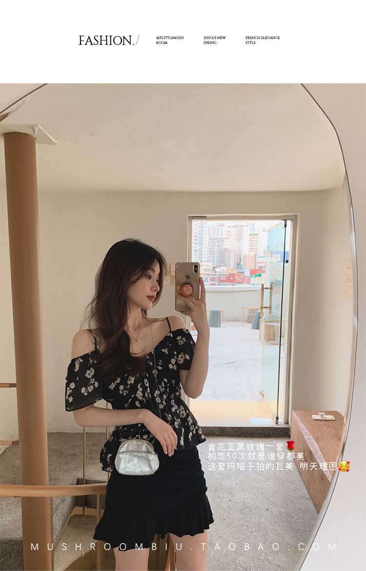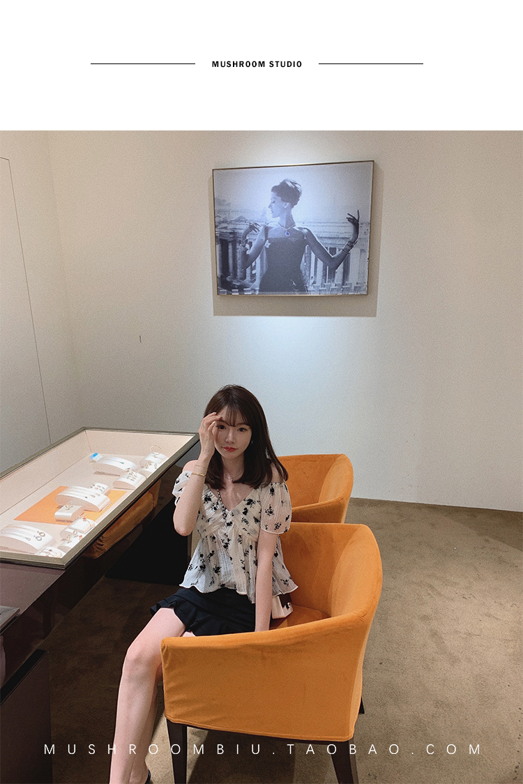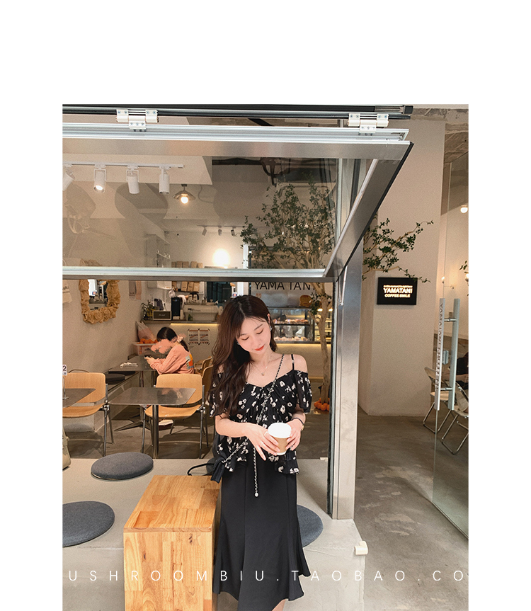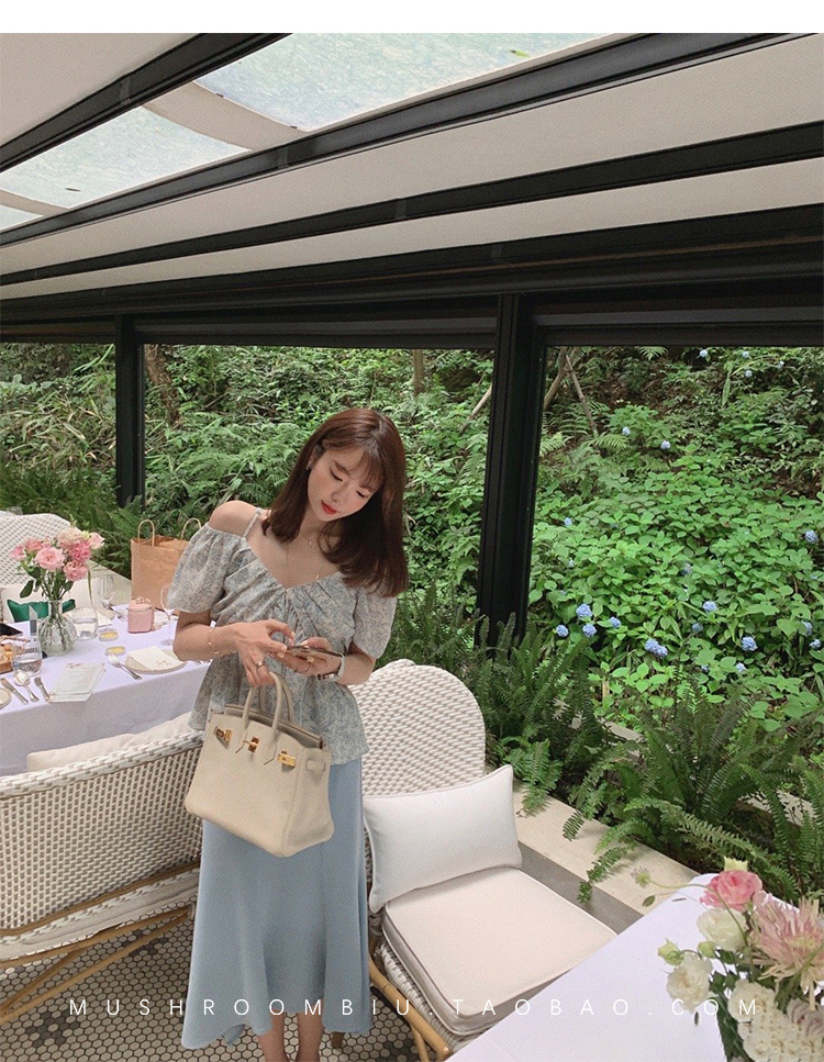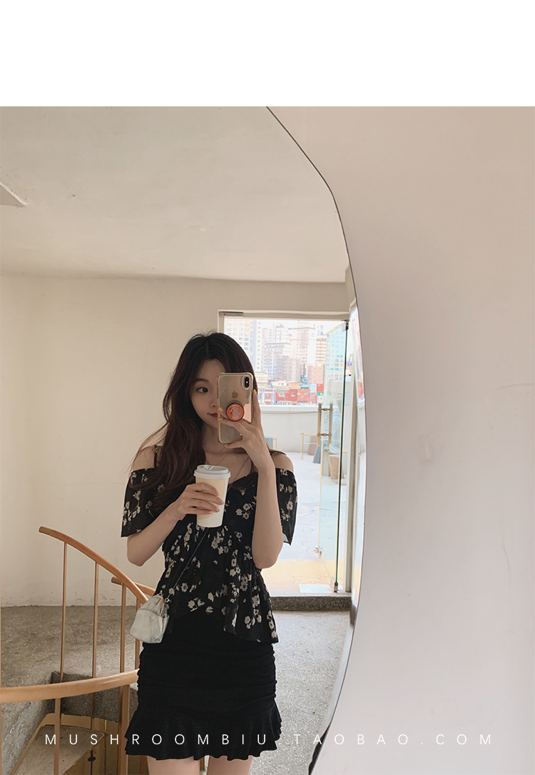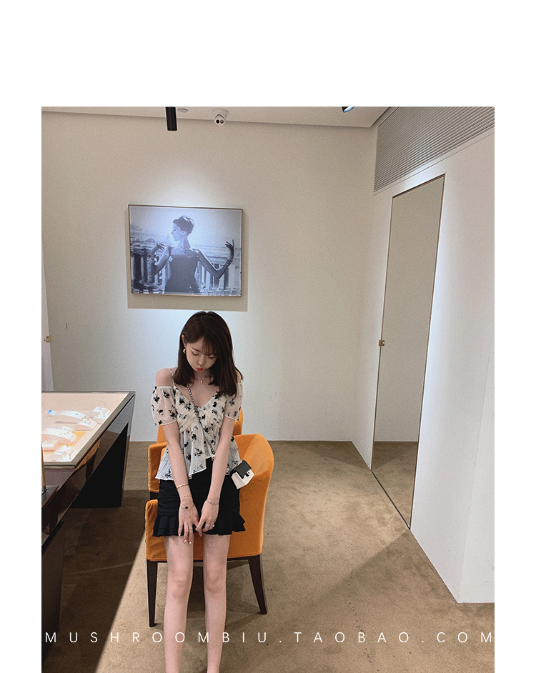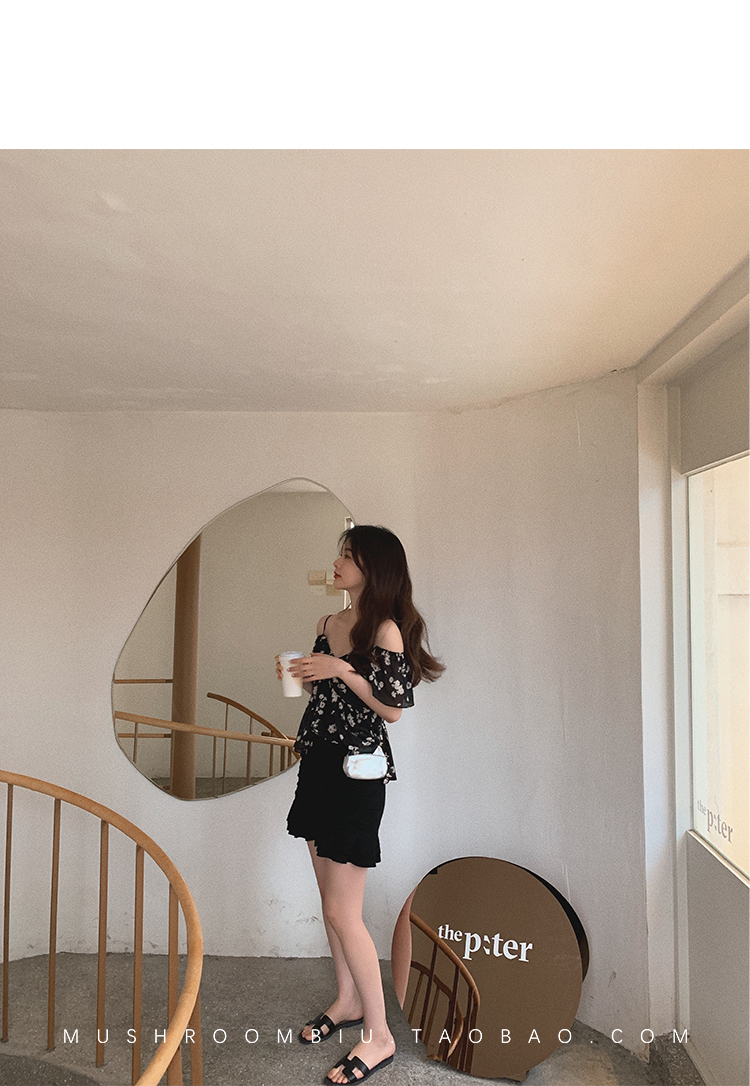 【金蘑菇菇 初恋50次】法式一字肩小心机露肩雪纺碎花上衣