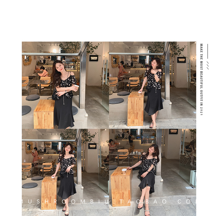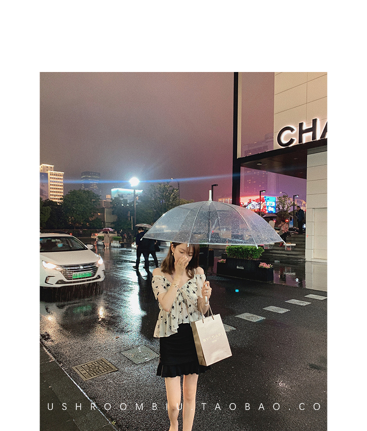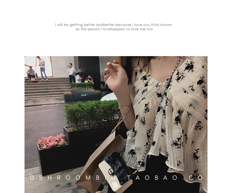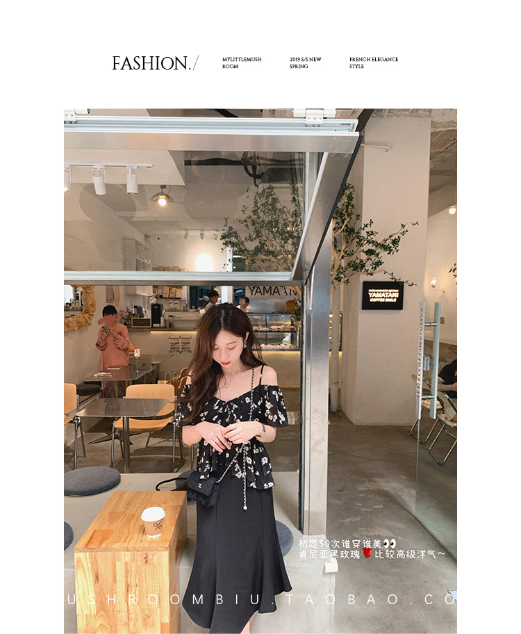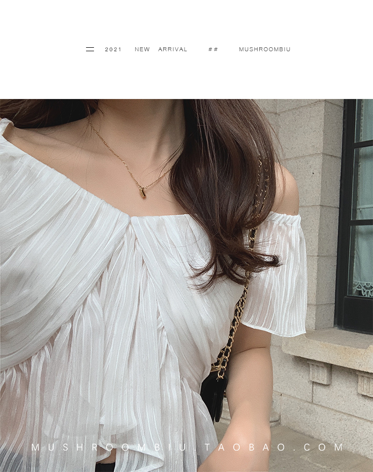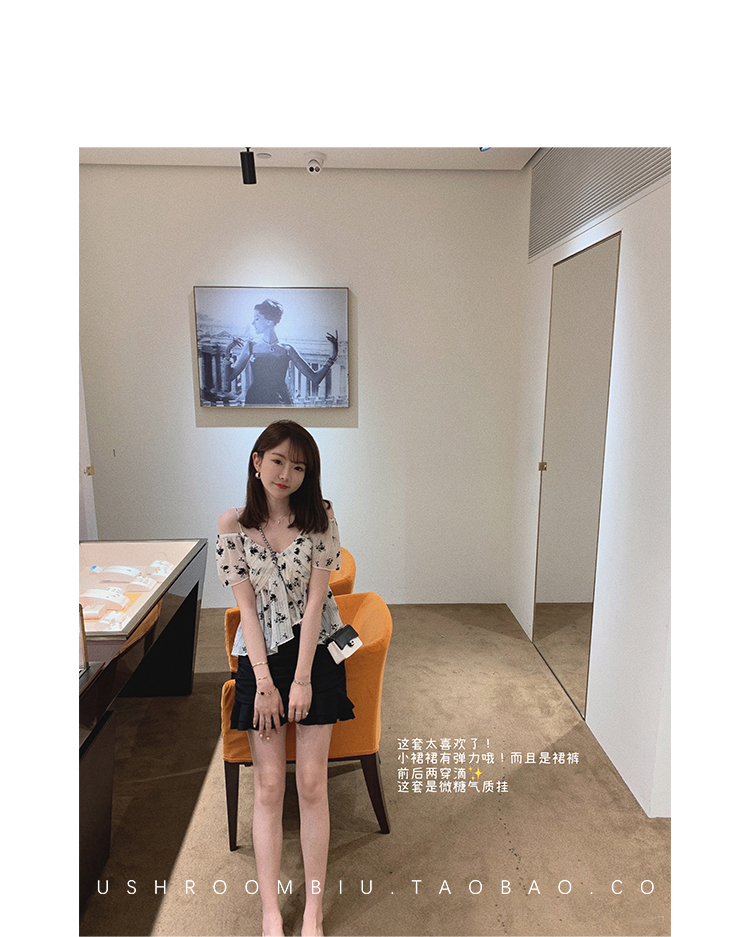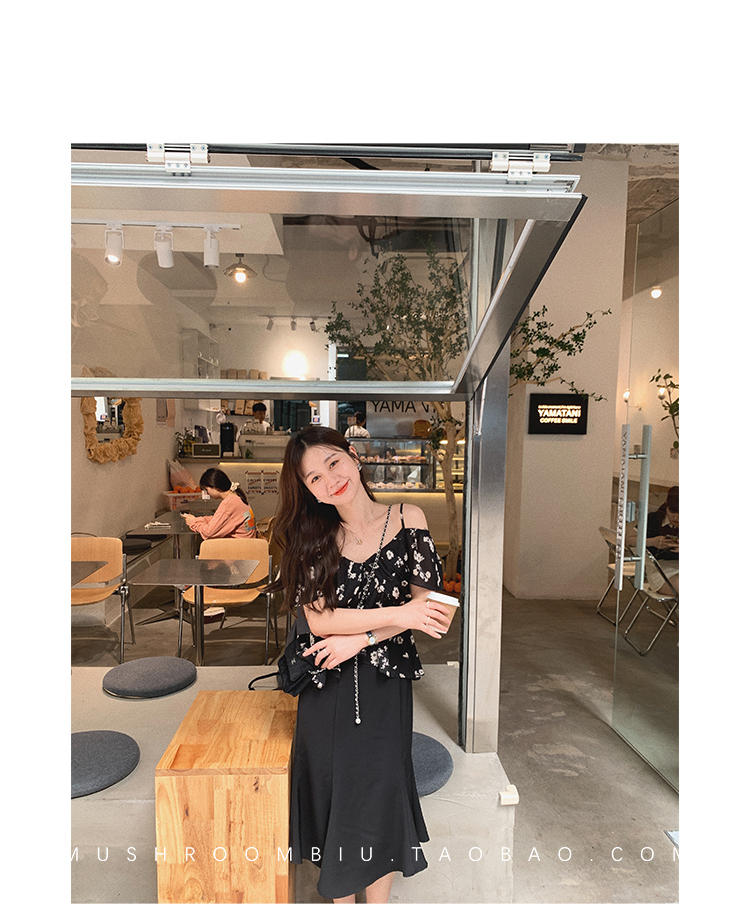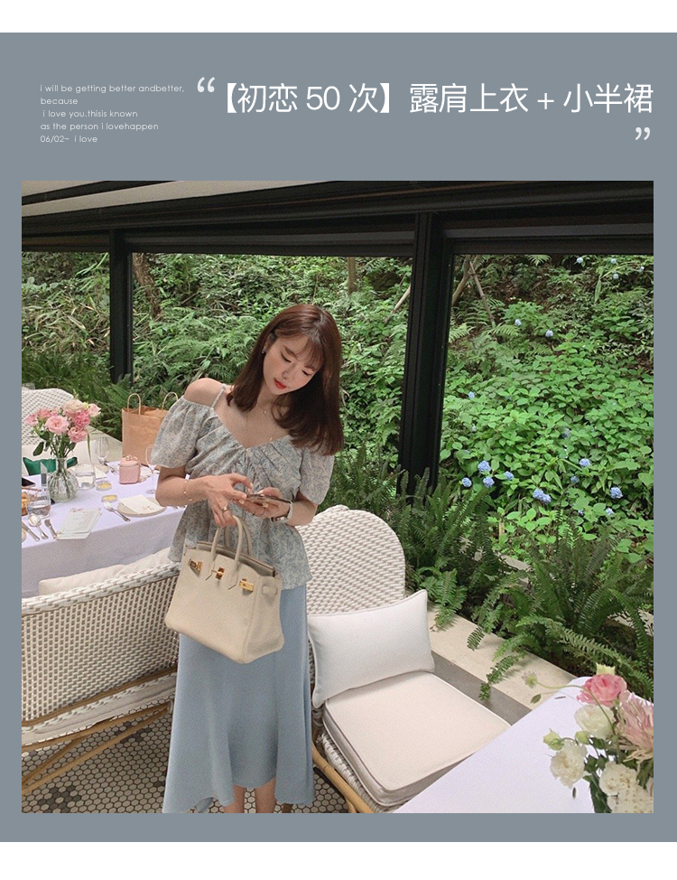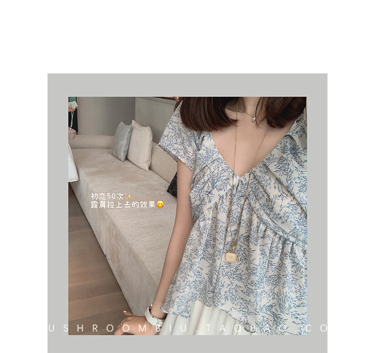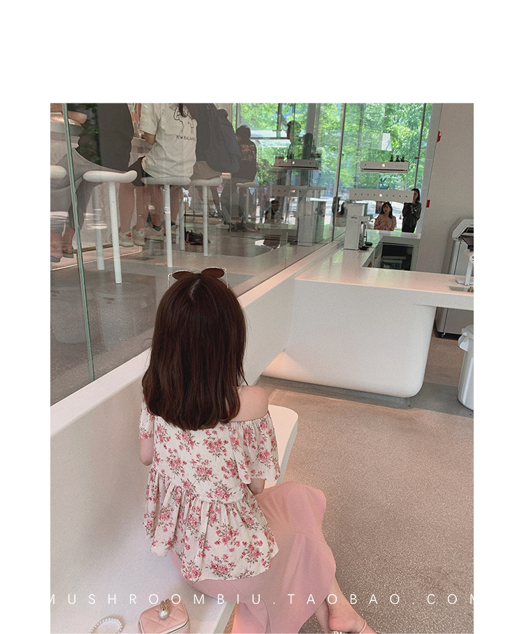 【金蘑菇菇 初恋50次】法式一字肩小心机露肩雪纺碎花上衣