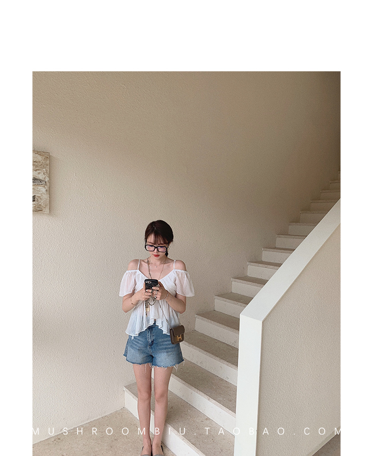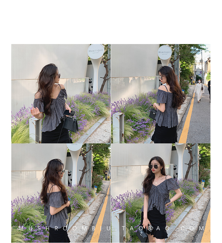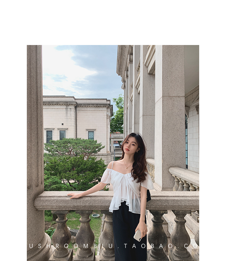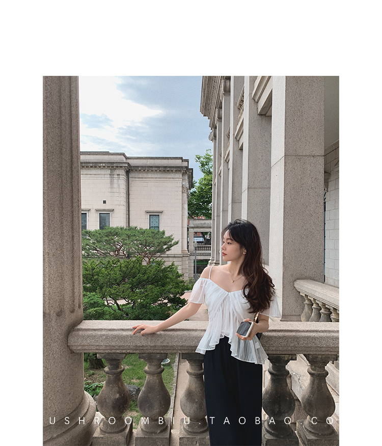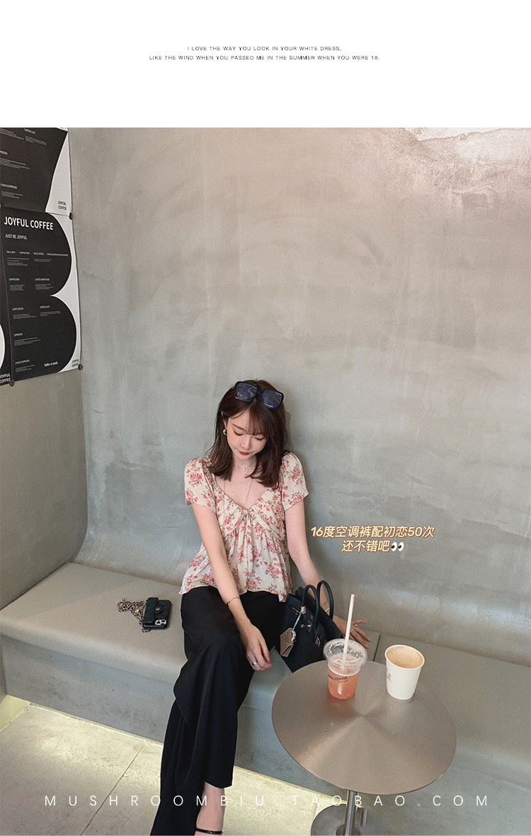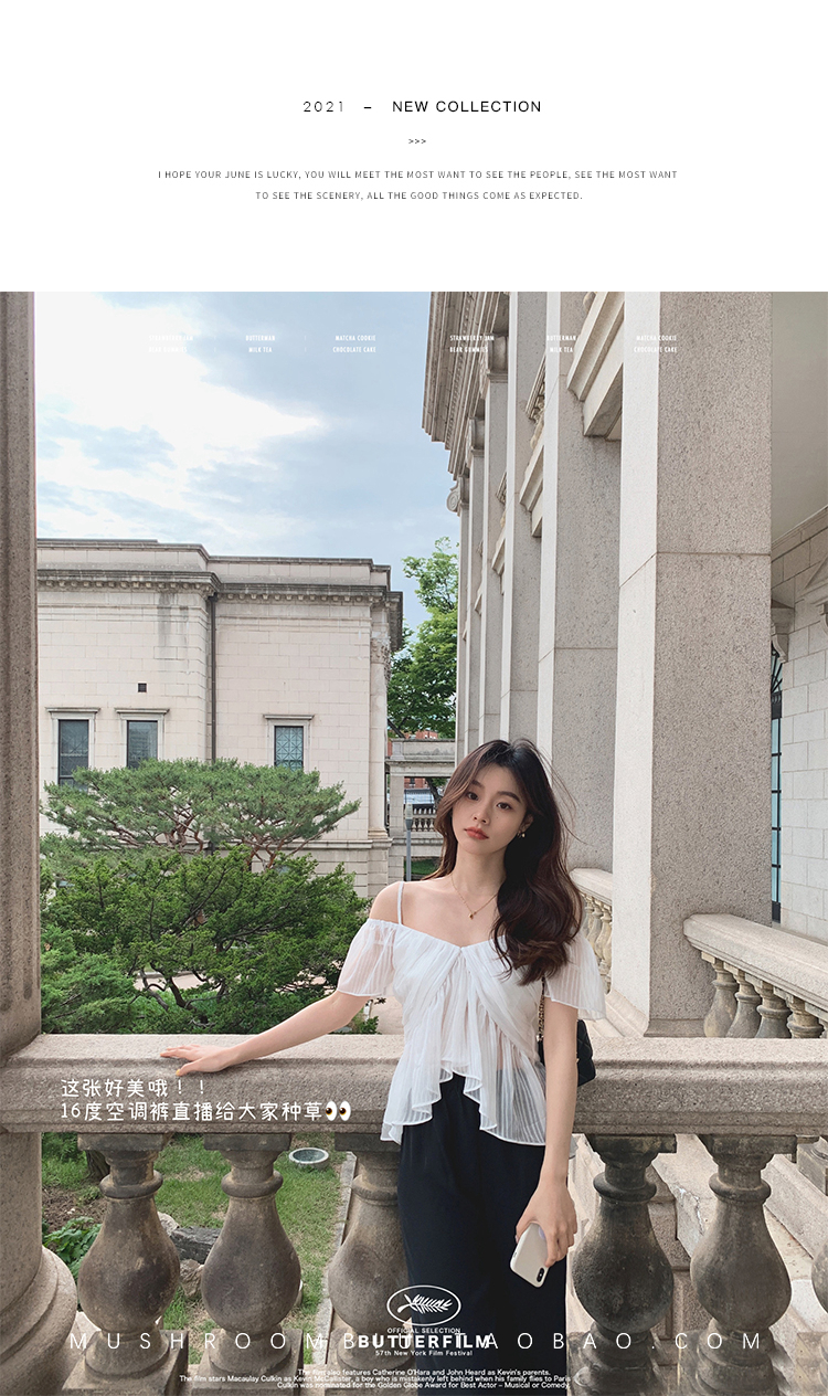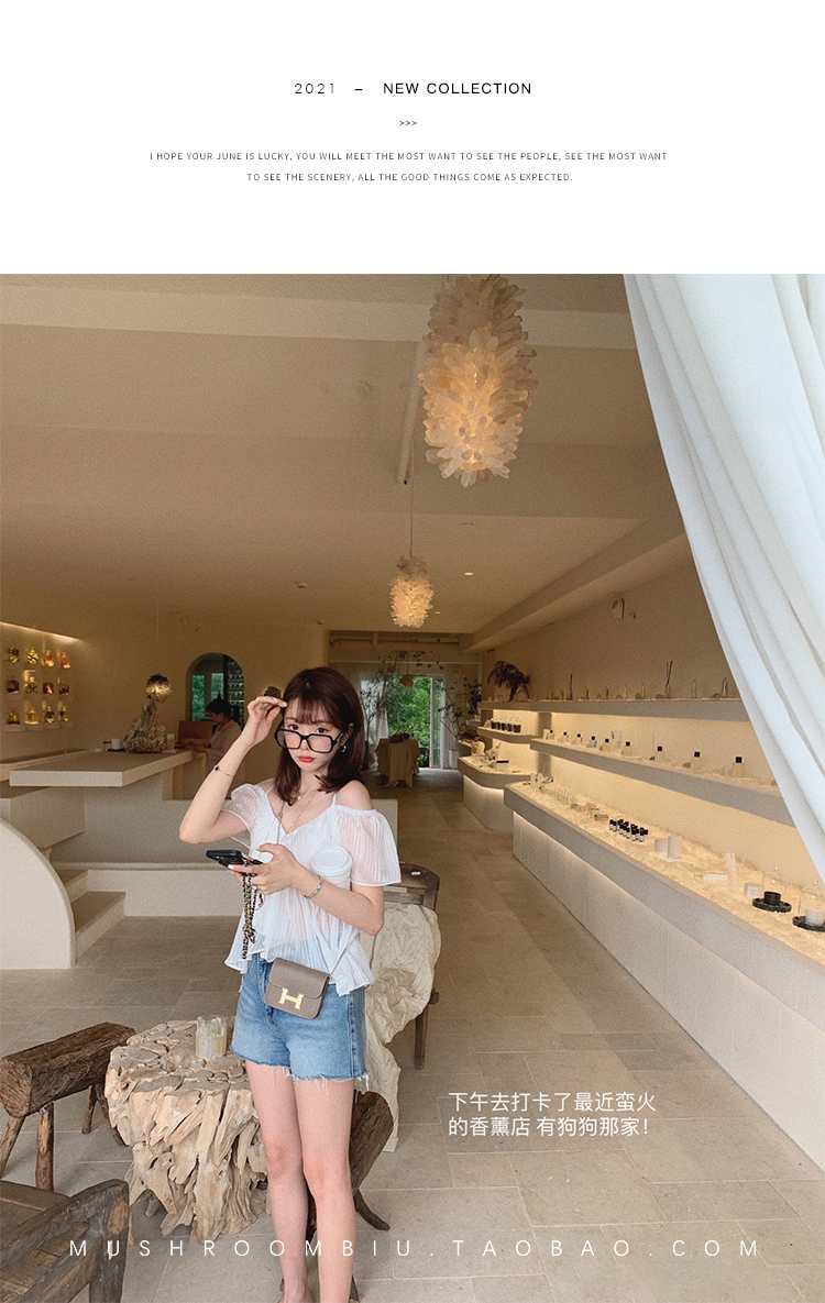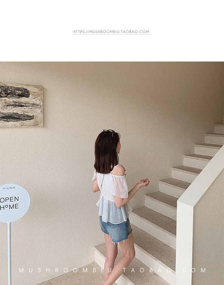 【金蘑菇菇 初恋50次】法式一字肩小心机露肩雪纺碎花上衣