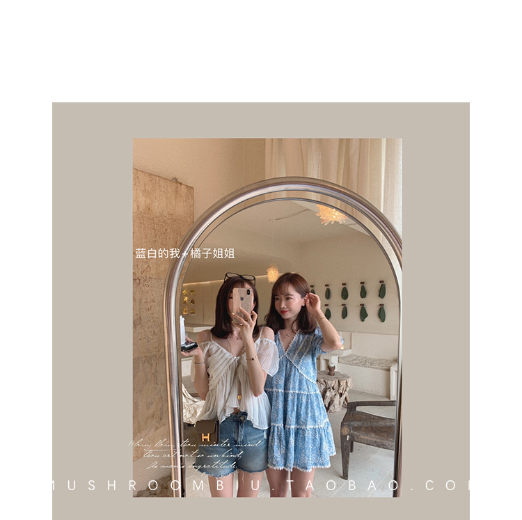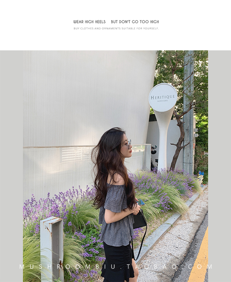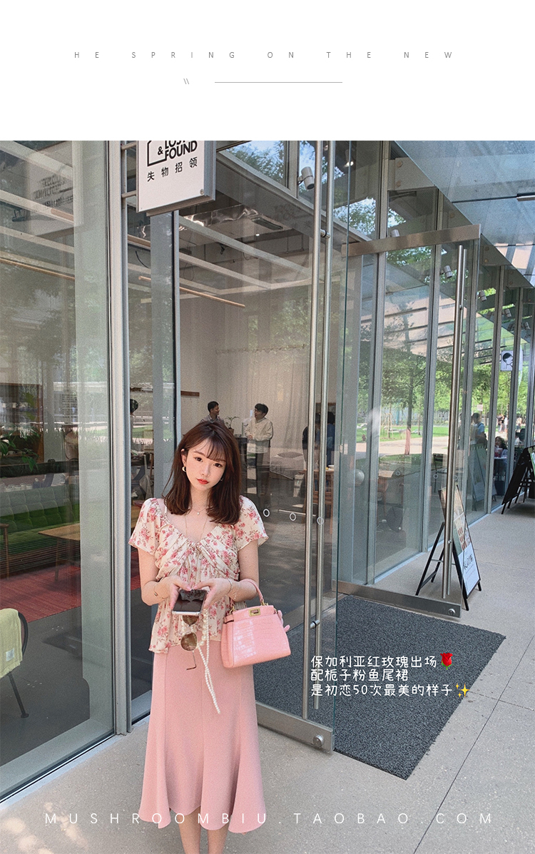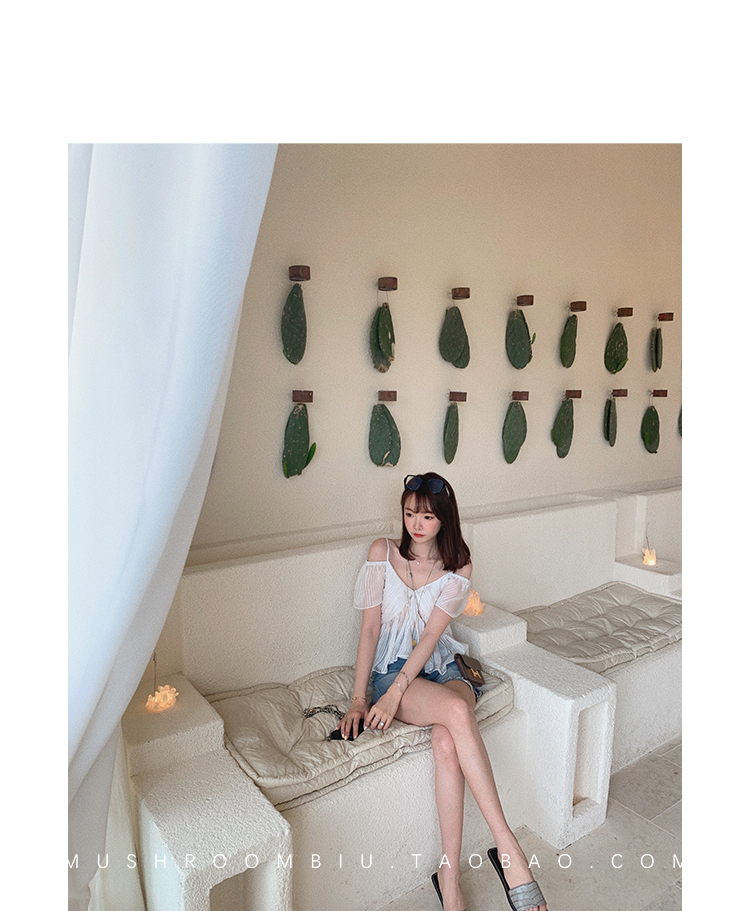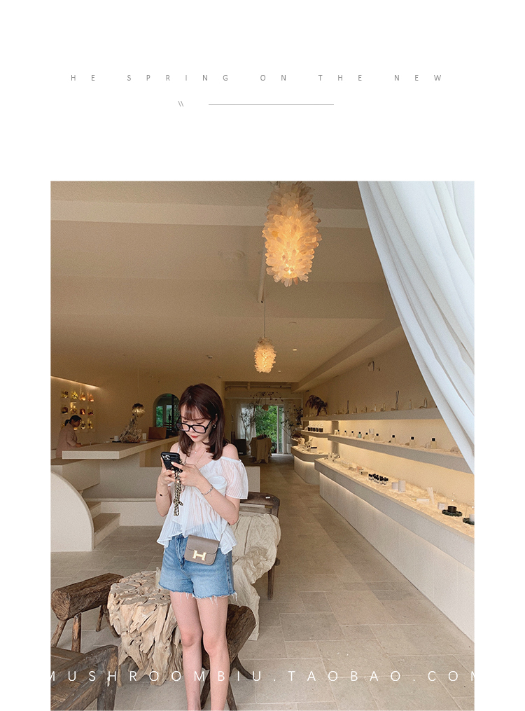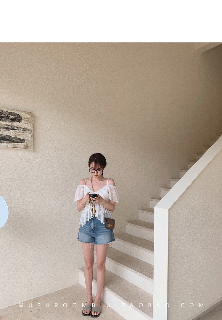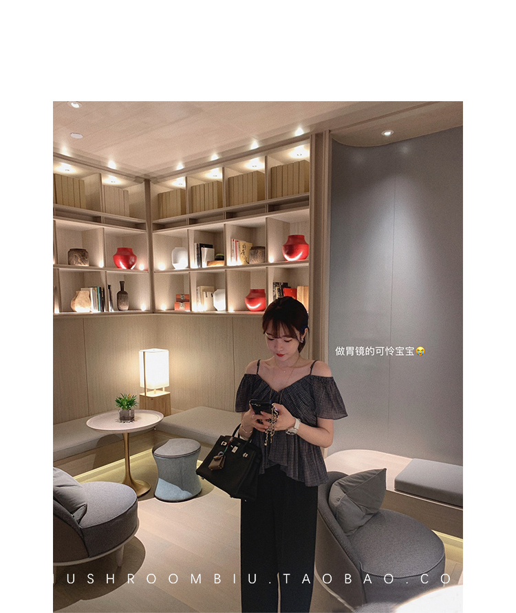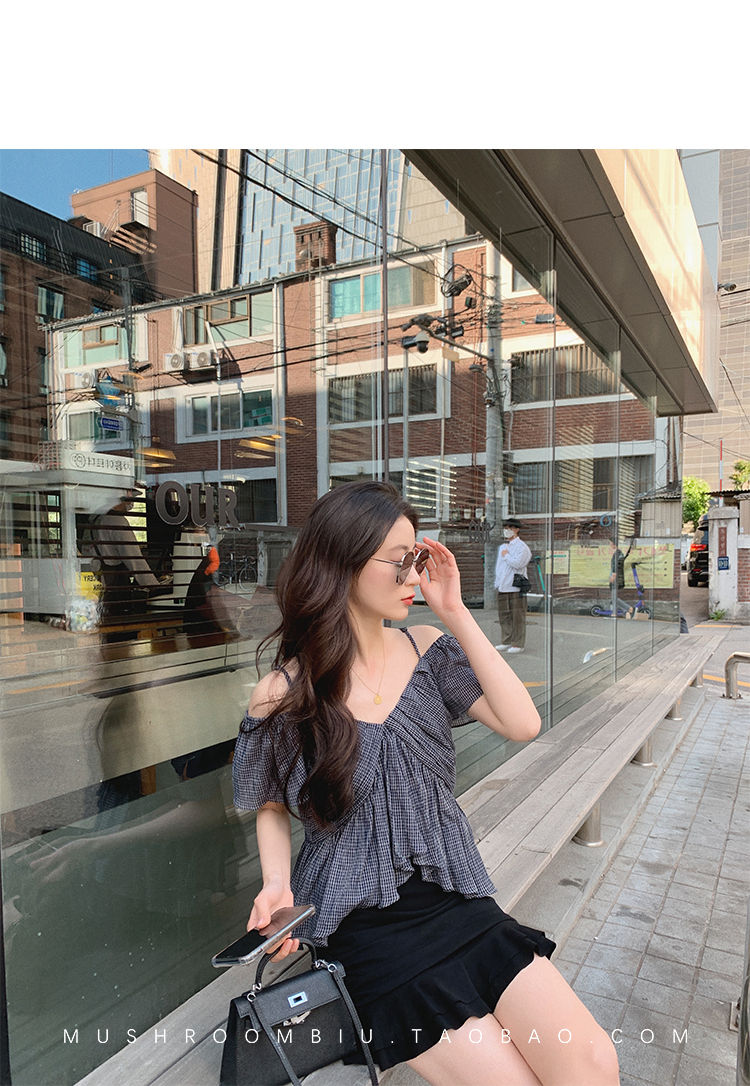【金蘑菇菇 初恋50次】法式一字肩小心机露肩雪纺碎花上衣