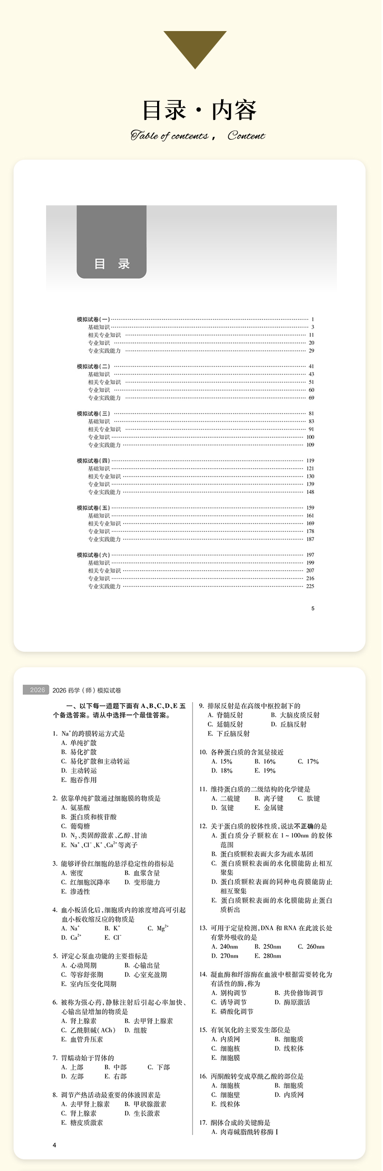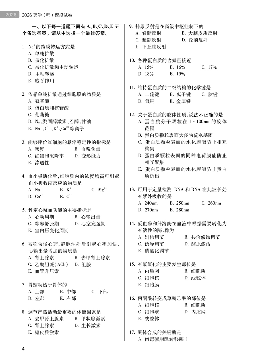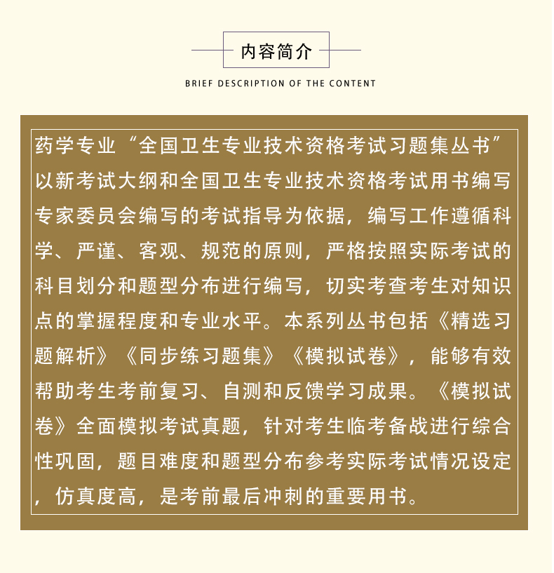 药学专业“全国卫生专业技术资格考试习题集丛书”以新考试大纲和全国卫生专业技术资格考试用书编写专家委员会编写的考试指导为依据,编写工作遵循科学、严谨、客观、规范的原则,严格按照实际考试的科目划分和题型分布进行编写,切实考查考生对知识点的掌握程度和专业水平。本系列丛书包括《精选习题解析》《同步练习题集》《模拟试卷》,能够有效帮助考生考前复习、自测和反馈学习成果。《模拟试卷》全面模拟考试真题,针对考生临考备战进行综合性巩固,题目难度和题型分布参考实际考试情况设定,仿真度高,是考前最后冲刺的重要用书。