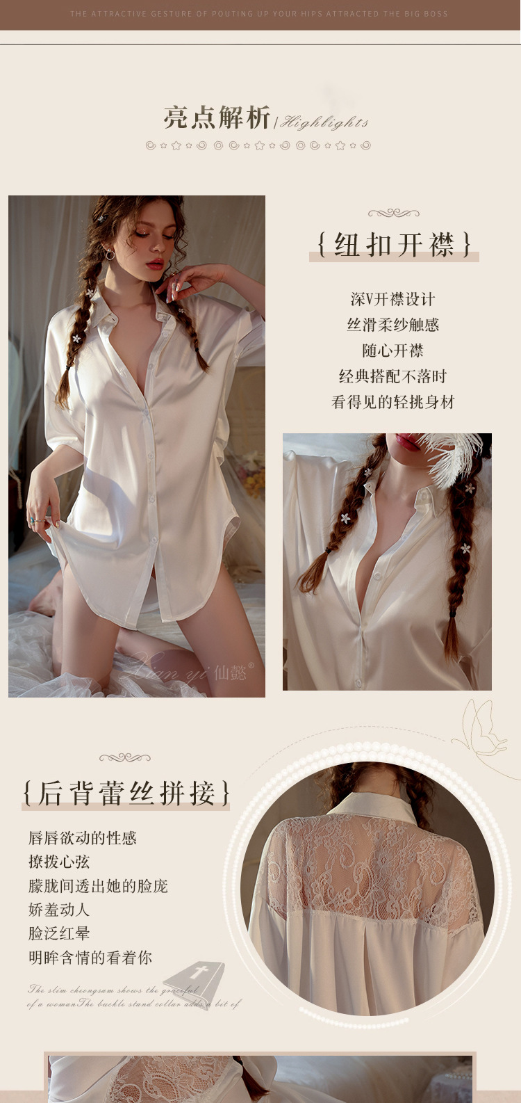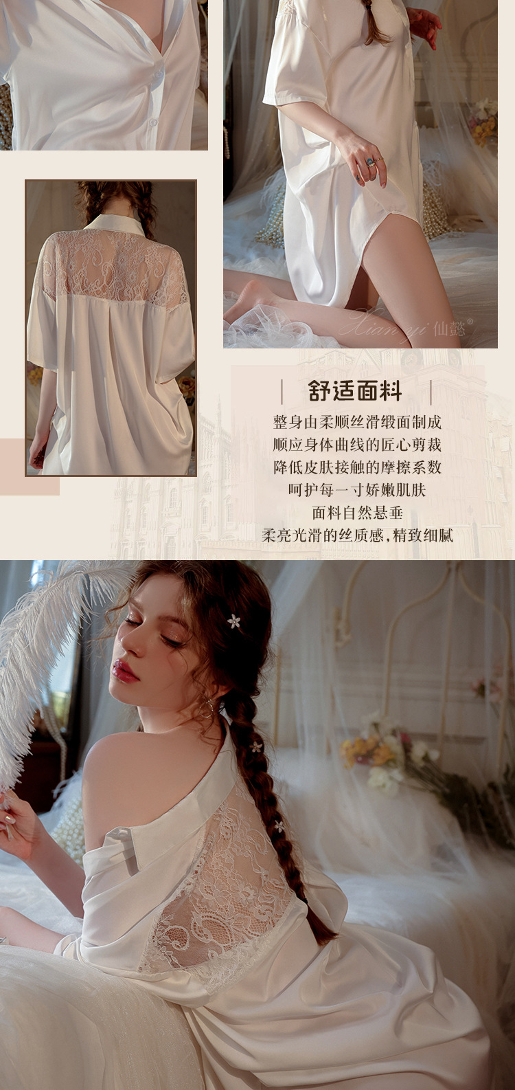 【蕾丝拼接衬衫裙】仙懿夏季男友风衬衫睡衣女宽松短袖性感睡裙冰丝家居服可外穿,深V开襟设计,丝滑柔纱触感。ry