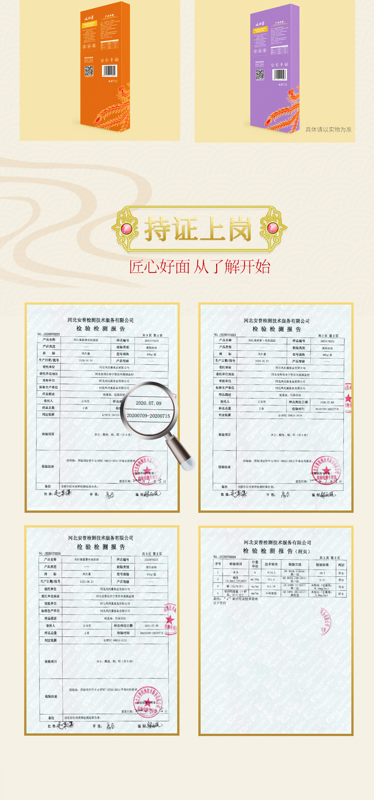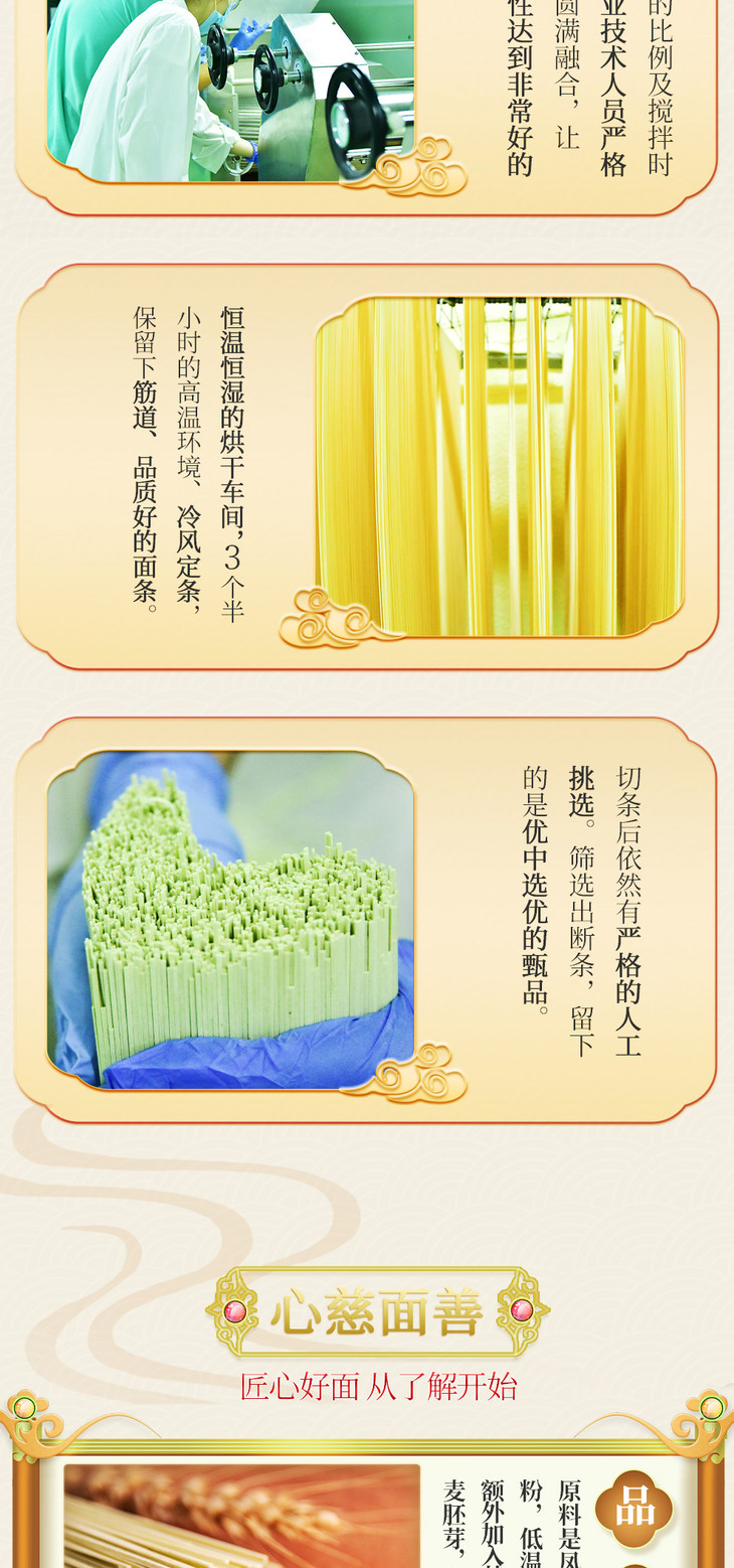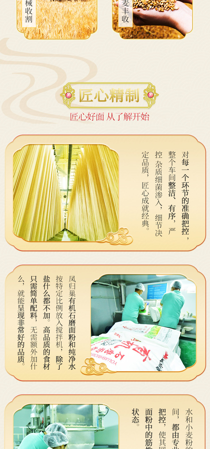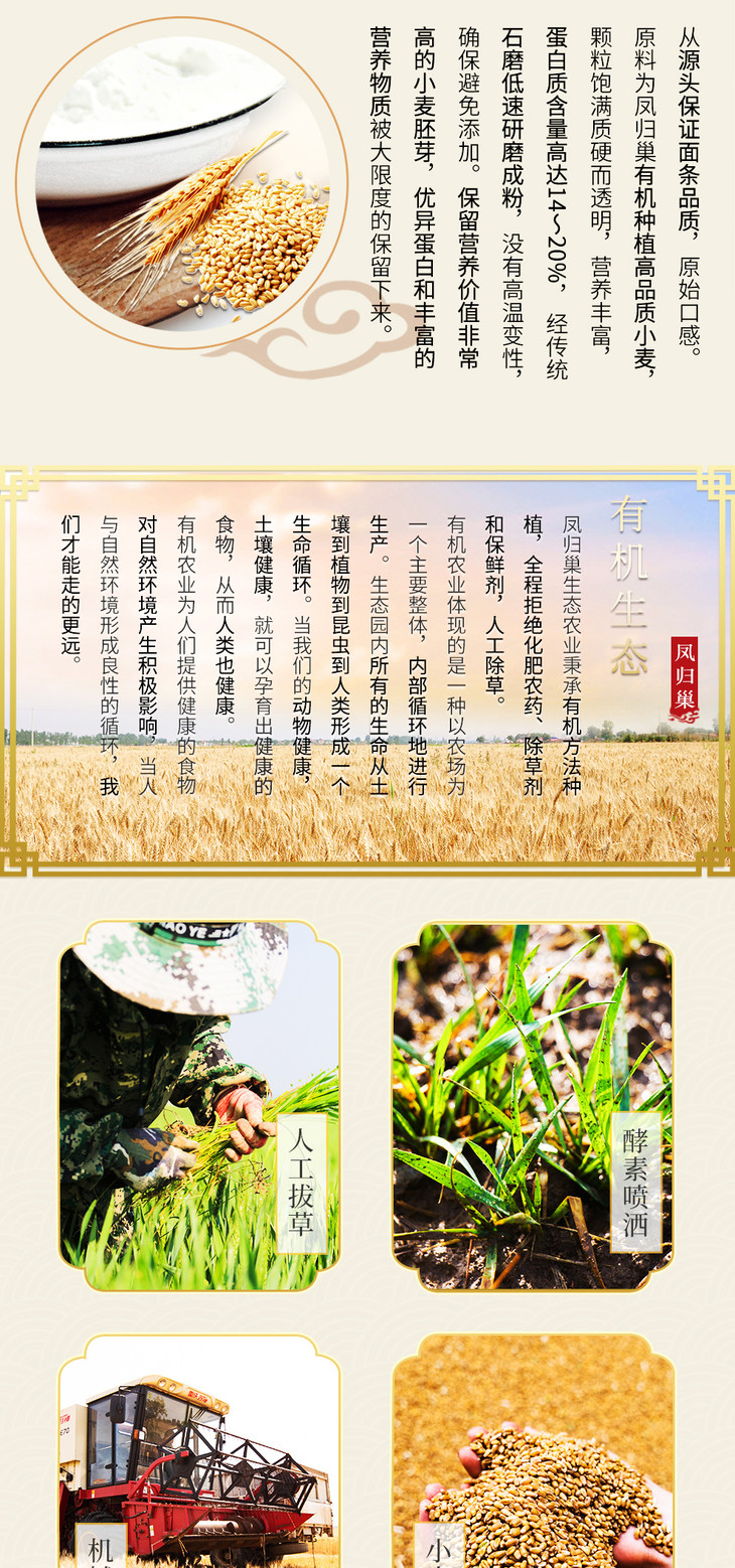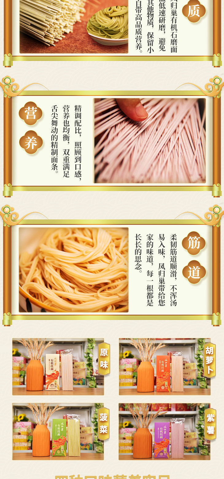 原材料选自凤归巢农场有机小麦,经低温低速研磨的有机石磨面粉制作而成,完整的保留了小麦胚芽。有机石磨面粉的蛋白质含量高达14-20%。有机石磨面粉和纯净水、蔬菜粉汁按比例调配,除了盐,无额外添加。采用恒温恒湿烘干,3个半小时的高温环境后冷风定条,面条更劲道,切条后严格筛选为您呈现高品质面条。