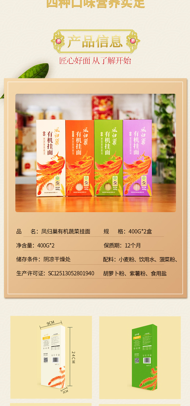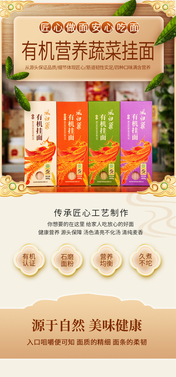 营养有机面粉与蔬菜汁精调配比,不仅营养丰富还柔韧劲道顺滑,不混汤易入味带给您家的味道。
