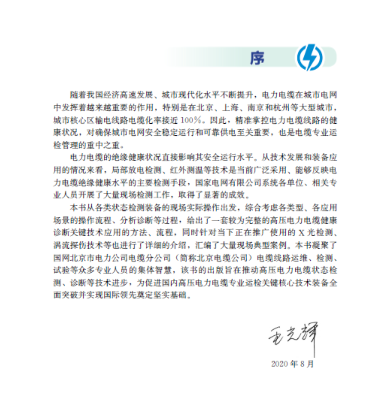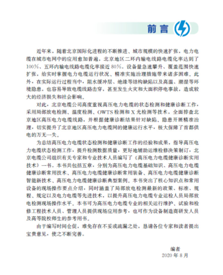 为总结高压电力电缆状态检测和健康诊断工作的经验和成果,指导高压电力电缆状态检测工作,提升检测数据质量,更好地辅助运维检修决策制订,国网北京市电力公司电缆分公司组织有关专家和专业技术人员编写了《高压电力电缆健康诊断实用技术》一书。