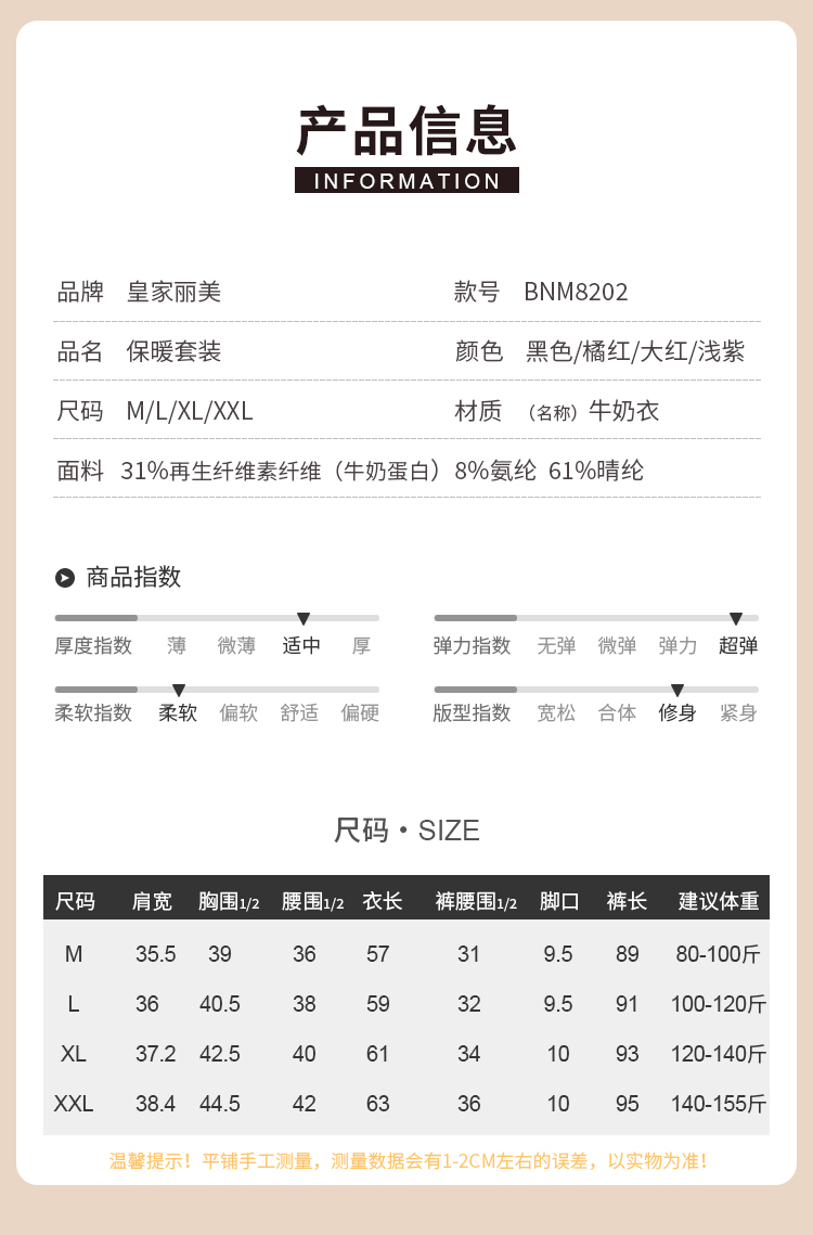 皇家丽美保暖牛奶衣男女套装打底薄款秋衣秋裤女士套装冬季BNM8202