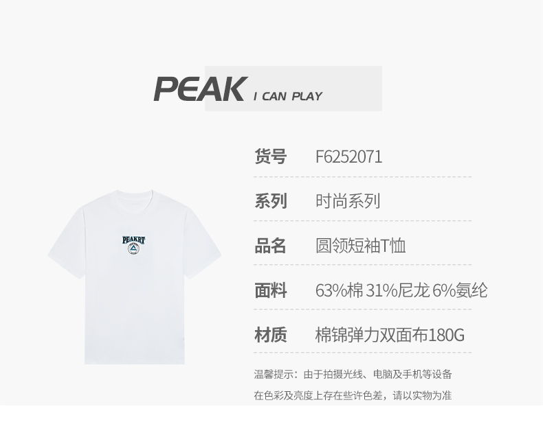 匹克2025年新款时尚系列男款圆领短袖T恤F6252071