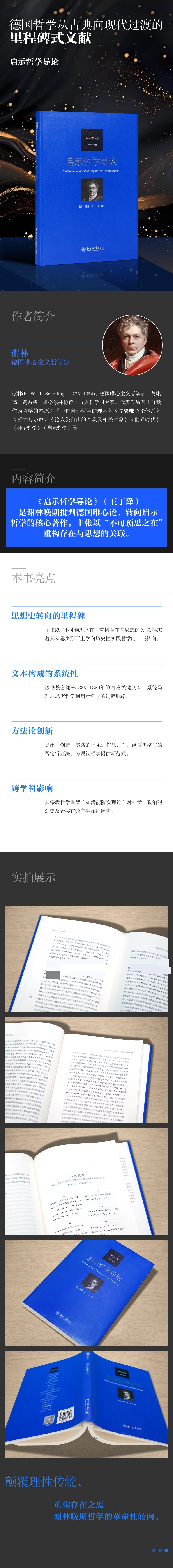 《启示哲学导论》(1842—1843)为谢林晚期哲学的代表性作品。谢林晚期哲学十分重要的贡献在于区分 “肯定哲学”和“否定哲学”。通过对整个近代理性进行批判式的范围划定,考察其历史性处境和效用,谢林尝试为理性重新赋予合法性,极力克服形而上学自开端以来就包含在自身中、并在近代哲学中达至顶点的虚无主义倾向,从而通过回溯哲学的开端来拯救哲学自身。 本书的另外三个文本《对肯定哲学本原的另一种演绎》(1839)、《柏林首讲》(1841)、《论永恒真理的源泉》(1850)与《启示哲学导论》共同构成进入谢林晚期“启示哲学”的通道,并刻画其晚期的基本论题和思想剖面。从思想史层面来看,谢林的晚期哲学更起到从德国古典哲学向19世纪中晚期哲学、甚至20世纪哲学的过渡作用。