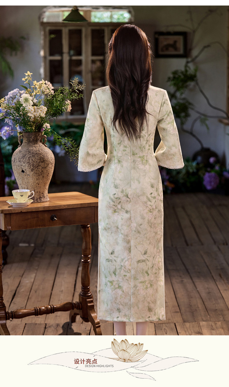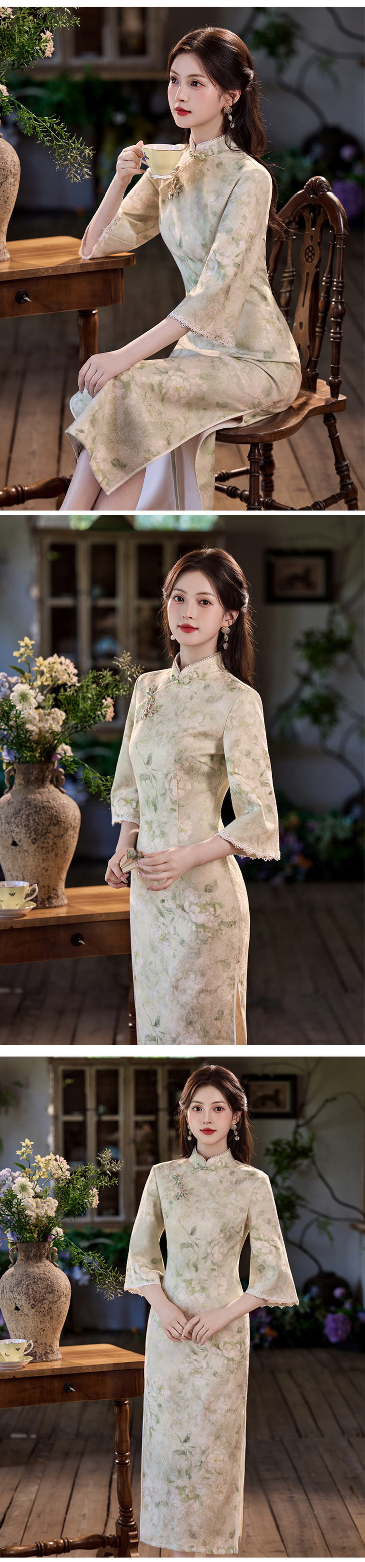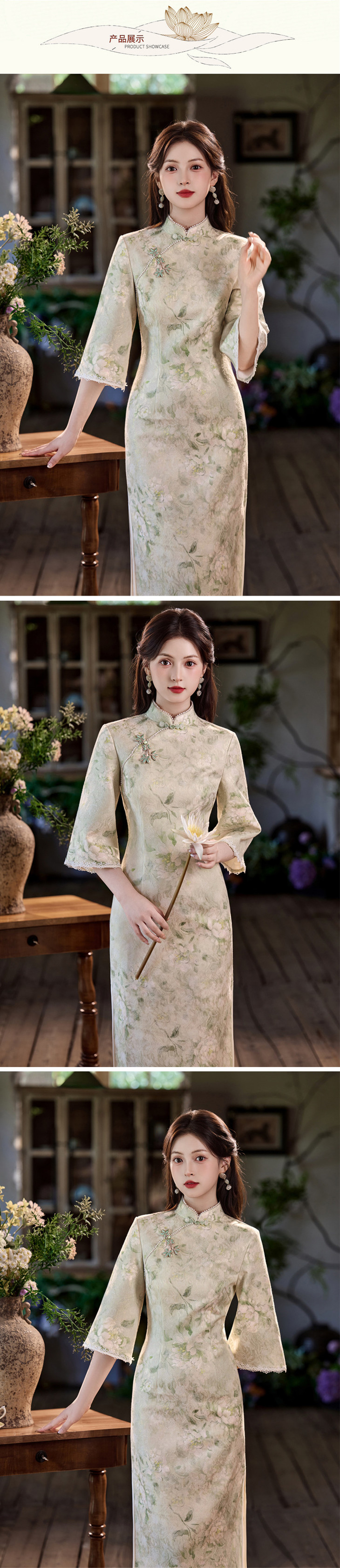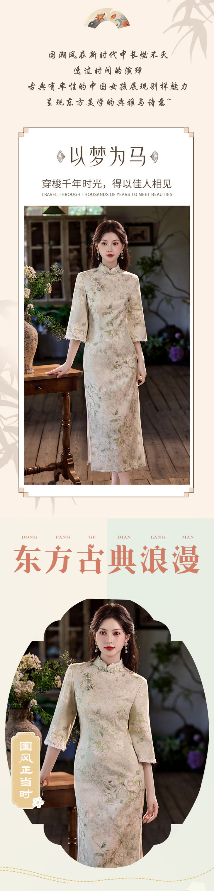 鎏金银珠缎倒大袖中长款旗袍,浅绿色国风新中式长旗袍SJT-861
