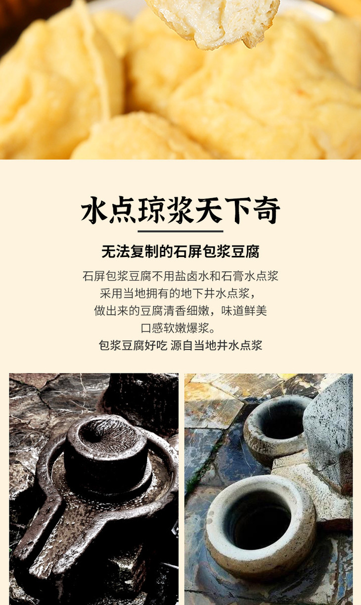 【产品特点】包浆豆腐运输中会自然发酵,快递运到请尽快签收冷藏,长时间不签收会存在发酵变成臭豆腐的问题,这个是正常发酵现象,不是坏了,可以正常食用,介意者慎拍!