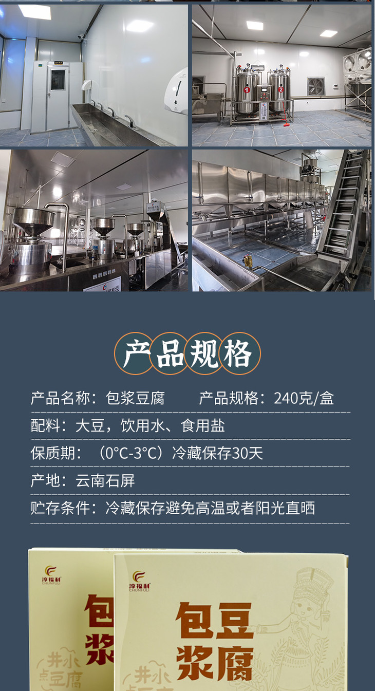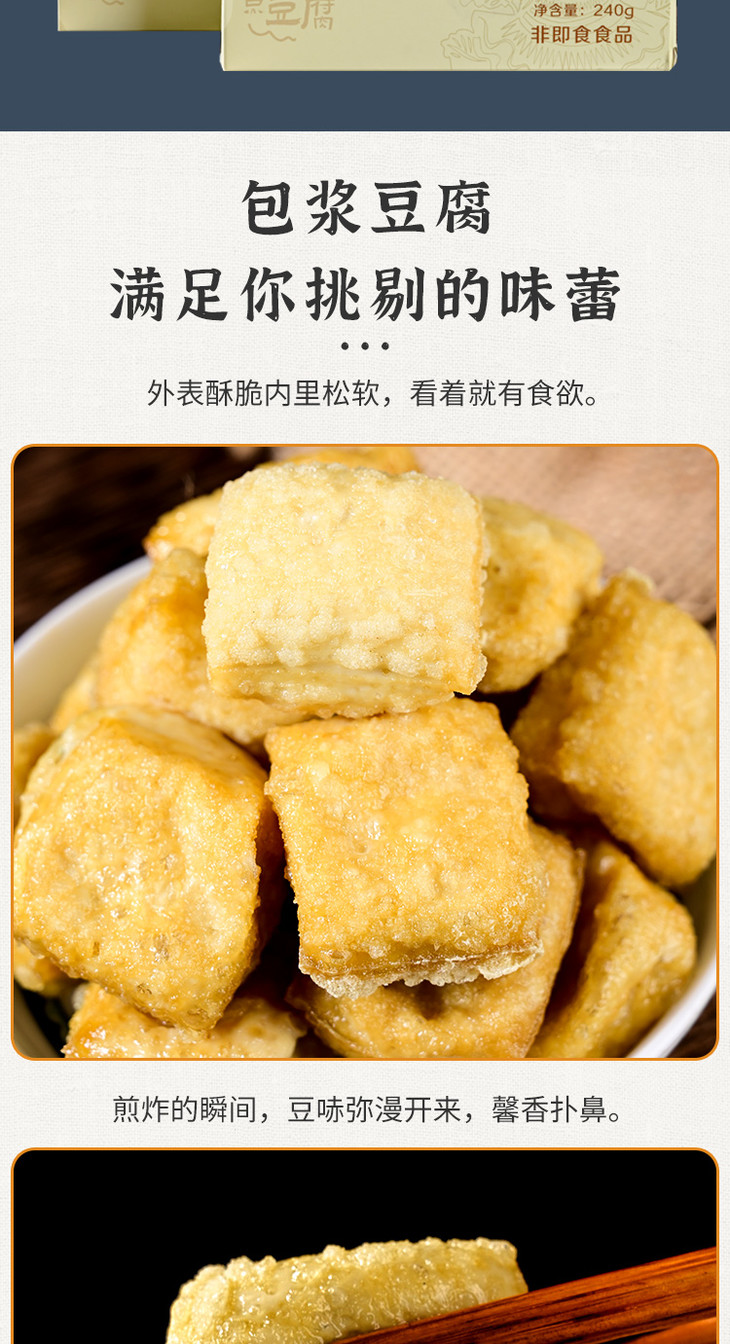 【产品规格】包浆豆腐300g*1盒(28~30个/盒);包浆豆腐520g*2盒(46~48个/盒);包浆豆腐520g*3盒(46~48个/盒)