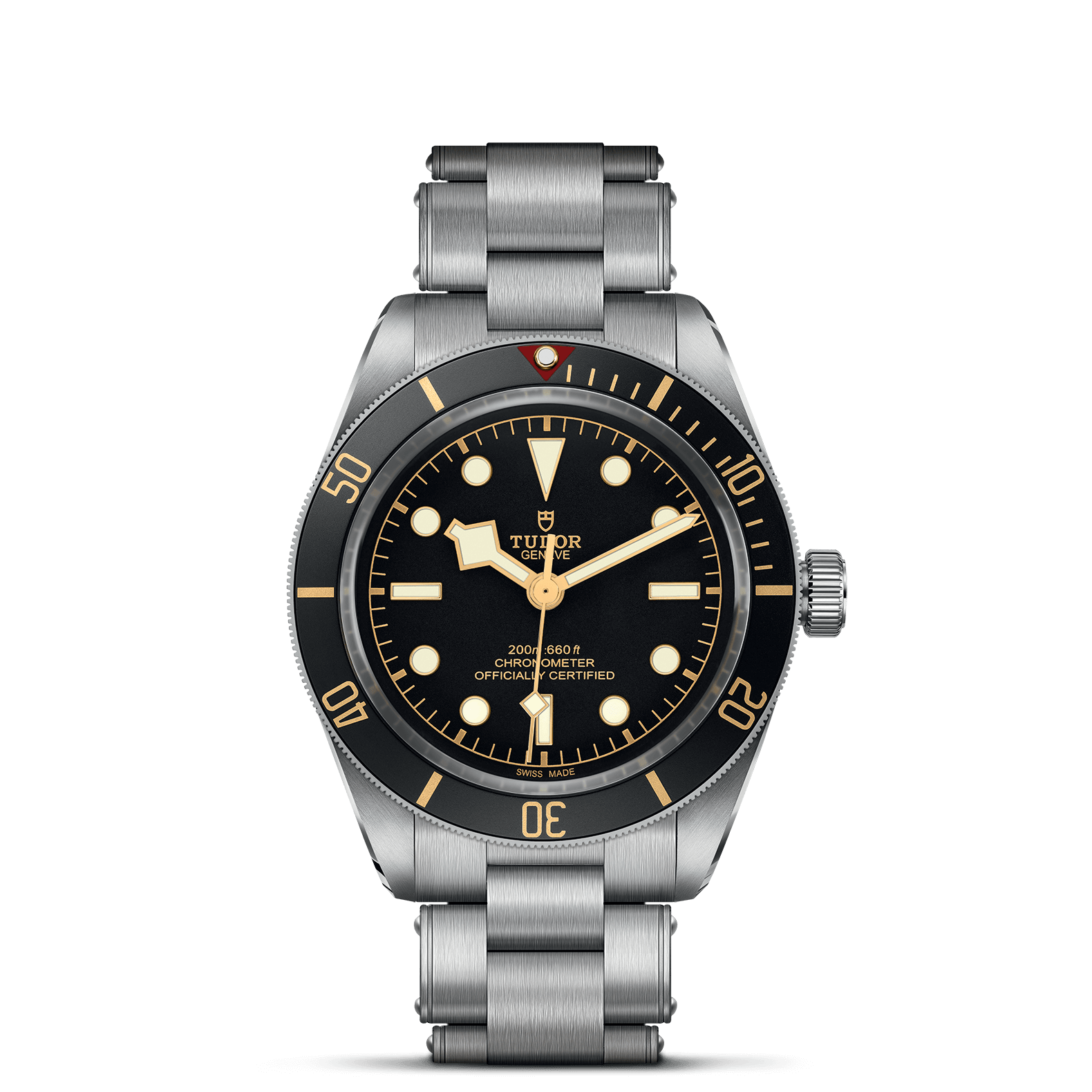 不锈钢旋入式上链表冠,饰以浮雕帝舵表玫瑰标志,配圆纹磨砂钢上链表冠轴