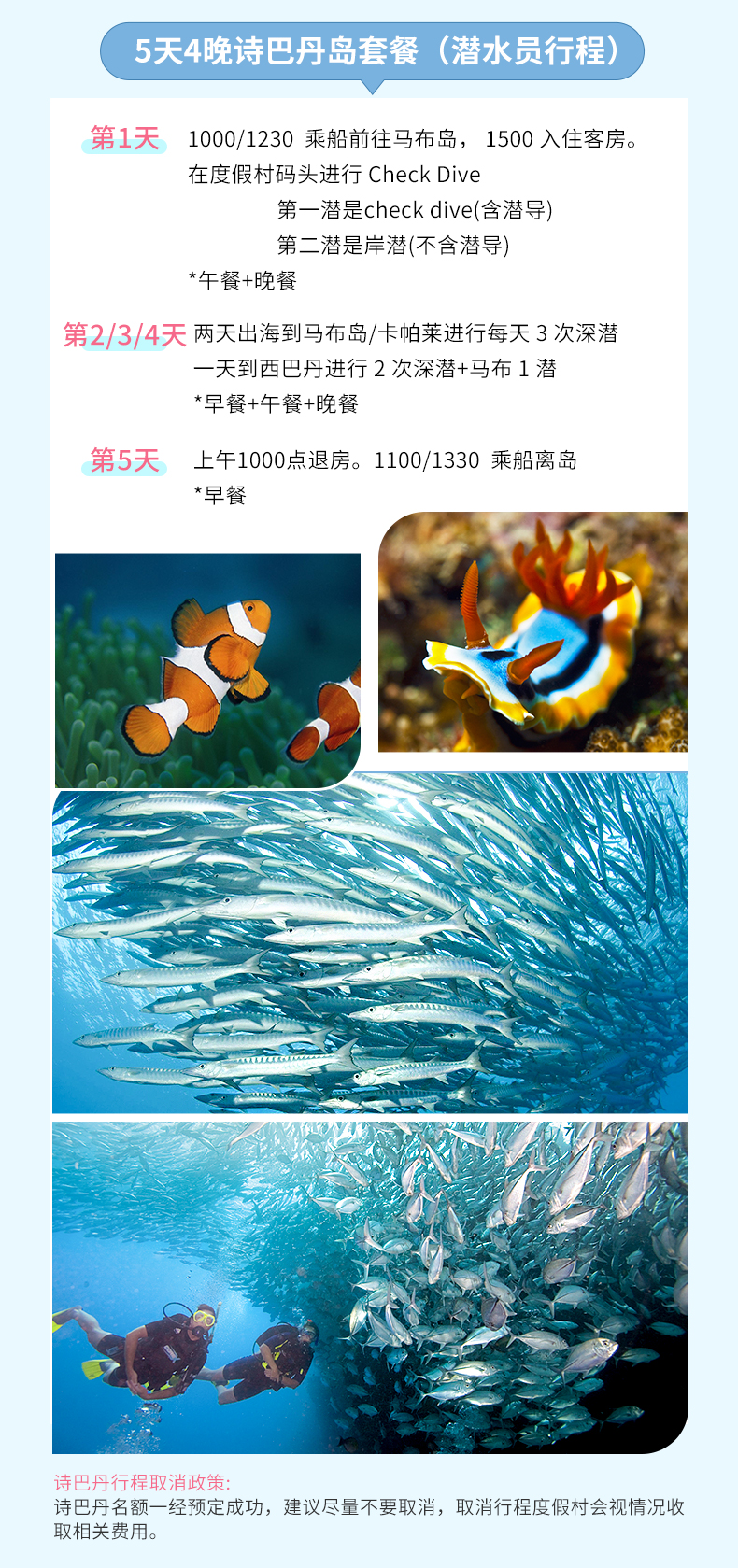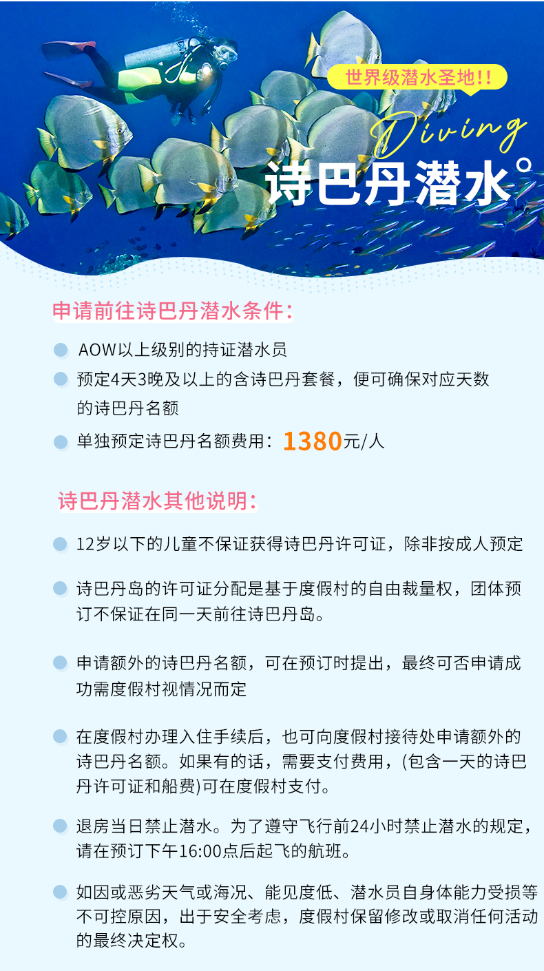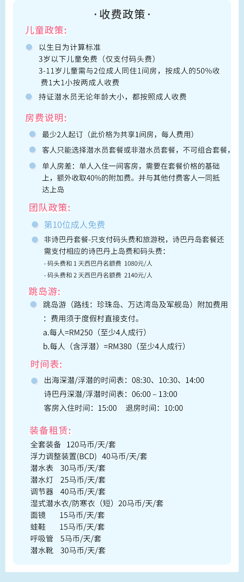 2. 特殊人群的说明:基于仙本那3个特点:(1)由于海岛需要乘快艇前往,快艇颠簸;(2)仙本那医疗设施落后,岛上没有任何医疗设施,镇上的也只有小诊所没有大医院;(3)仙本那施行宵禁晚上18点至早上6点,海上禁止任何船只出行。因此仙本那不适宜65岁以上老人、孕妇、骨质疏松、高血压、贫血、糖尿病、慢性肺病、严重心脑血管疾病、气喘病、过敏体质等及其他不适宜人员前往。一切以安全为先,如执意出海,发生意外后果自负。任何不适合搭乘快艇的人员暂不接待;如执意报名,请提供3个月内的体检证明且签署风险告知书;